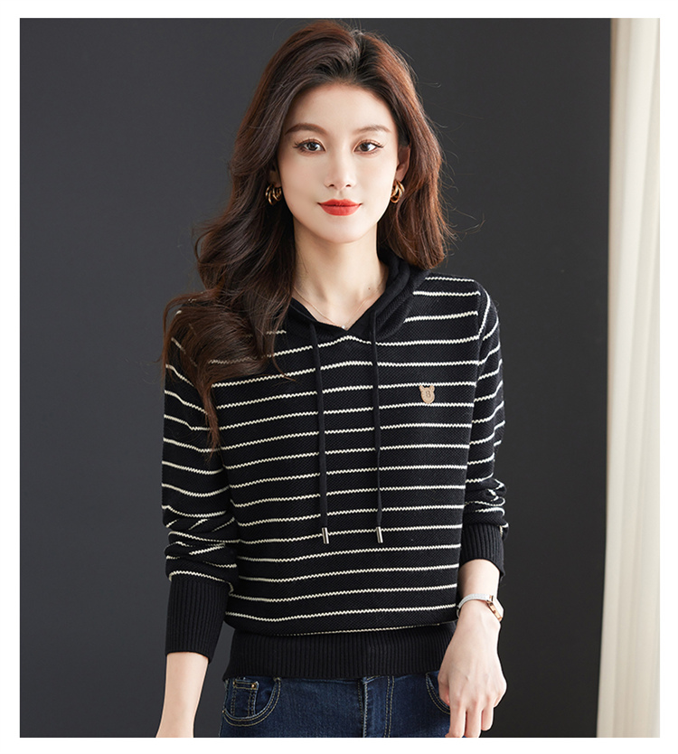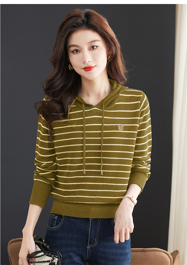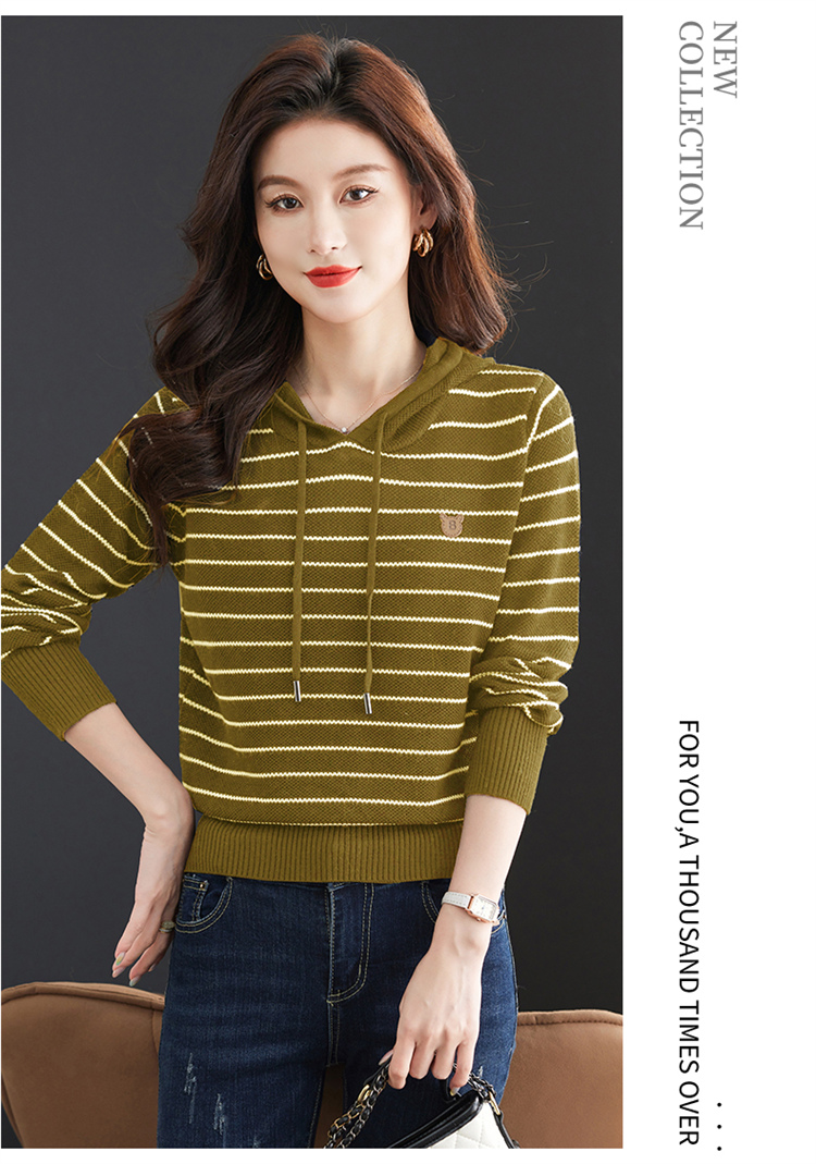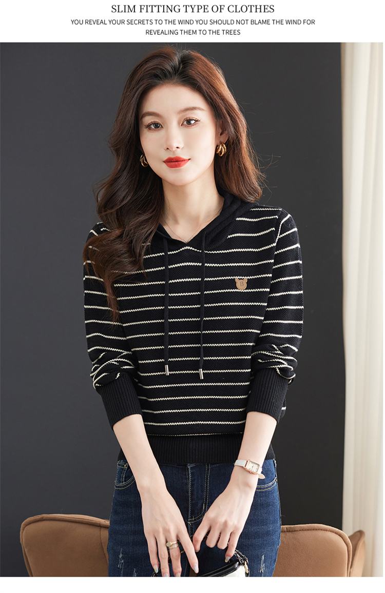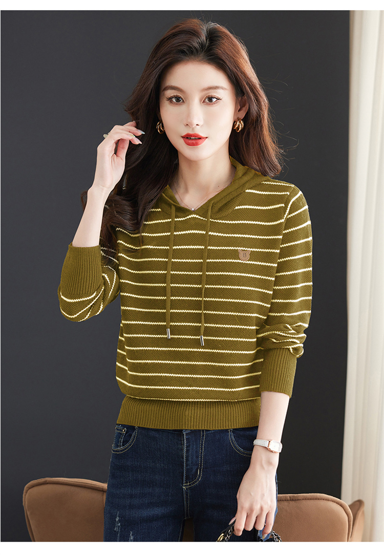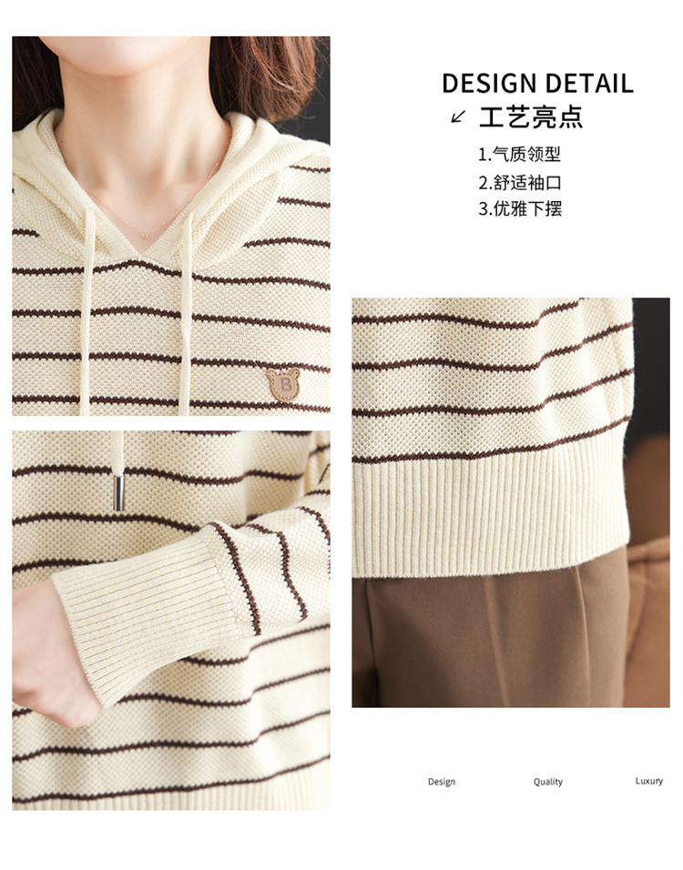 恒源祥連帽羊毛衫女薄款衛衣秋季新款條紋針織打底衫短款帶帽上衣