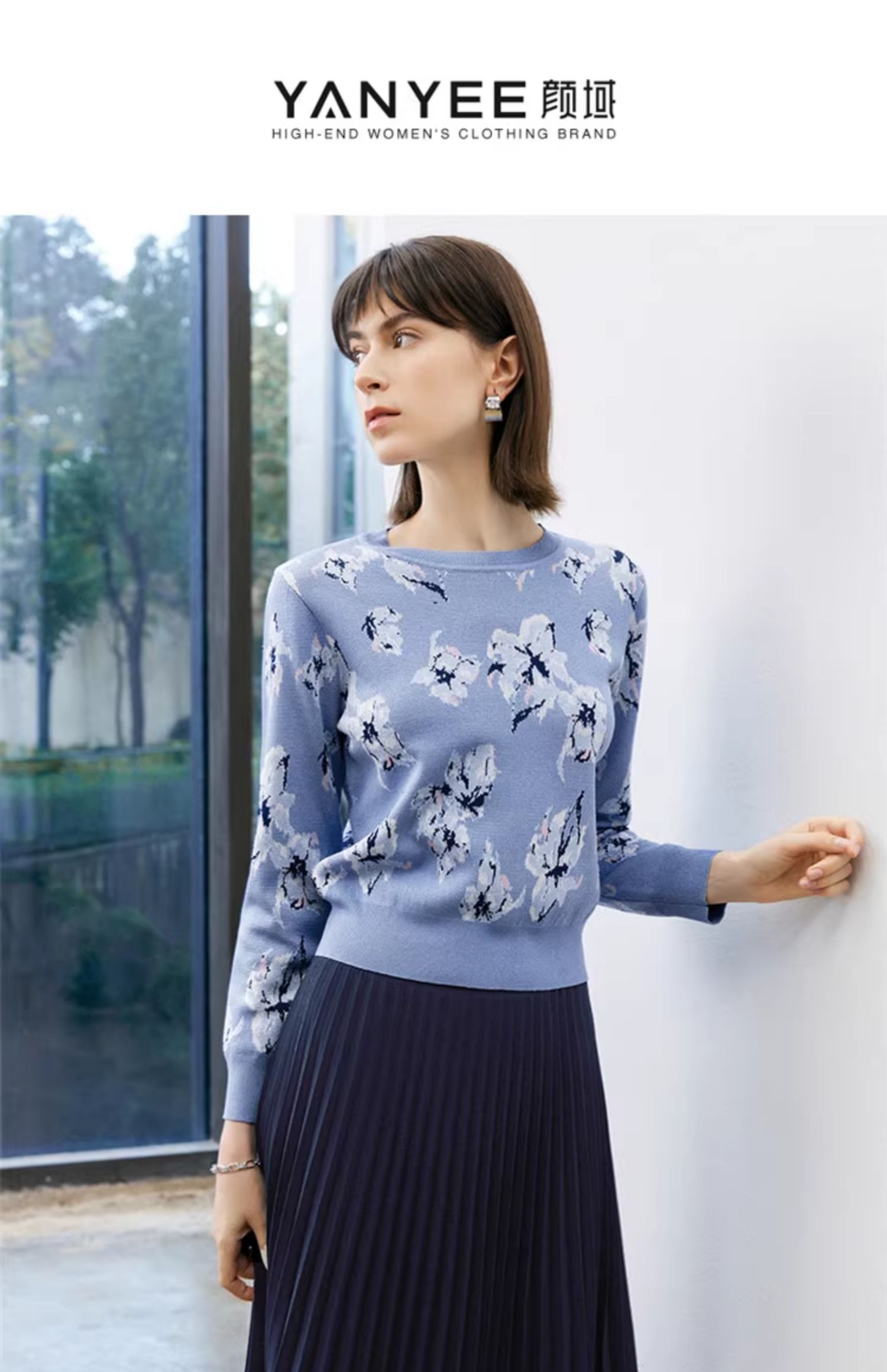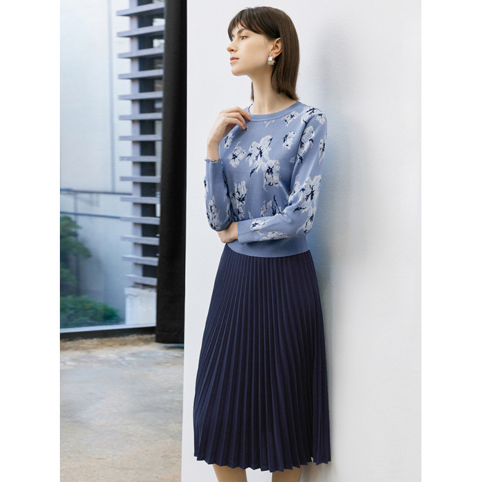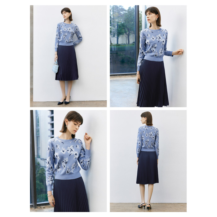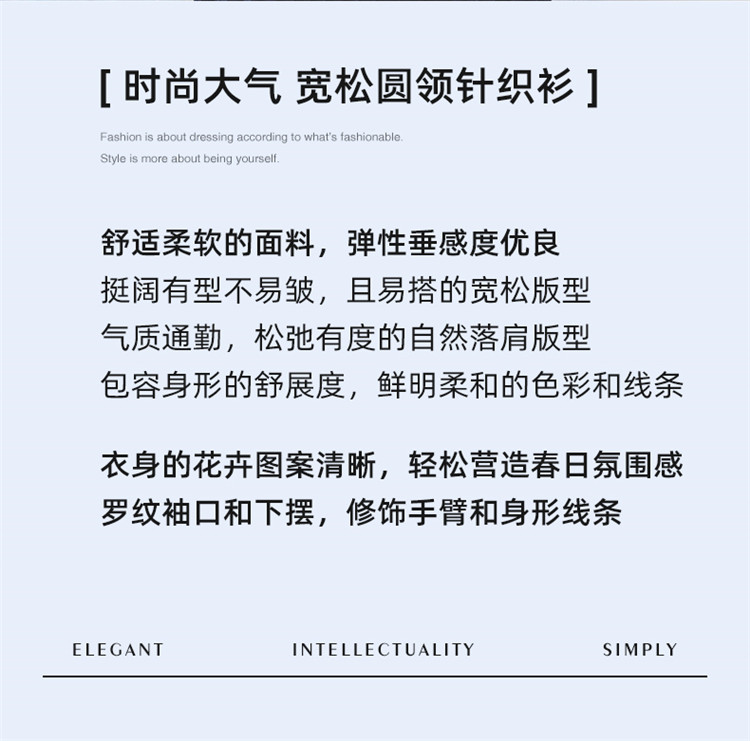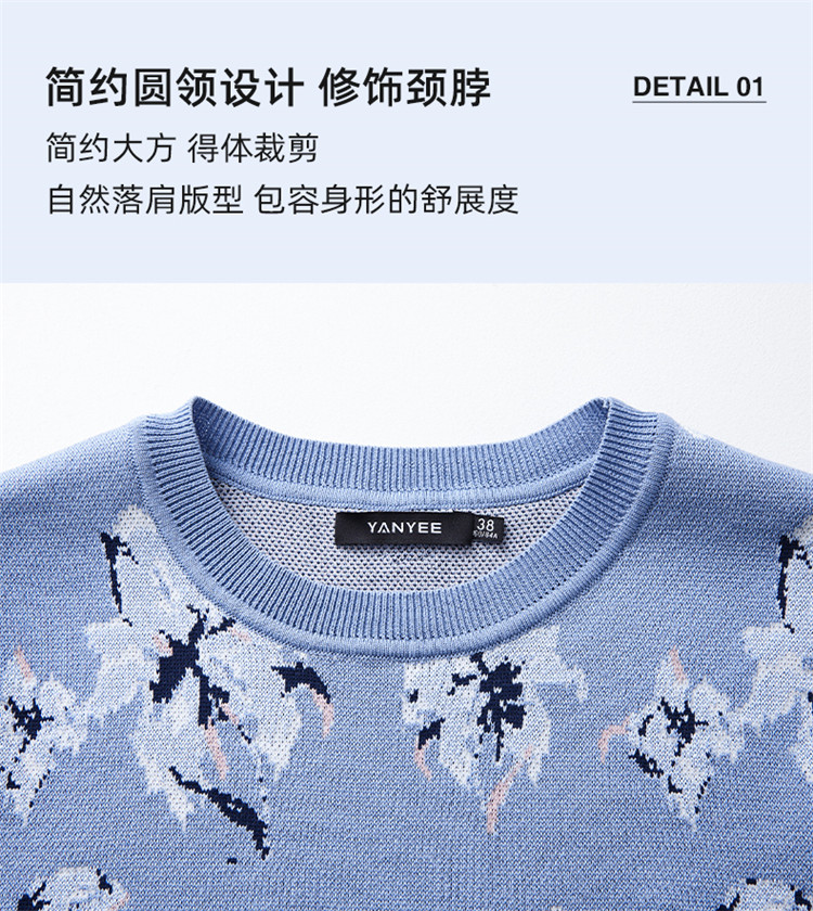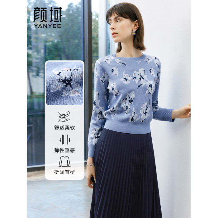 顔域碎花長袖針織衫女裝2025新款春季通勤氣質打底衫短款圓領上衣