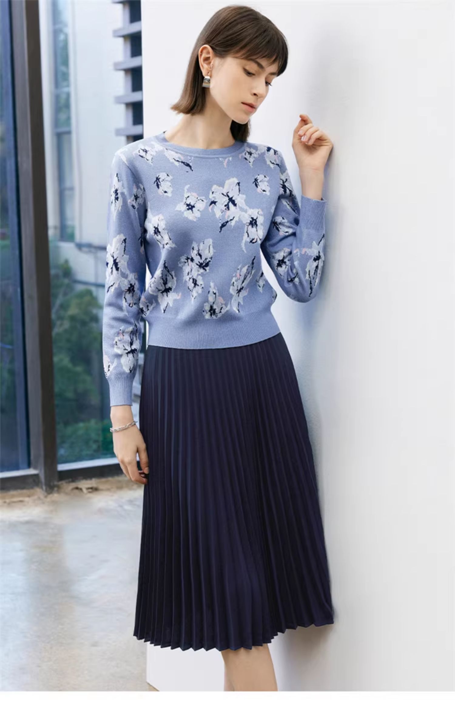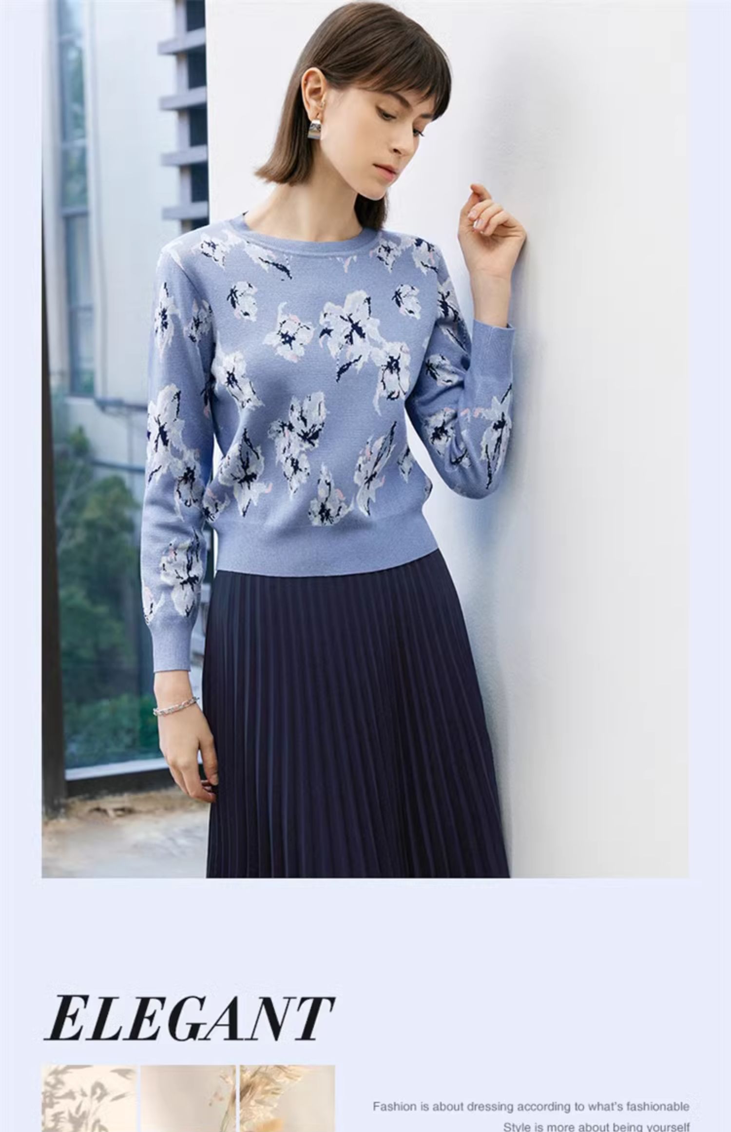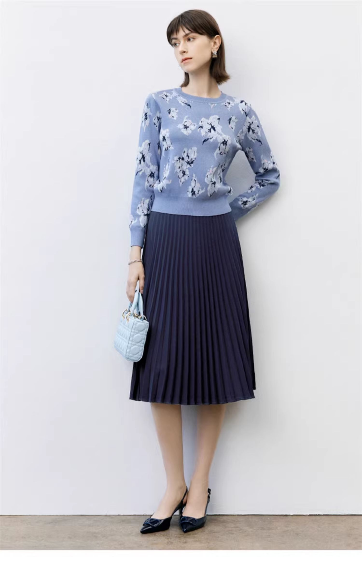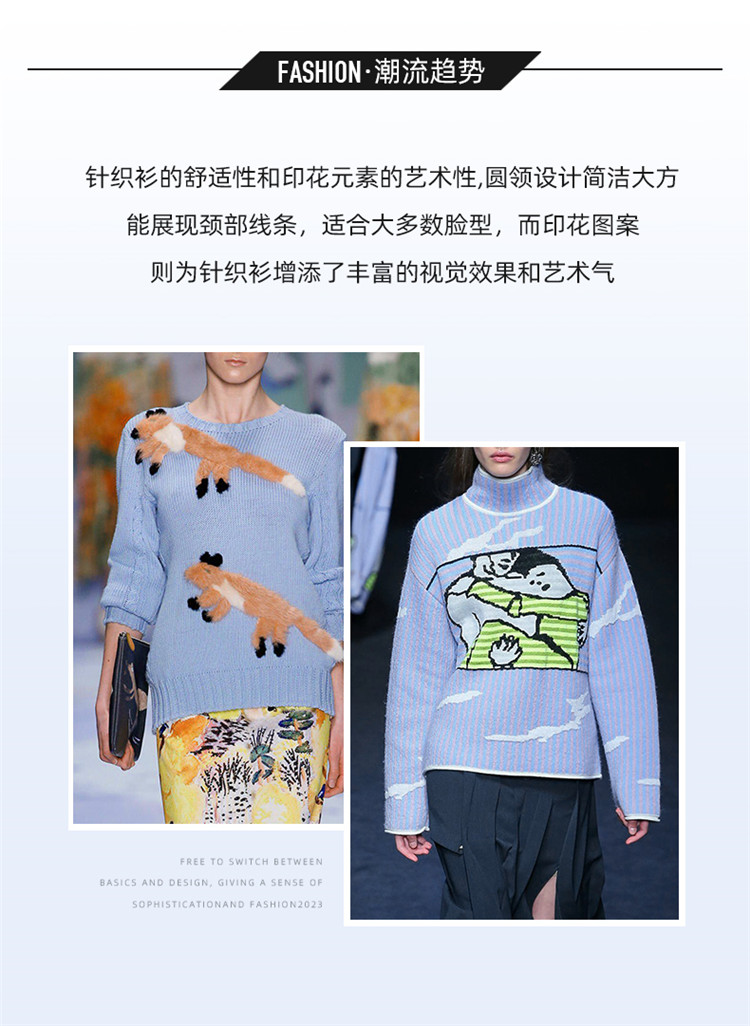 顔域碎花長袖針織衫女裝2025新款春季通勤氣質打底衫短款圓領上衣