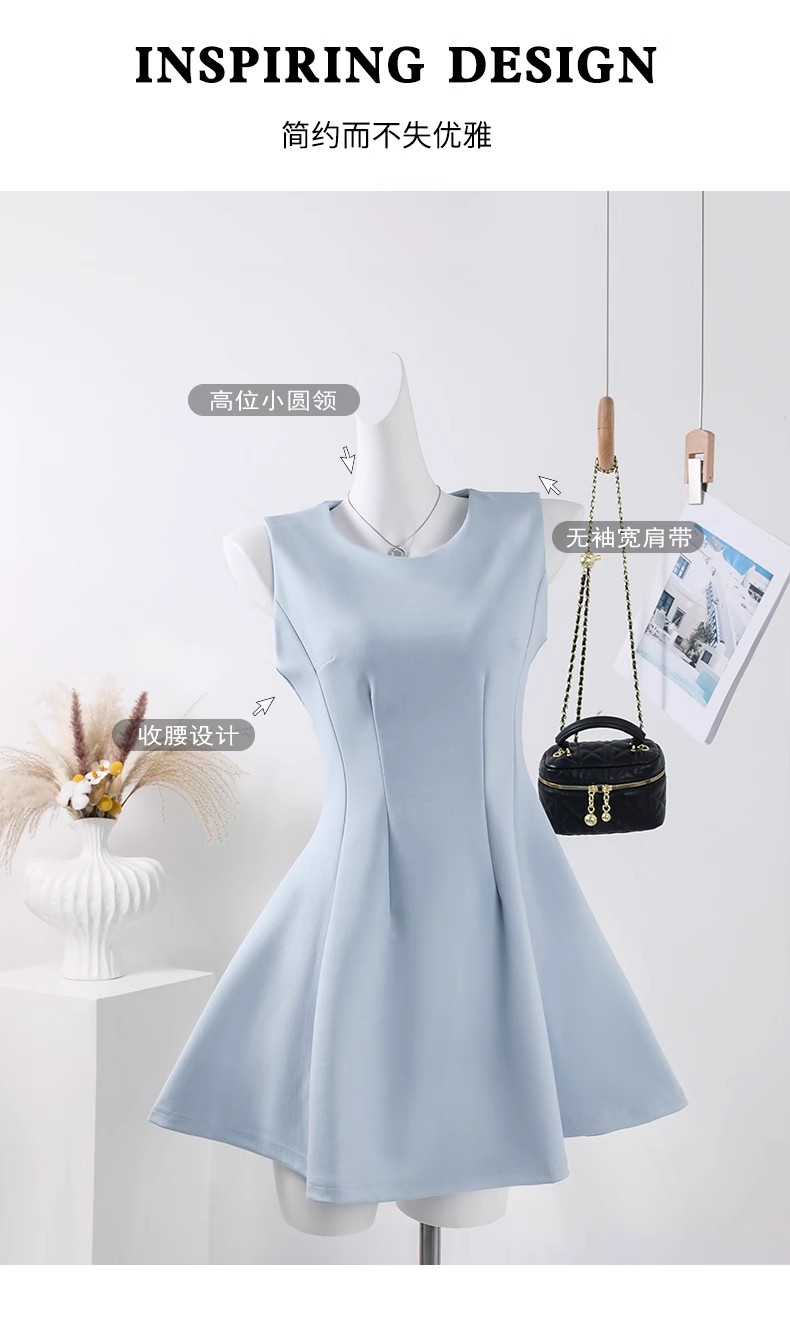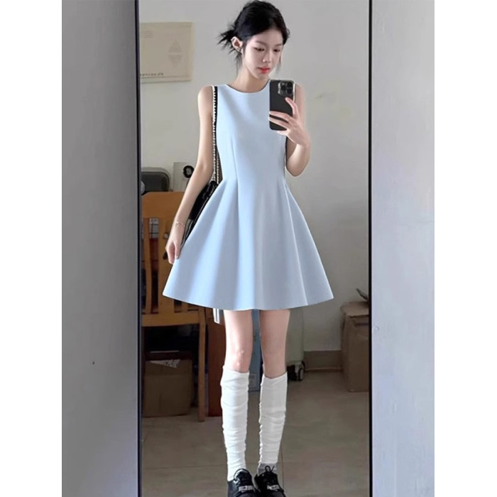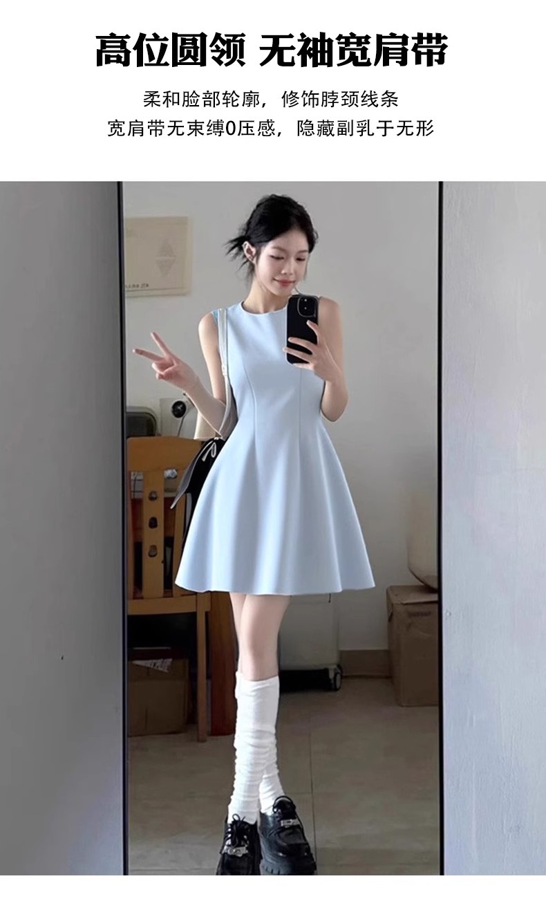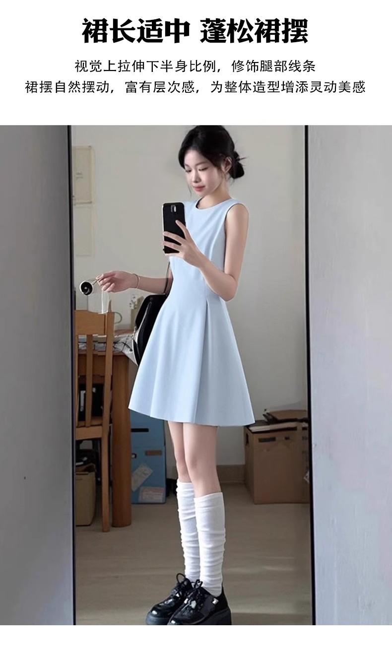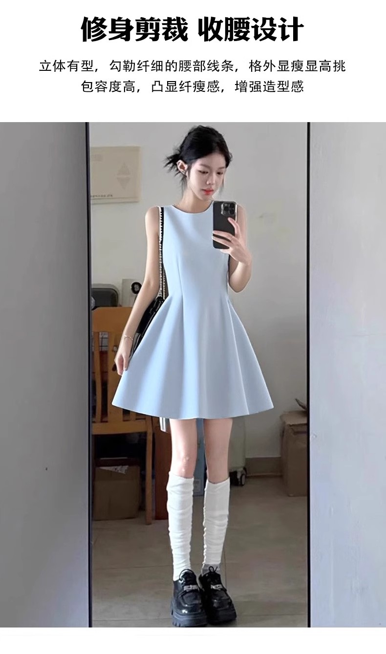 德國藍色連衣裙女夏季收腰a字無袖背心高級感氣質小個子掐腰短裙