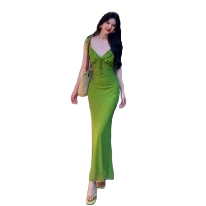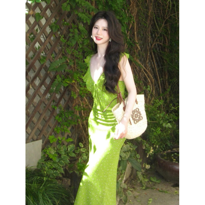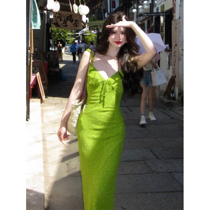 海邊度假綠色碎花吊帶連衣裙子女夏季2025新款絕美巨好看v領長裙