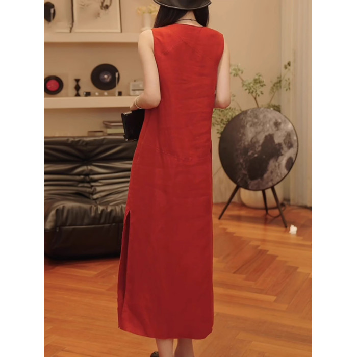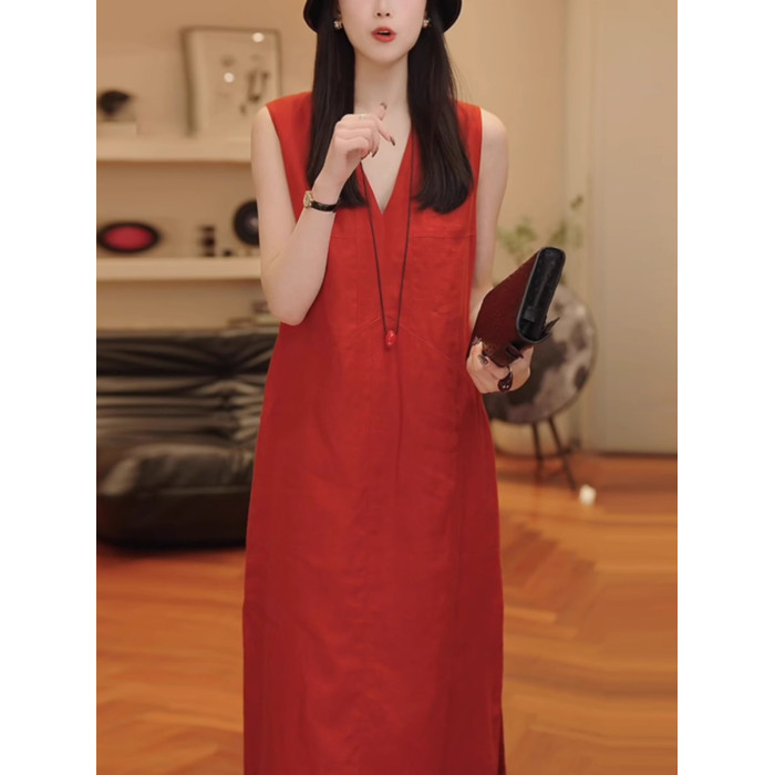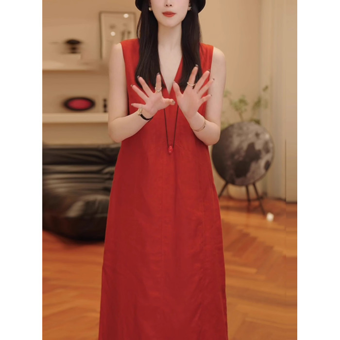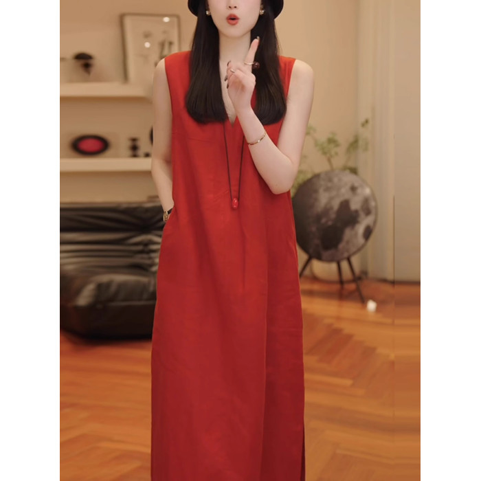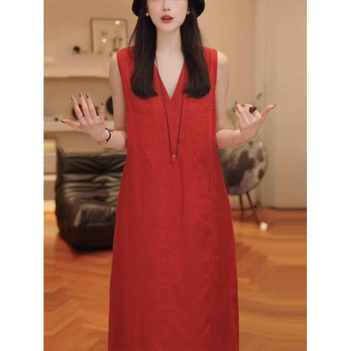 法式紅色亞麻背心連衣裙女裝夏季新款高級寬松氣質棉麻無袖長裙子