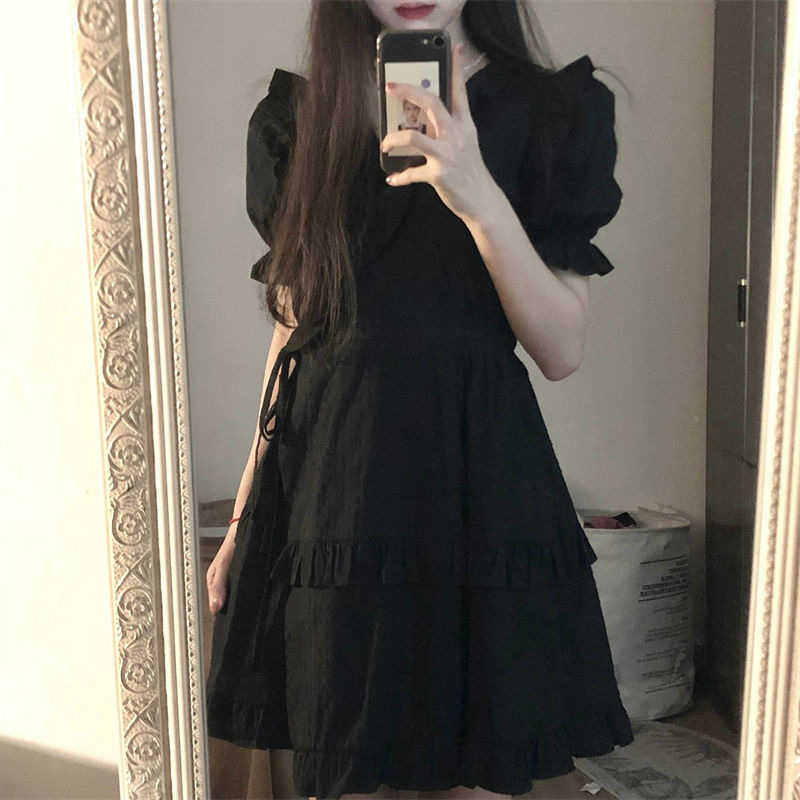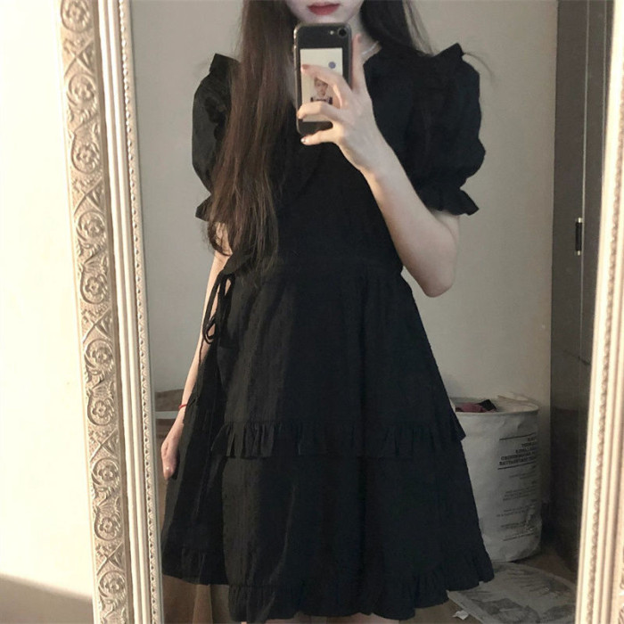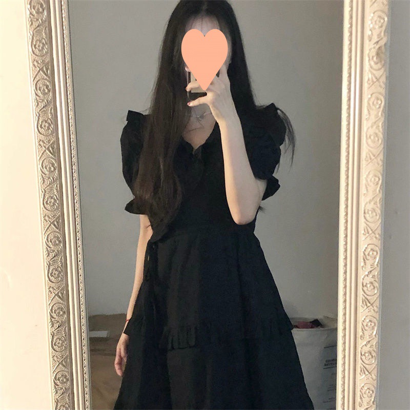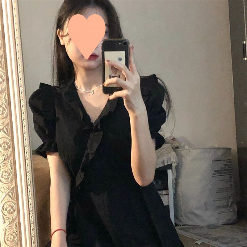 可鹽可甜短袖氣質小黑裙木耳邊V領連衣裙女學生夏系帶收腰a字