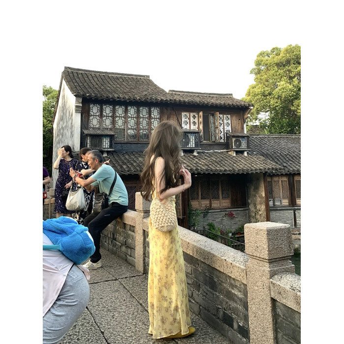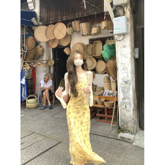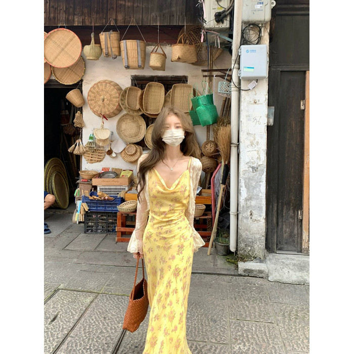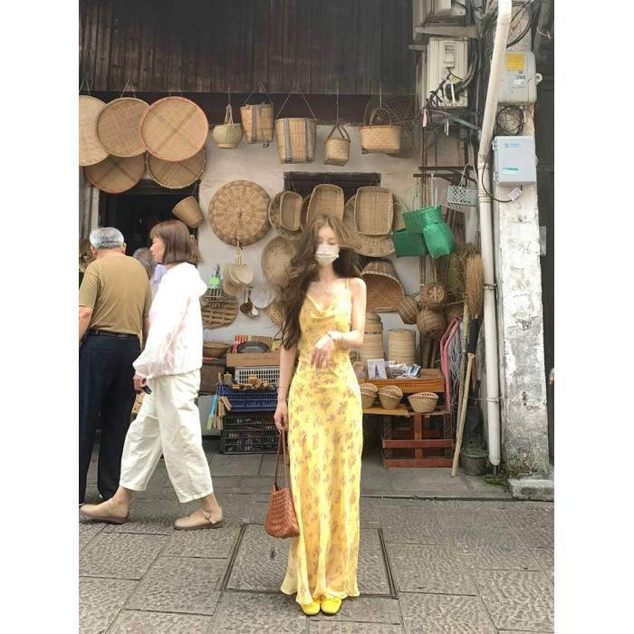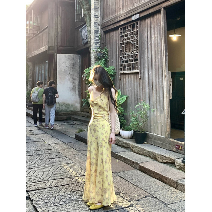 純欲氣質蕩領黃色碎花吊帶連衣裙女法式收腰顯瘦長款魚尾裙子夏季
