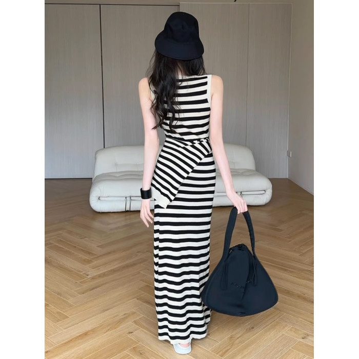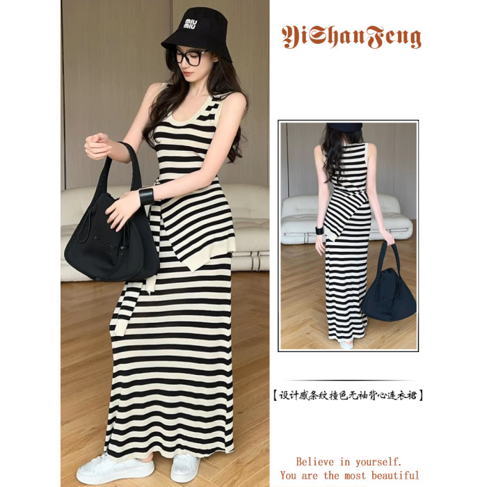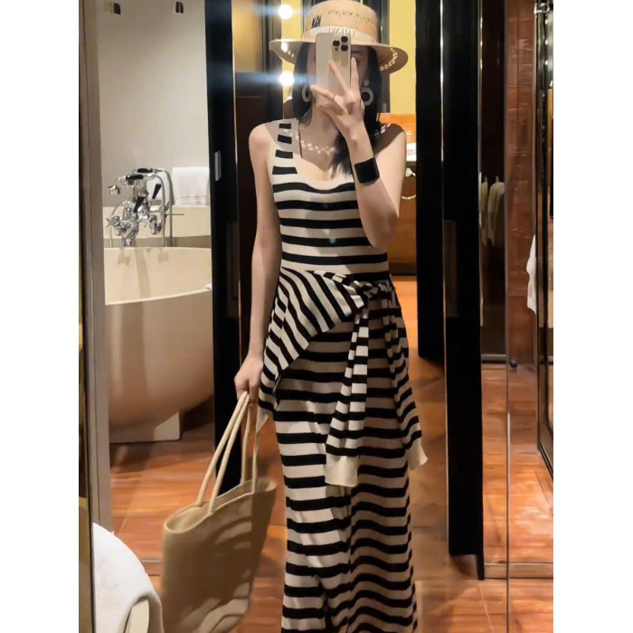 設計感條紋撞色無袖背心連衣裙女夏法式收腰顯瘦長裙披肩通勤套裝