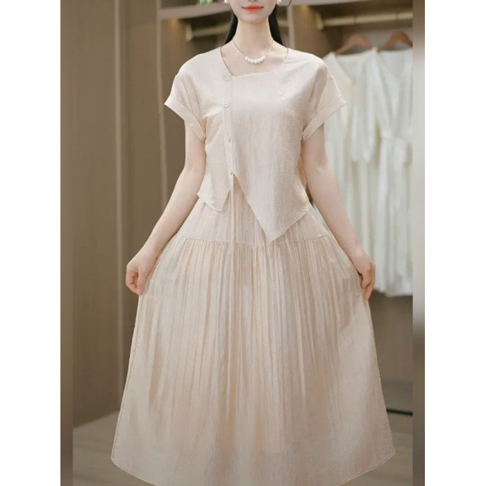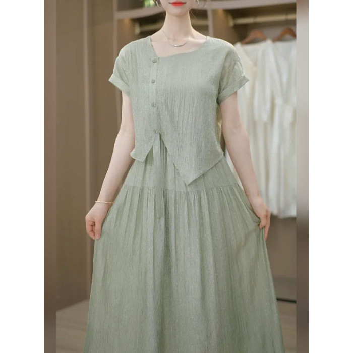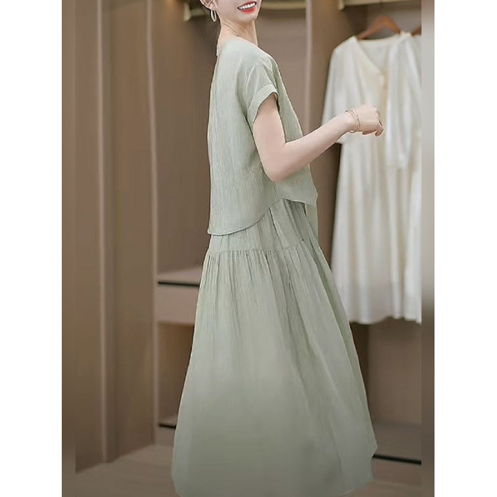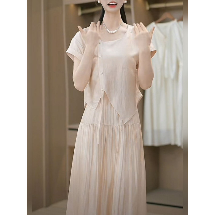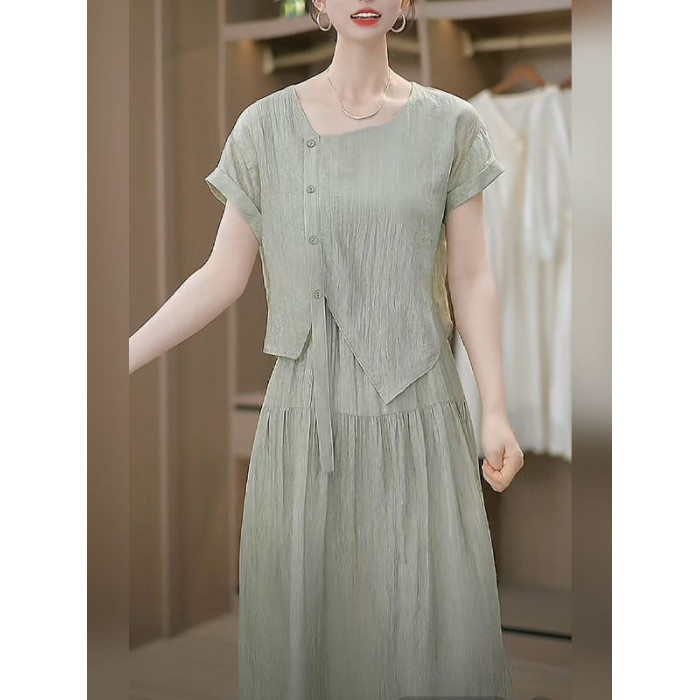 玲娜天絲假兩件連衣裙女2025新款夏季寬松減齡設計感過膝a字裙薄