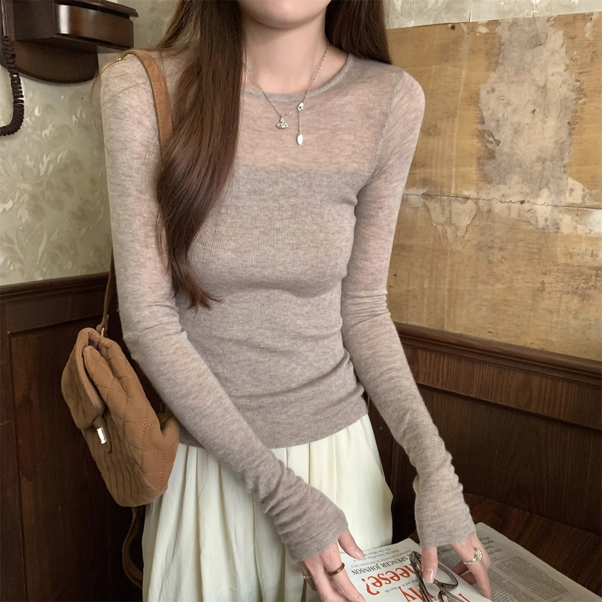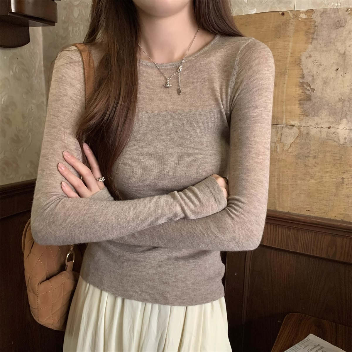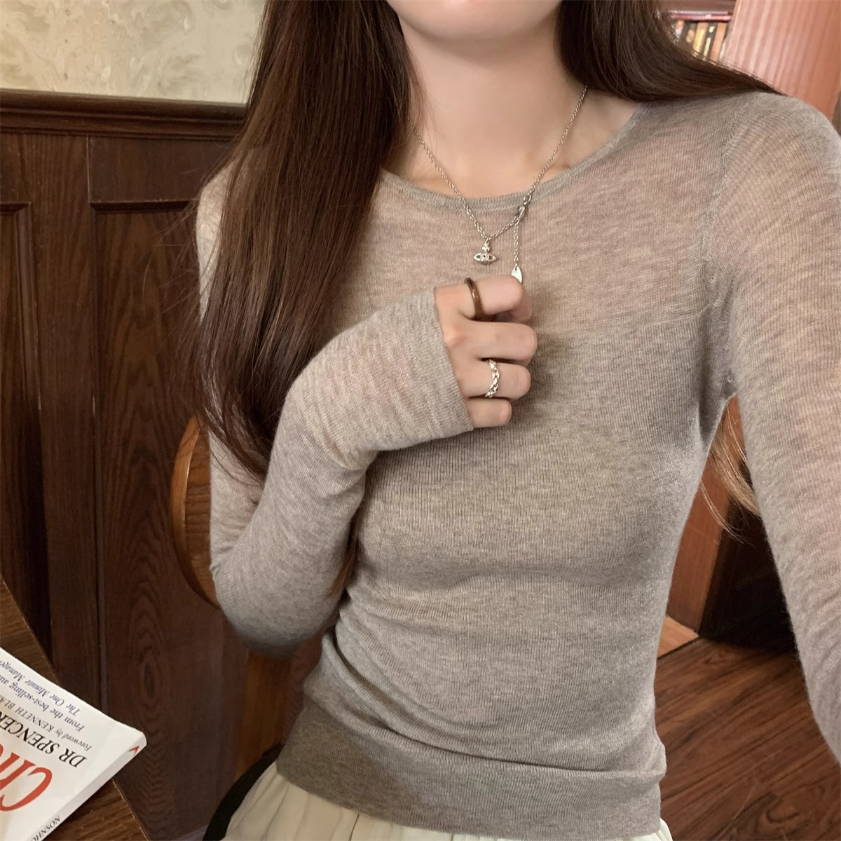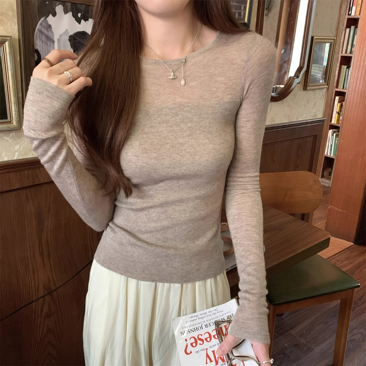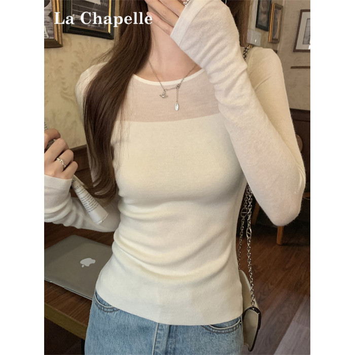 拉夏貝爾杏色針織打底衫女春秋2025年新款高級感內搭修身長袖上衣