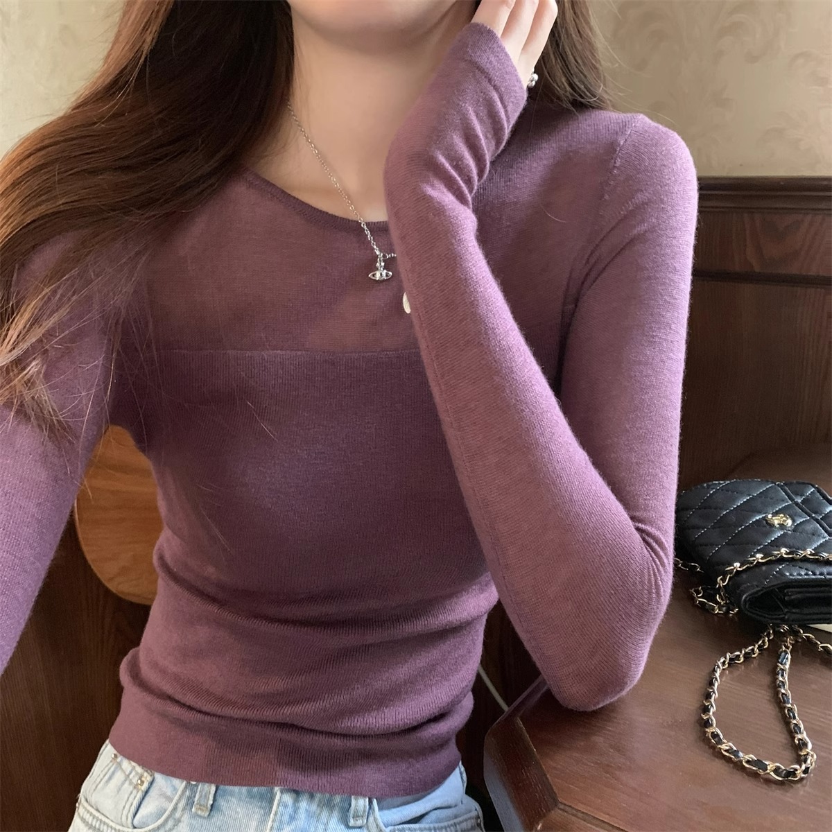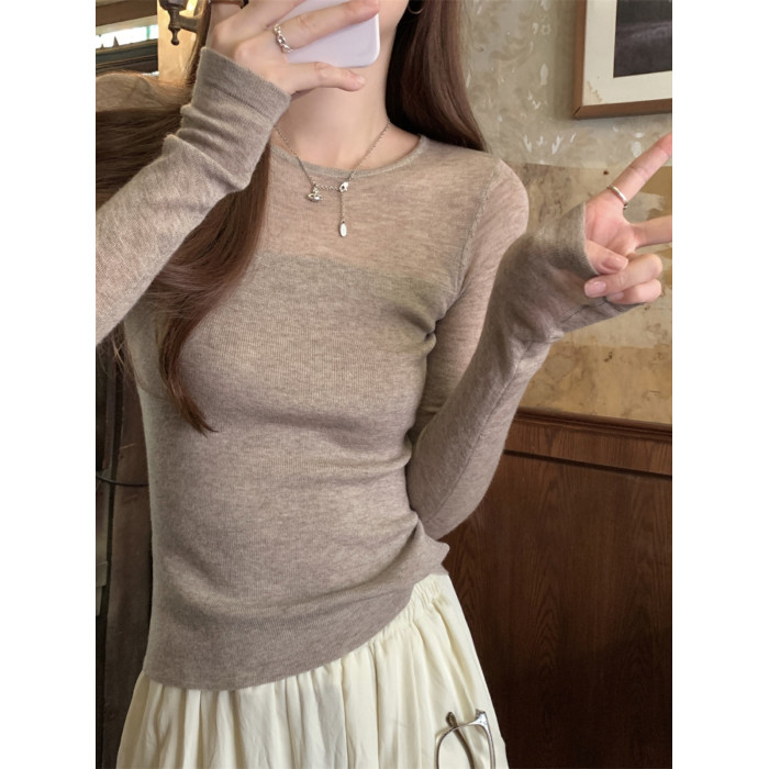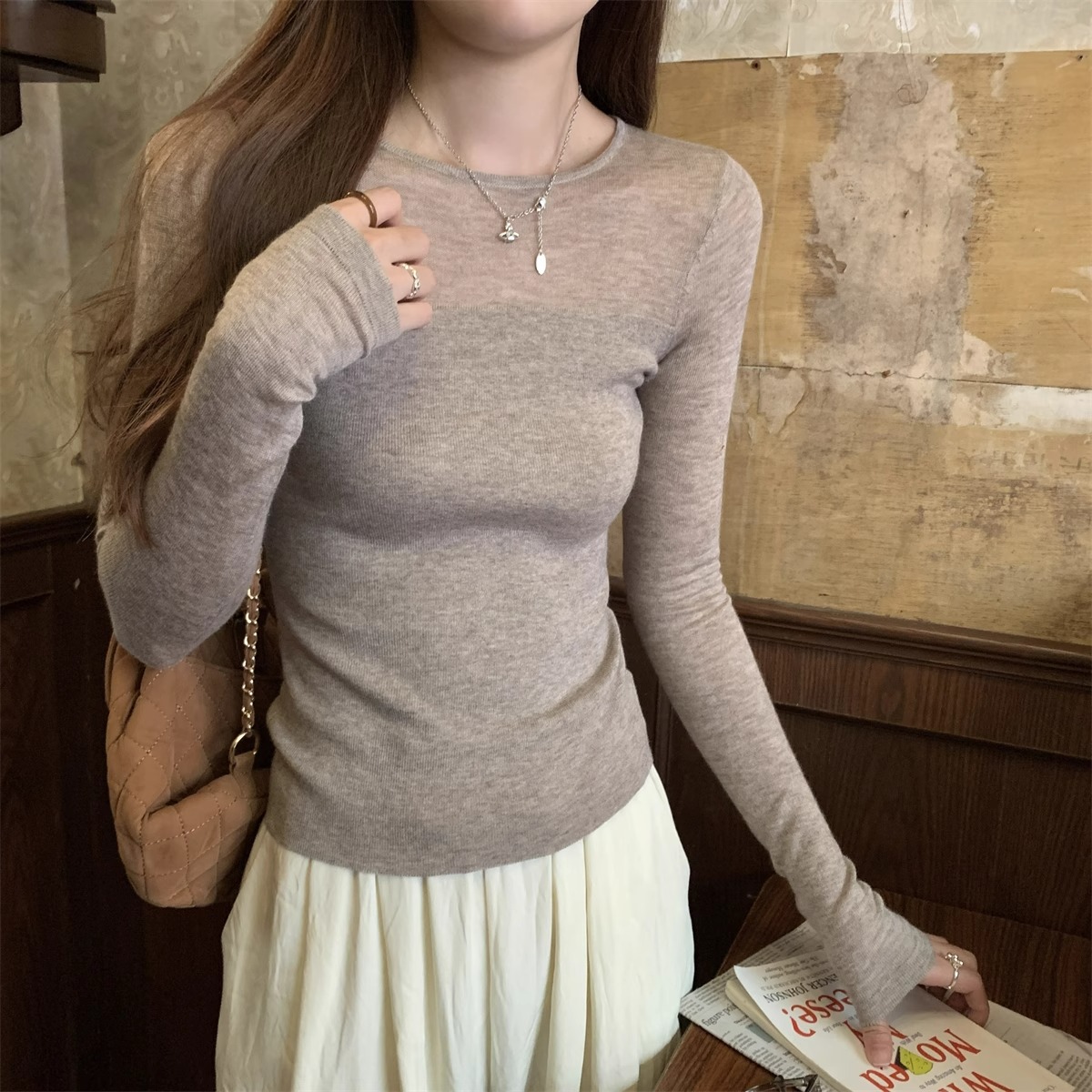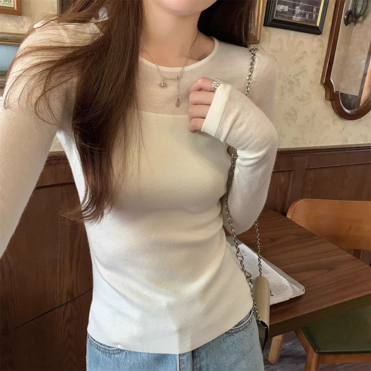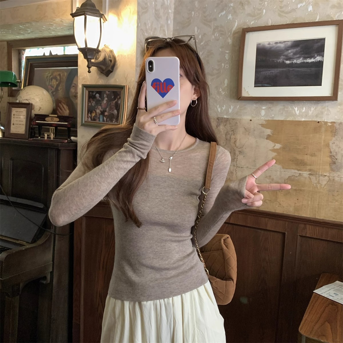 拉夏貝爾杏色針織打底衫女春秋2025年新款高級感內搭修身長袖上衣