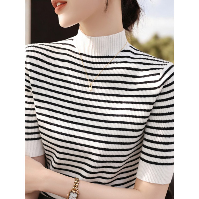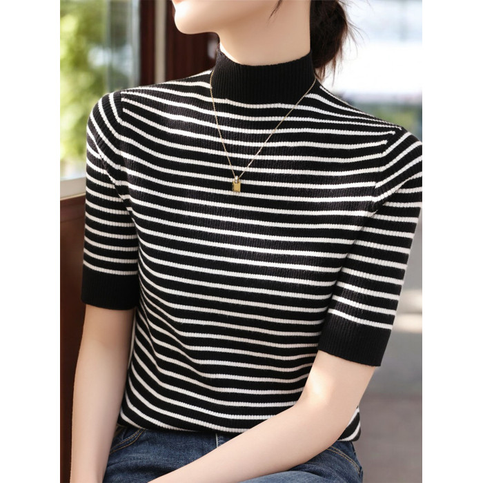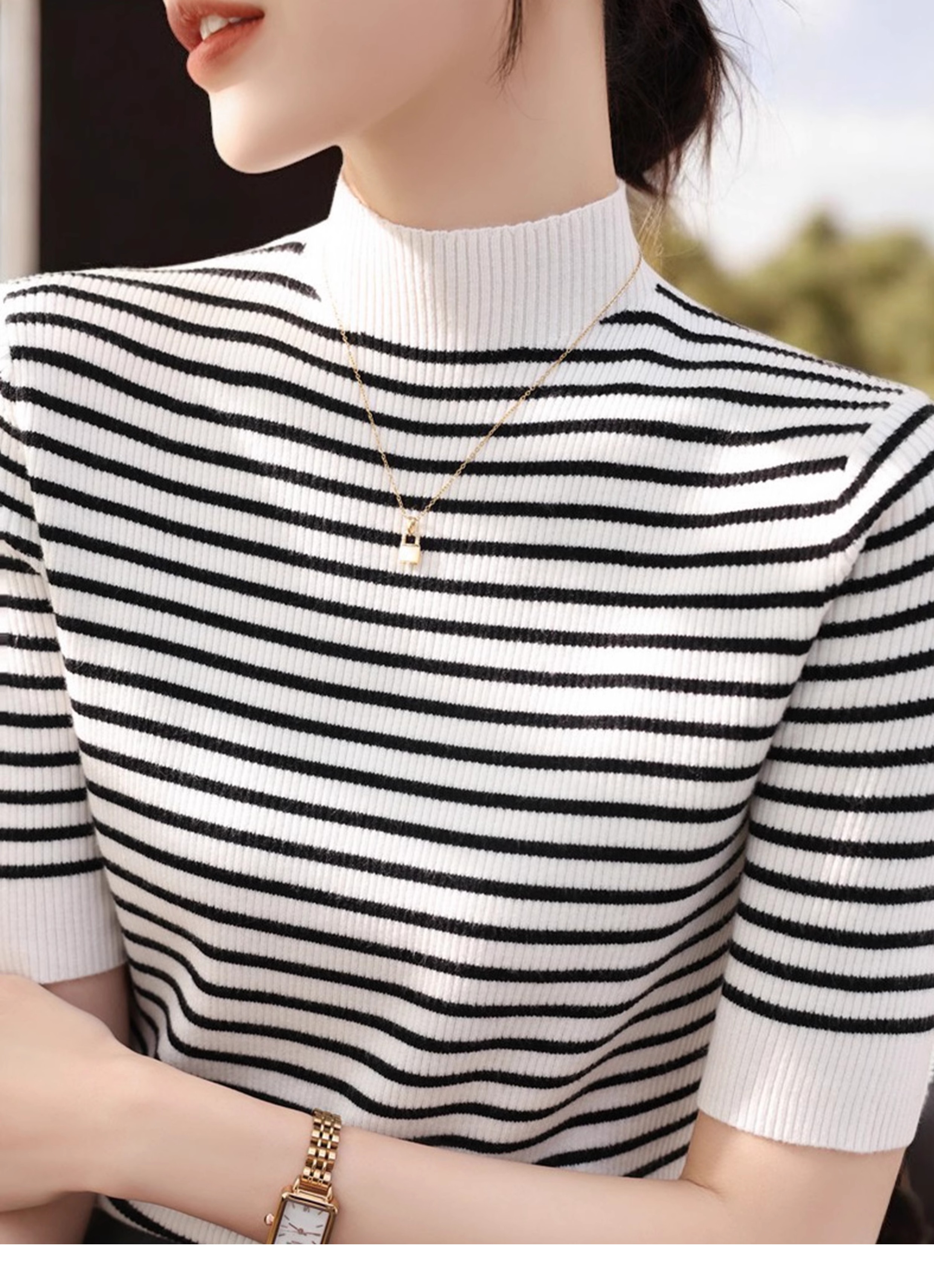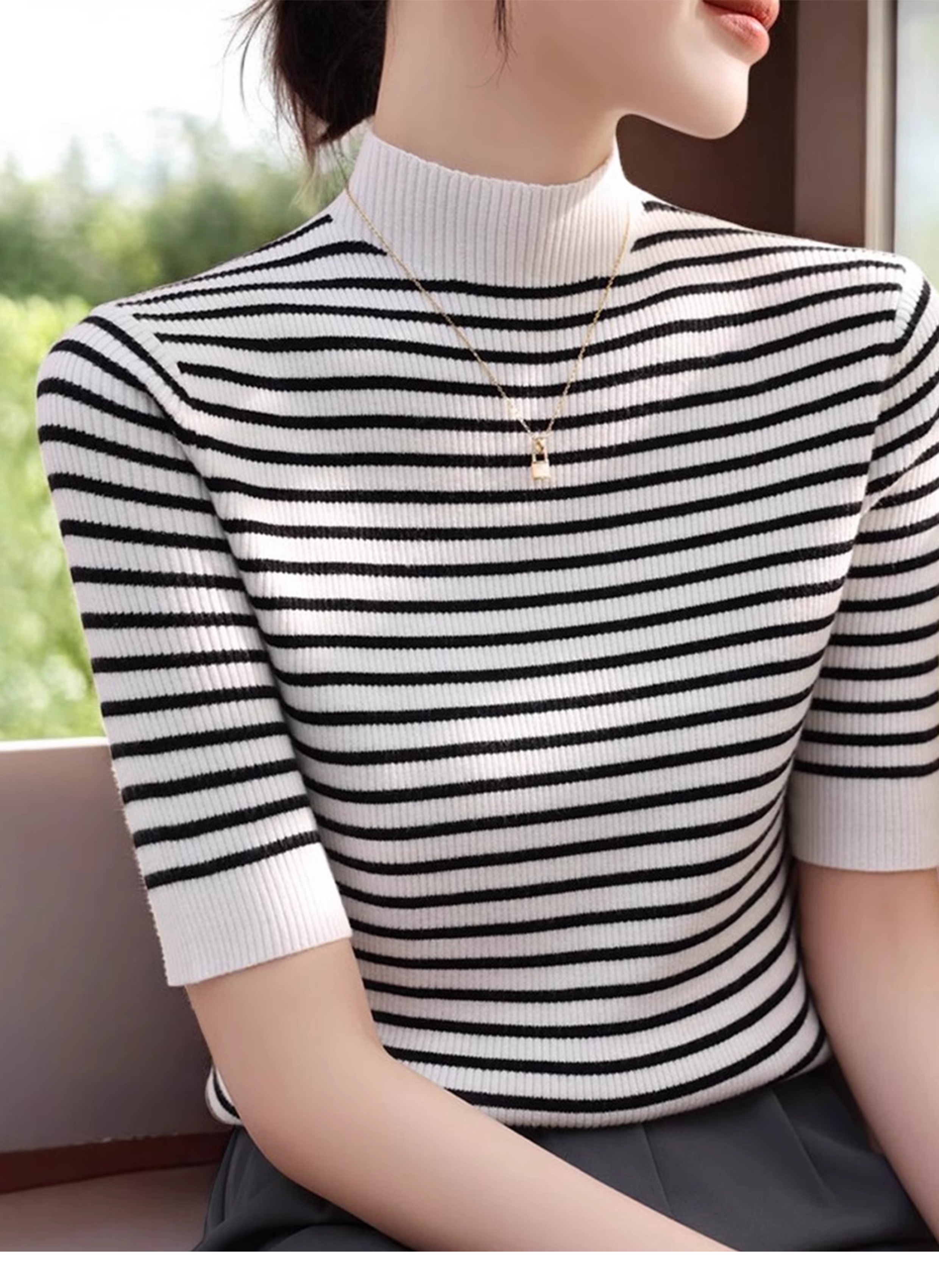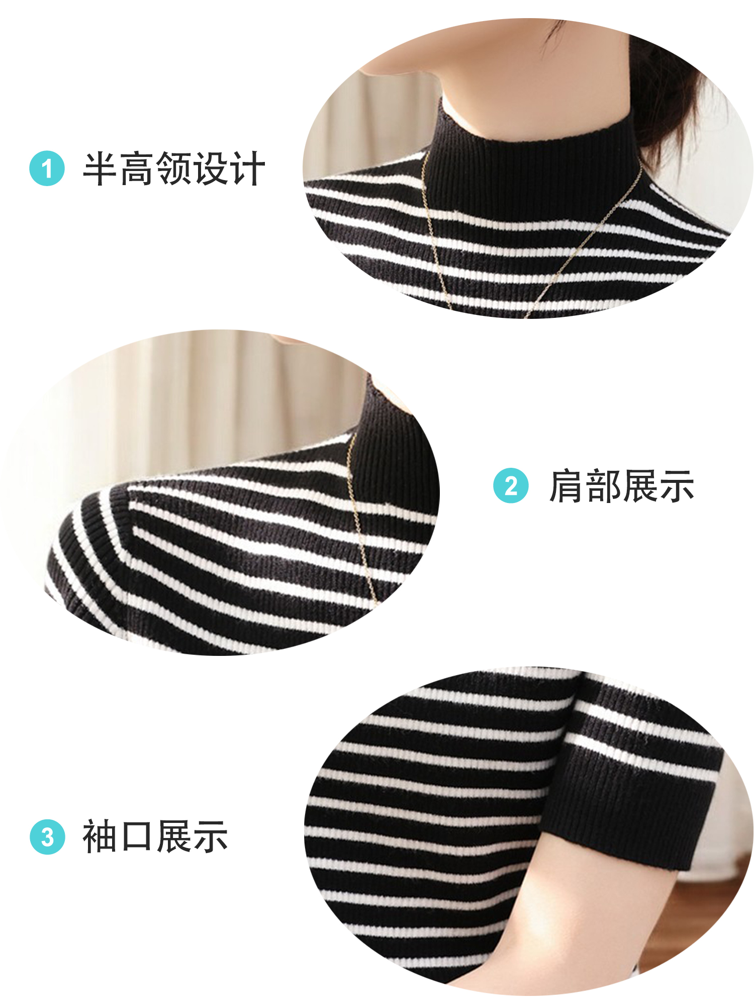 Basic House/百家好黑白條紋五分袖針織衫女早秋內搭半高領打底衫