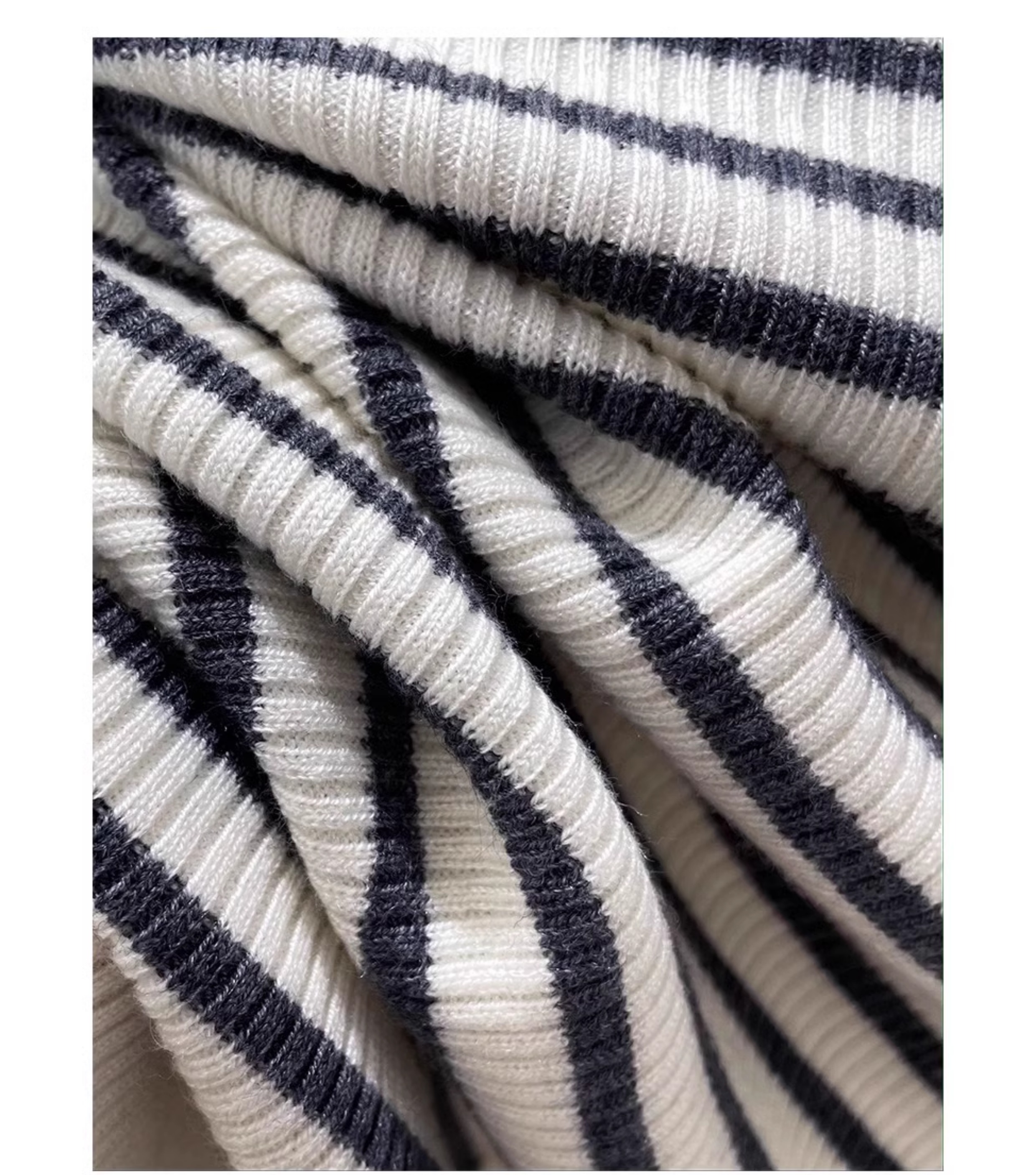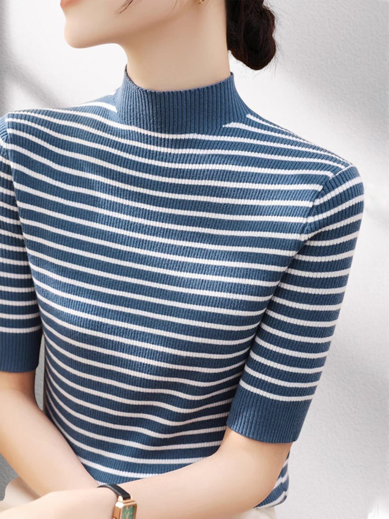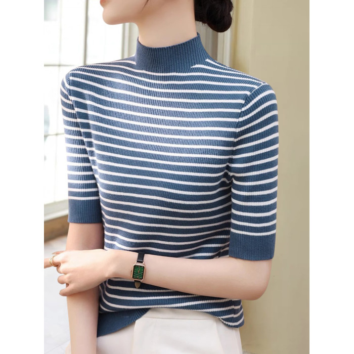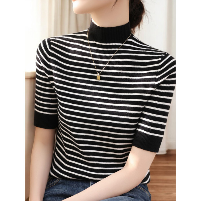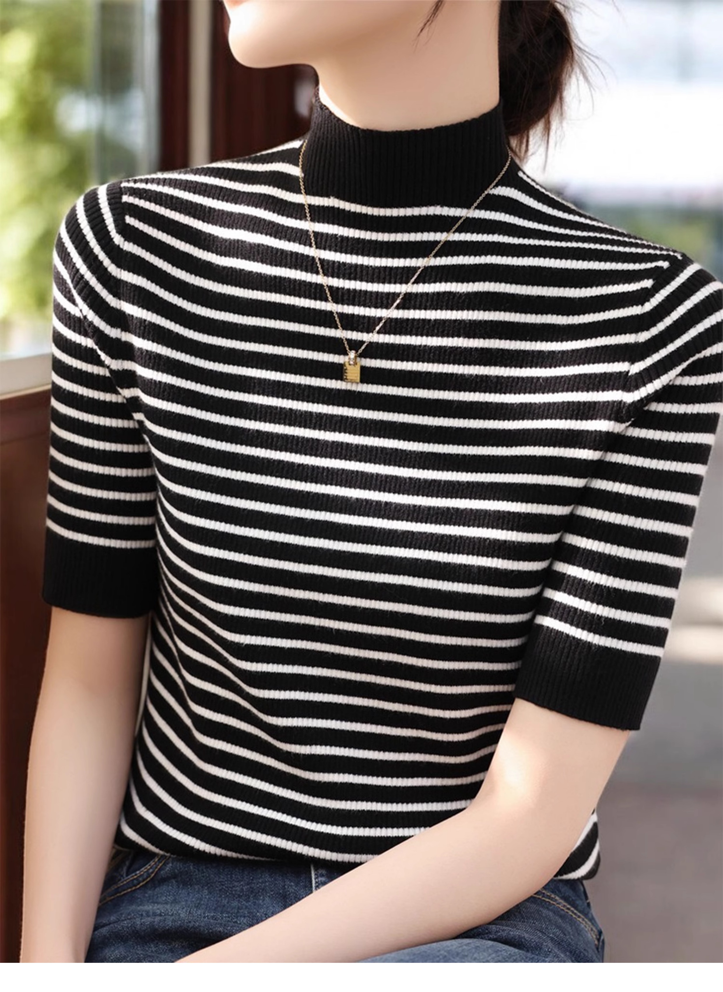 Basic House/百家好黑白條紋五分袖針織衫女早秋內搭半高領打底衫