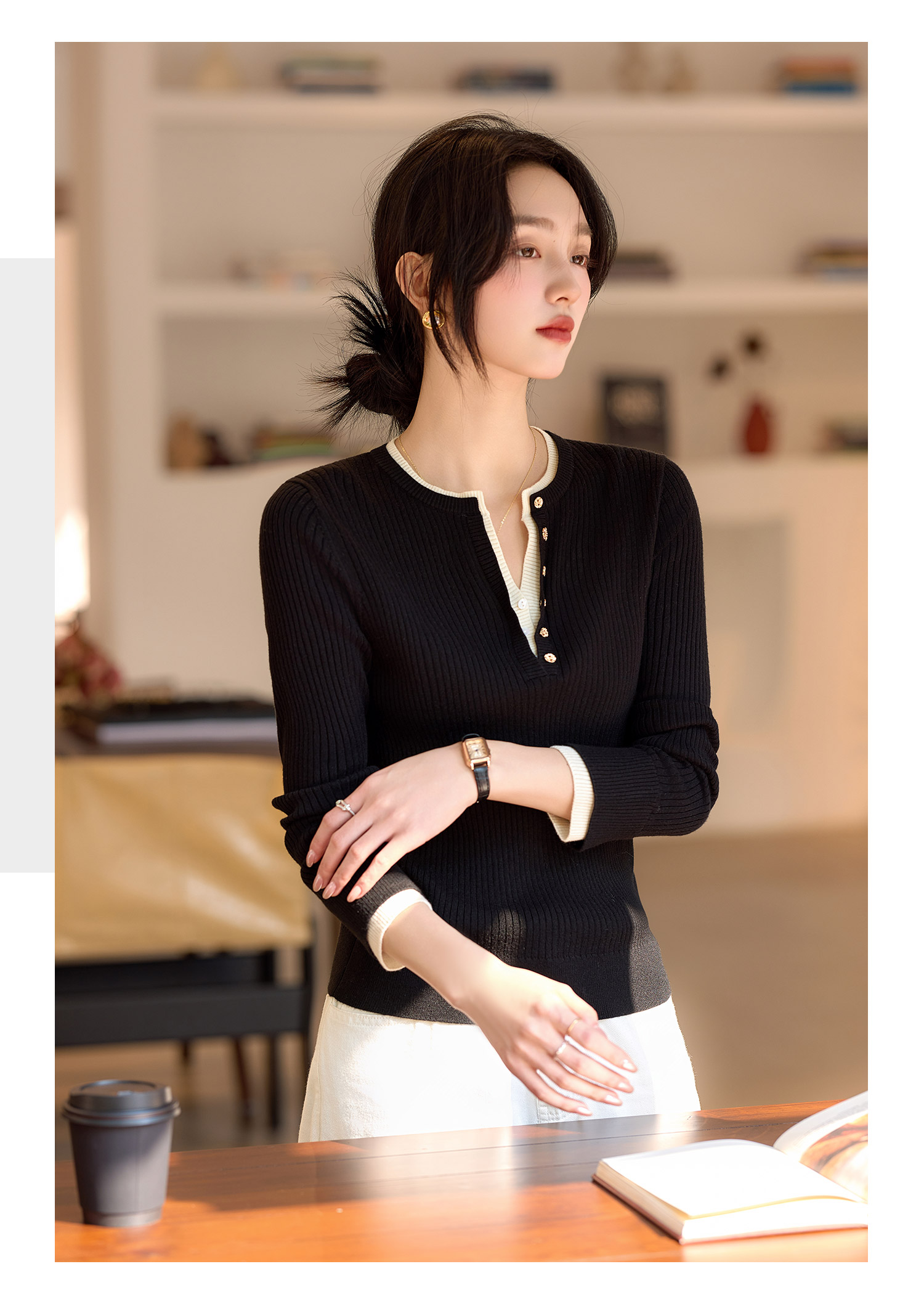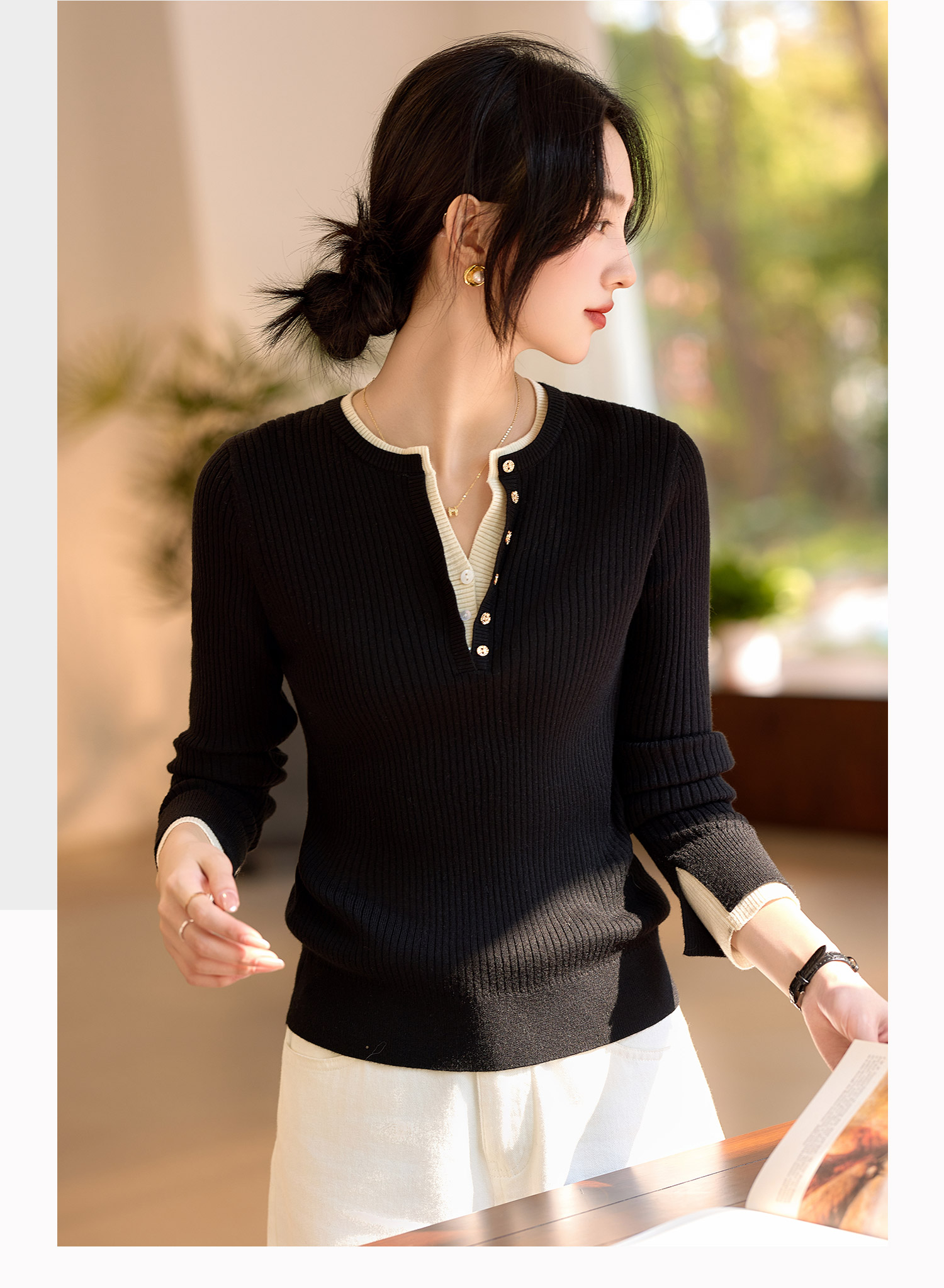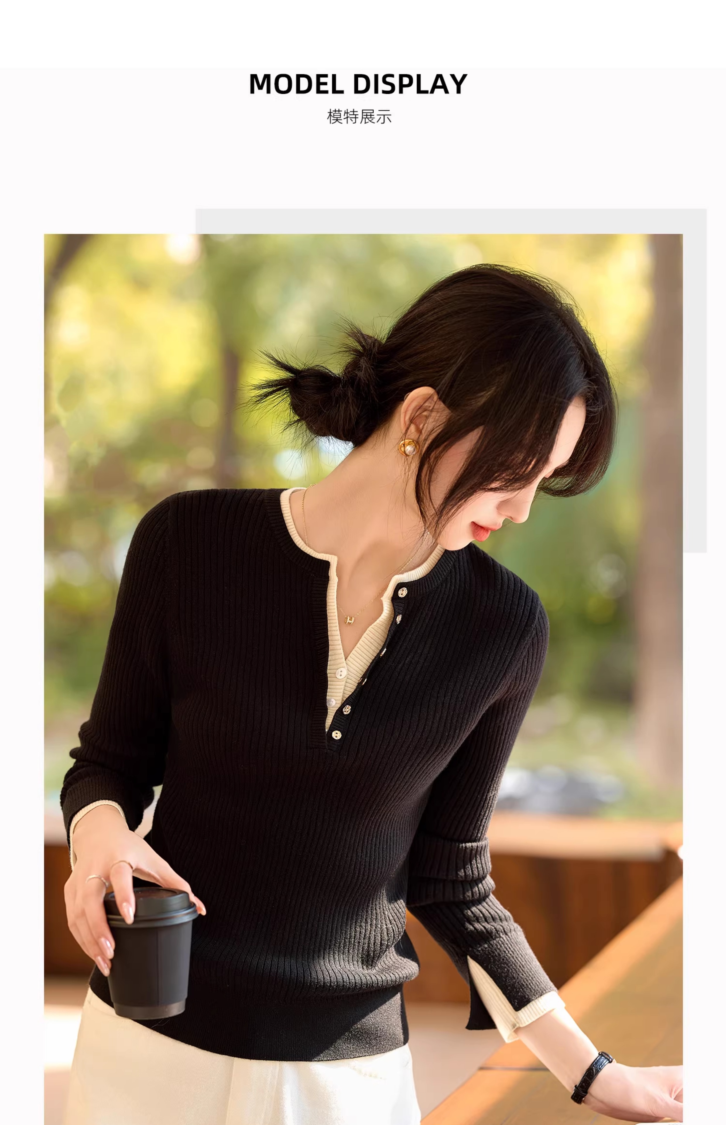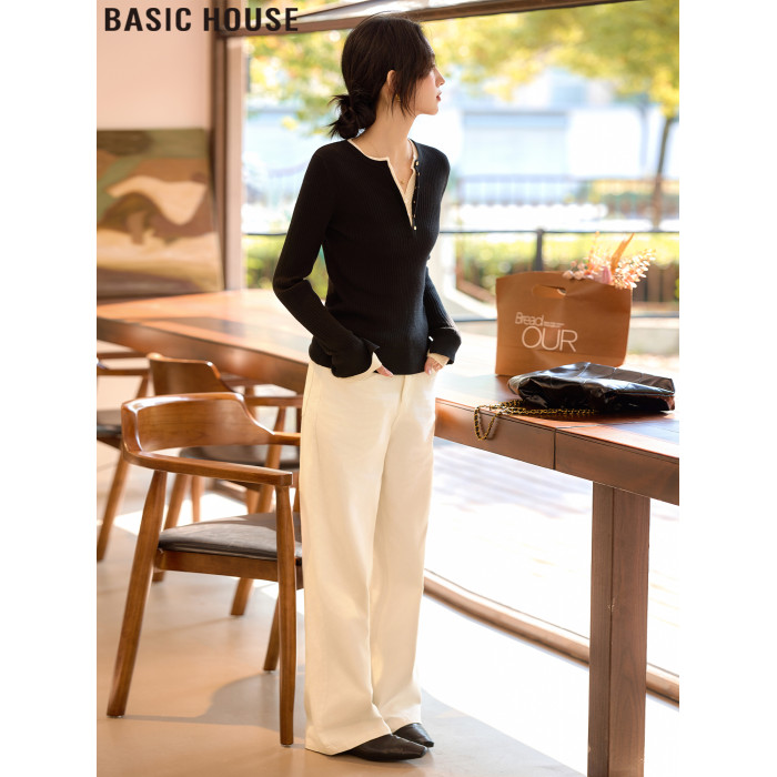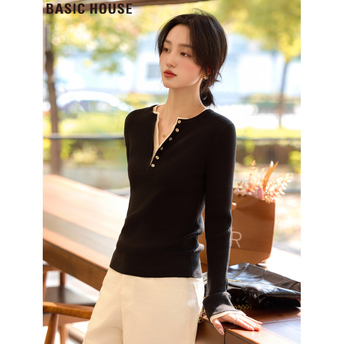 Basic House/百家法式大衣內搭假兩件V領羊毛針織打底衫女款春季