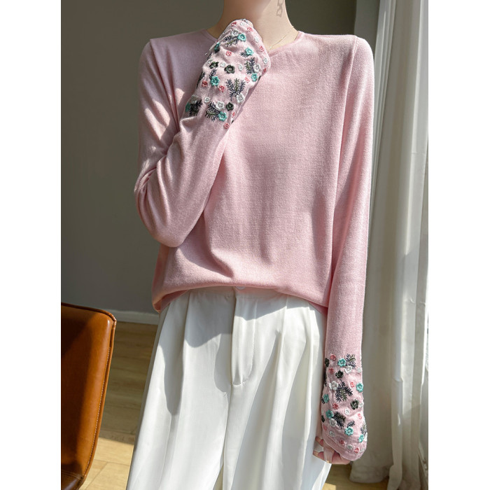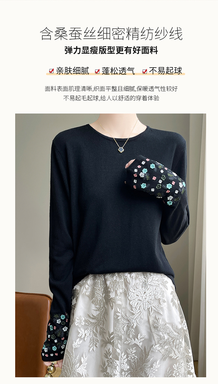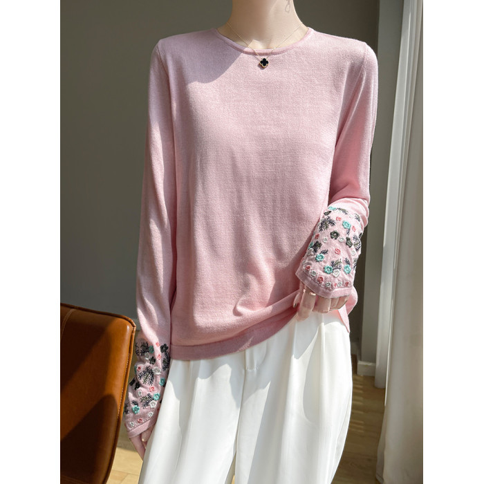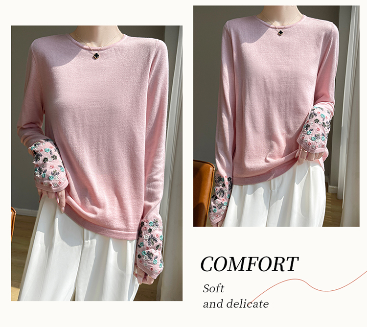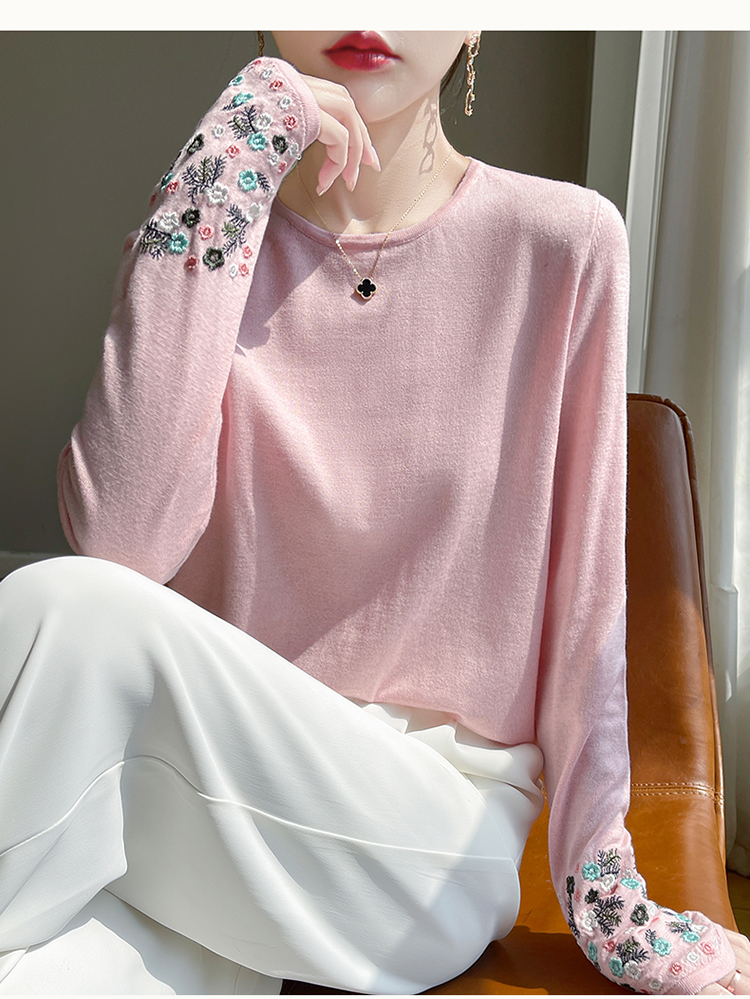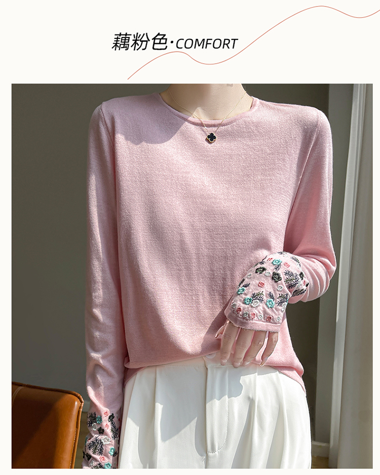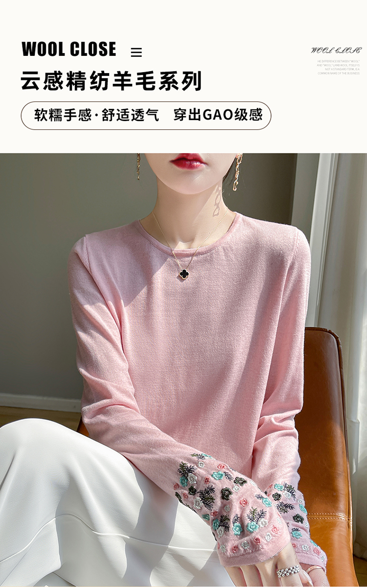春秋圓領薄款精紡羊毛針織打底衫女袖口刺綉蠶絲長袖上衣粉色內搭