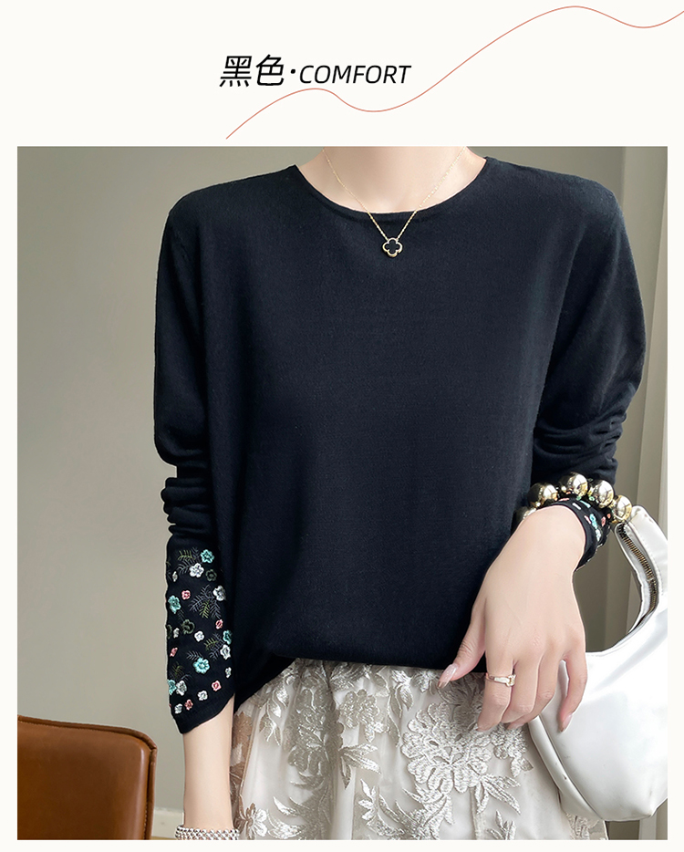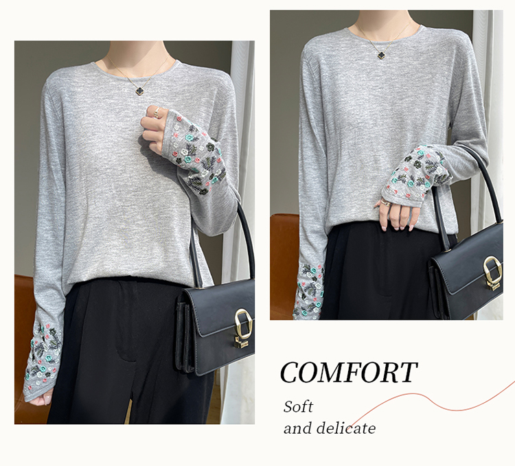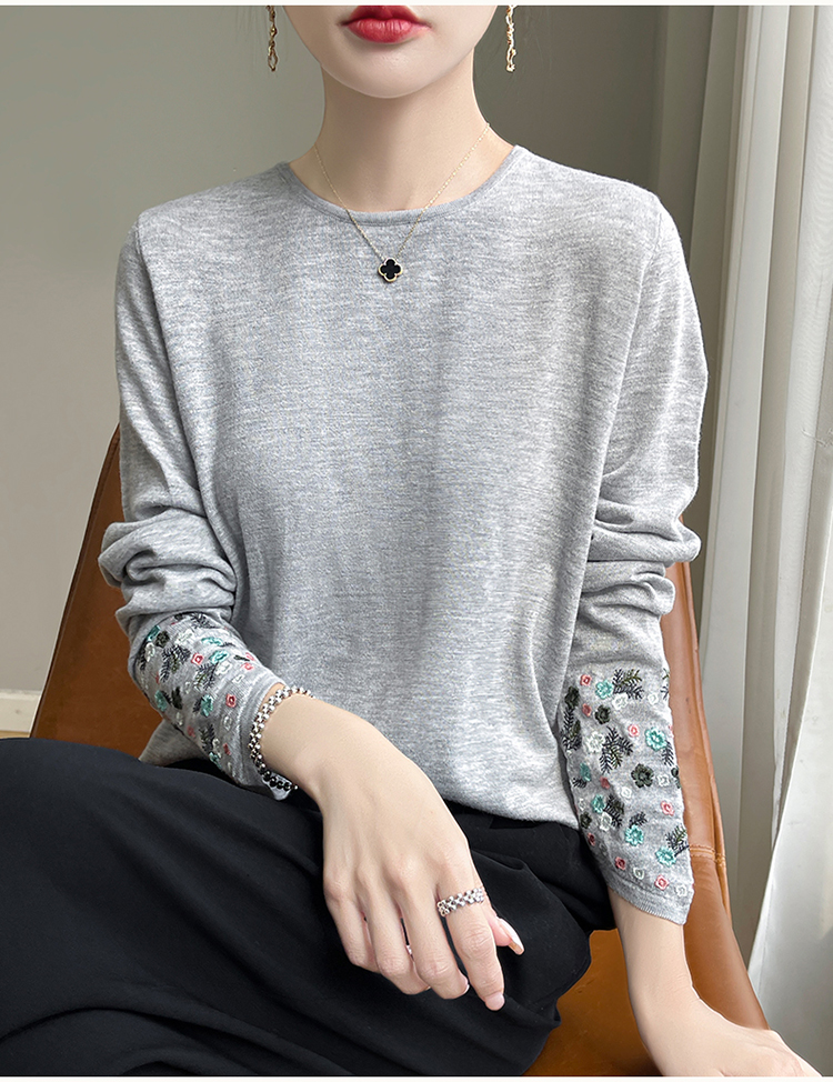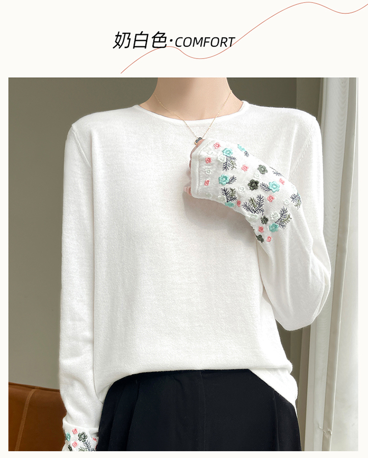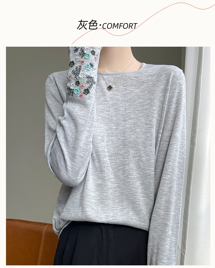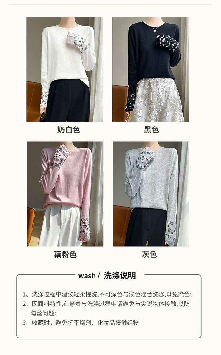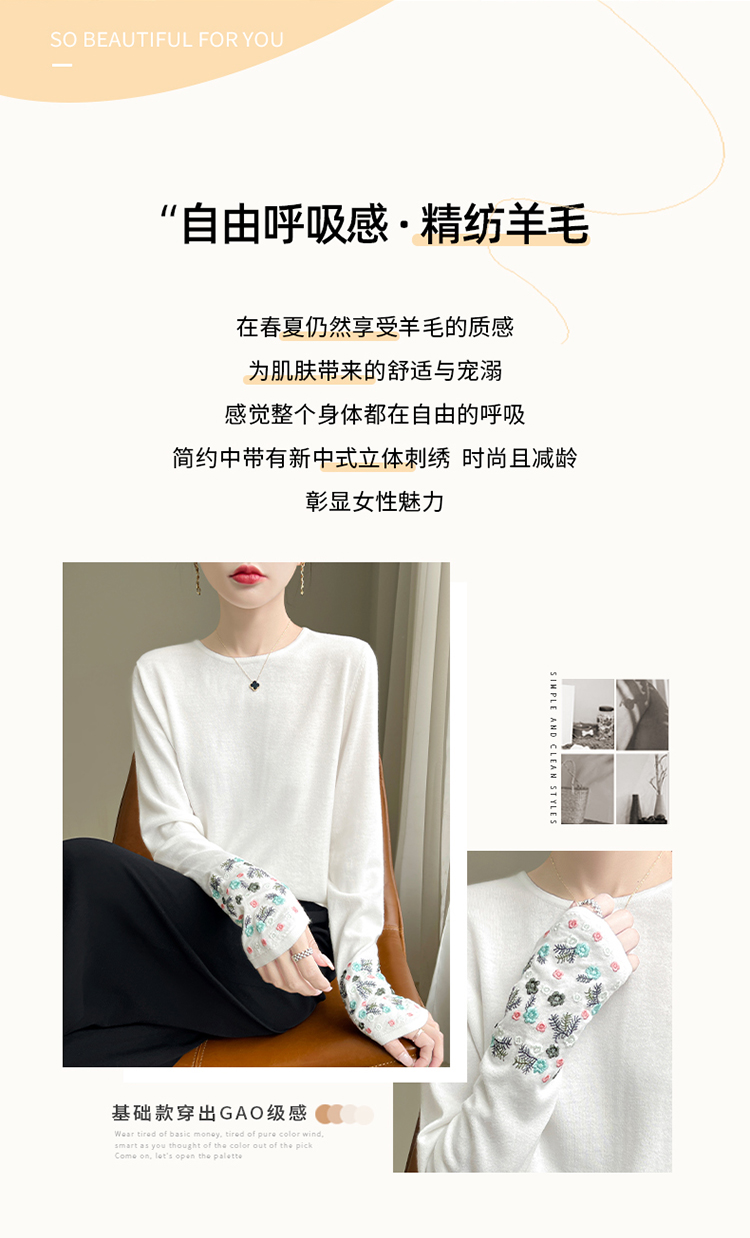 春秋圓領薄款精紡羊毛針織打底衫女袖口刺綉蠶絲長袖上衣粉色內搭