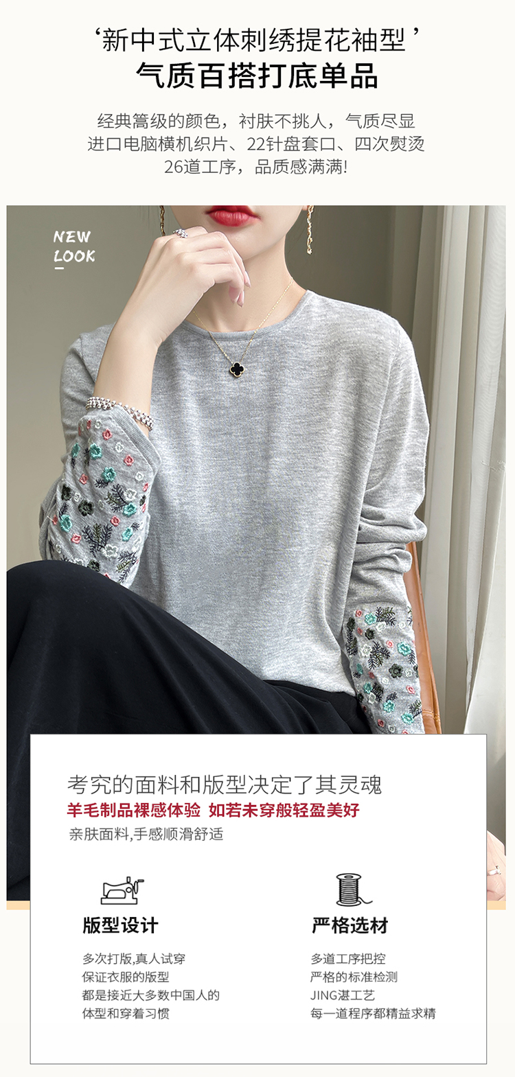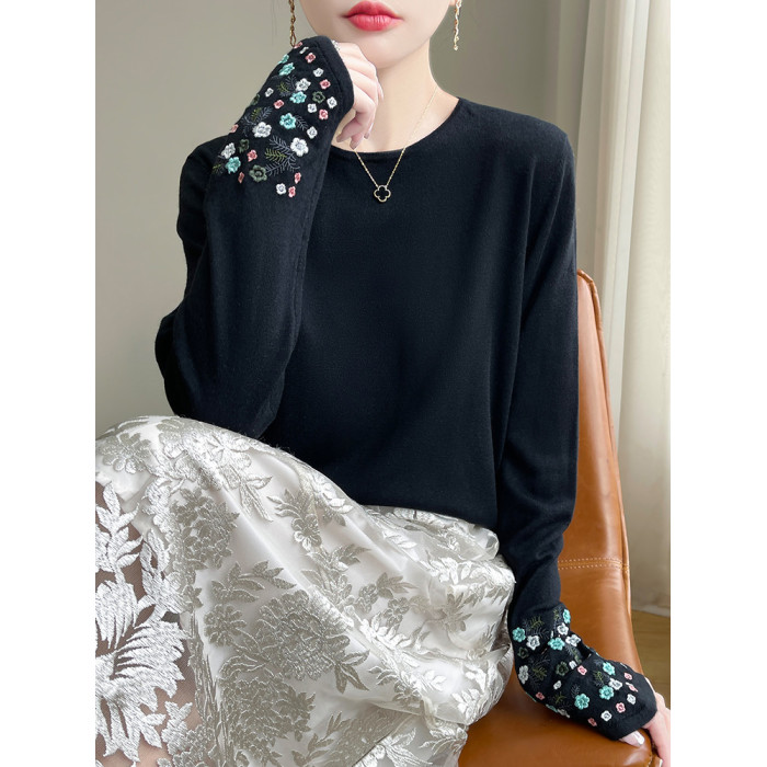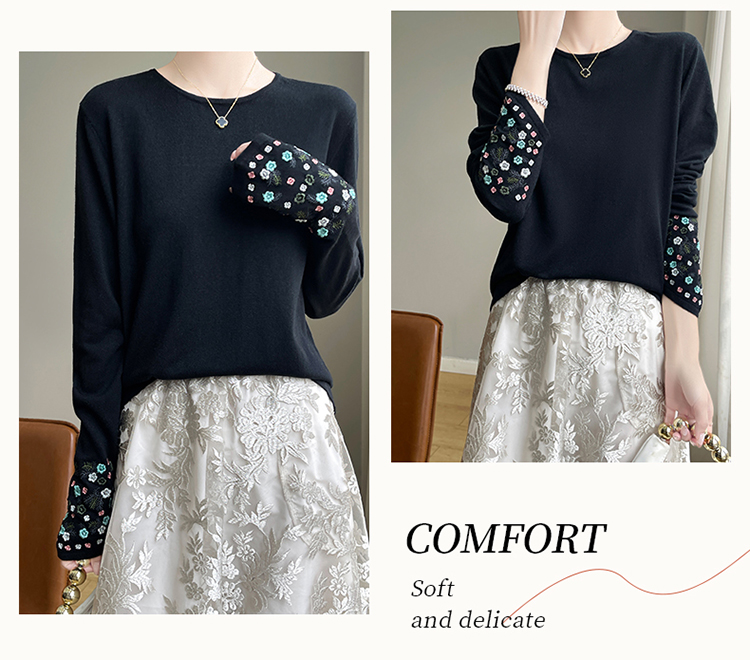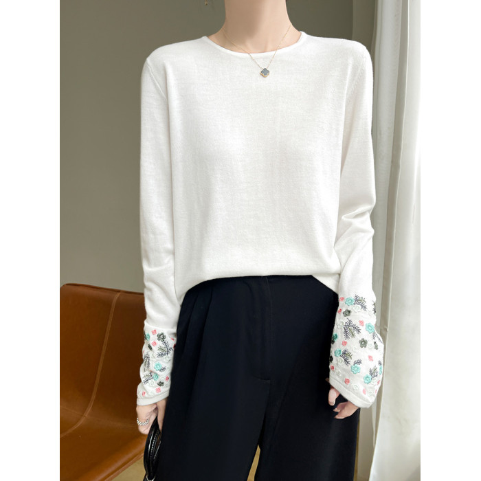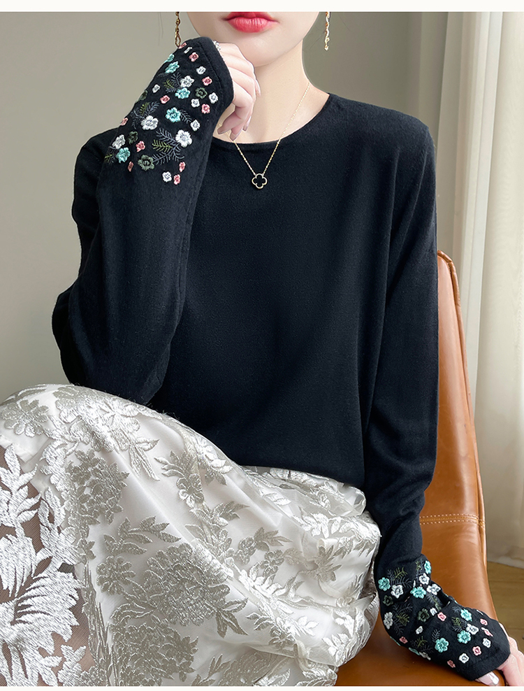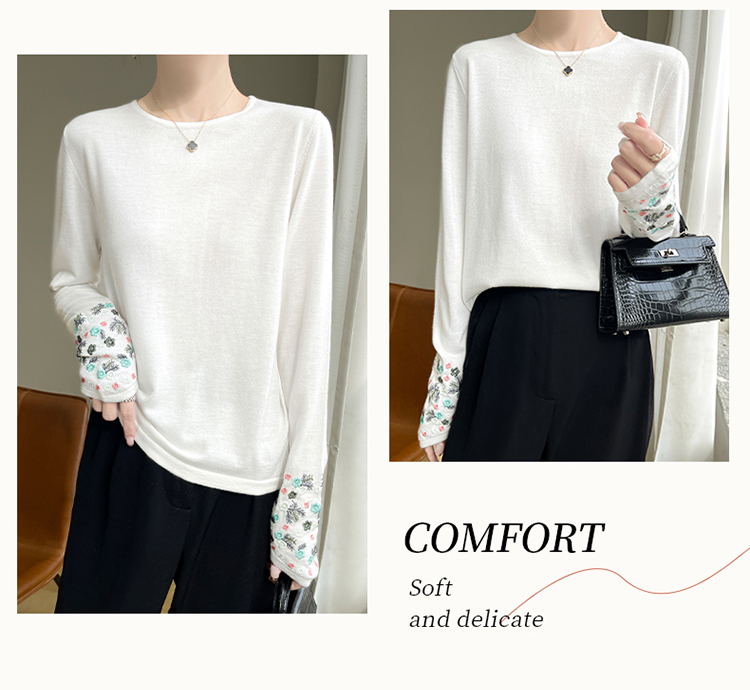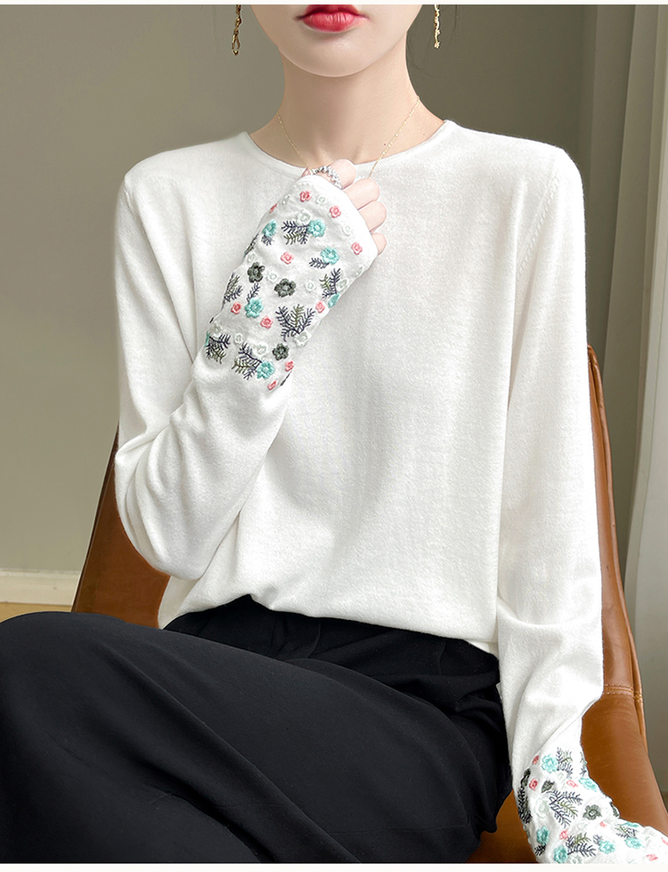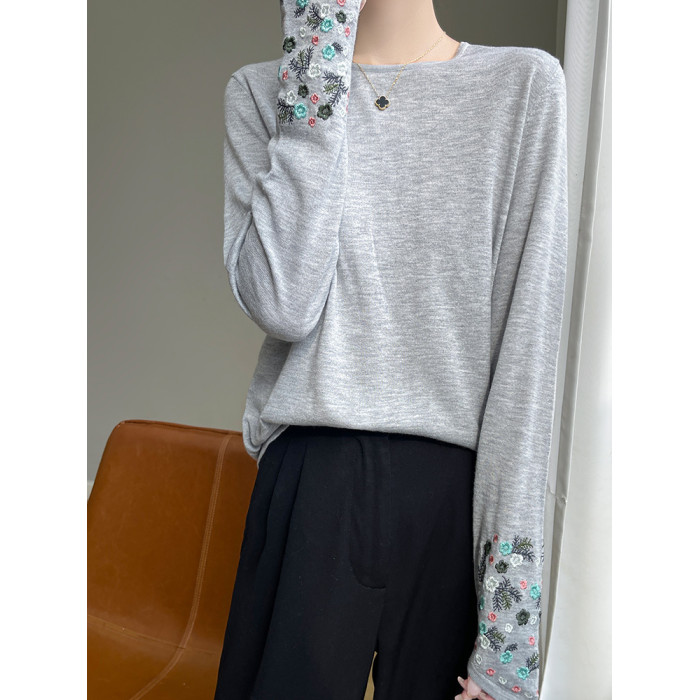 春秋圓領薄款精紡羊毛針織打底衫女袖口刺綉蠶絲長袖上衣粉色內搭