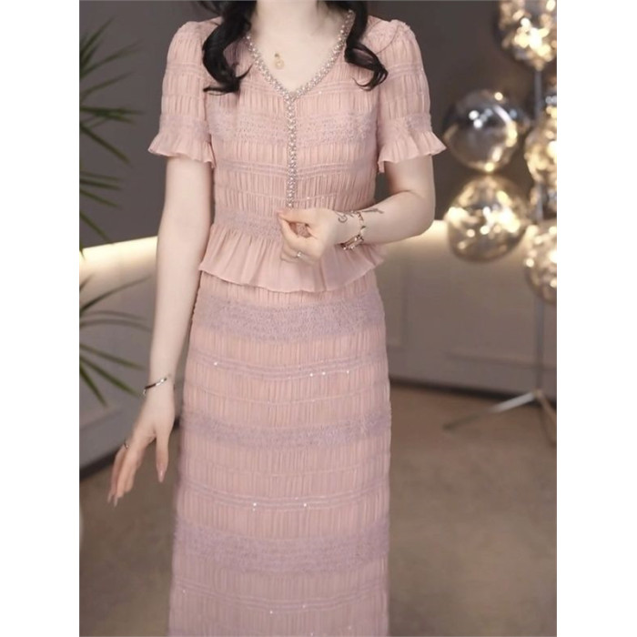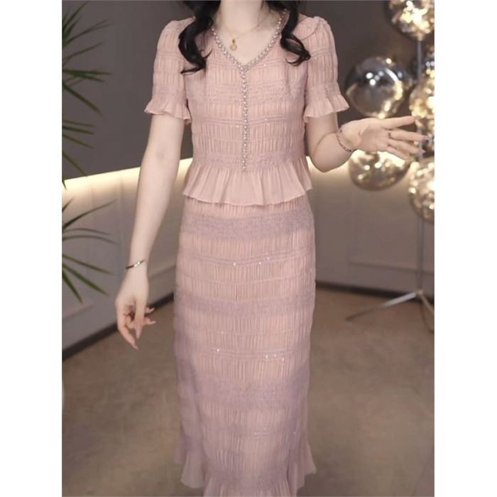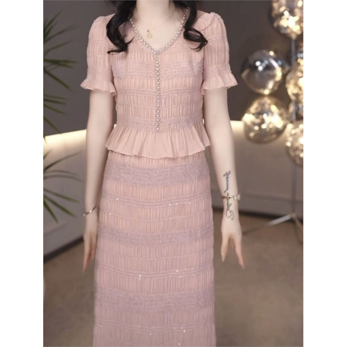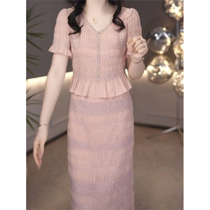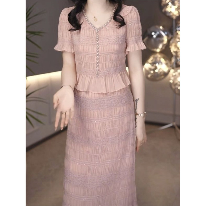 高檔冰絲面料短袖連衣裙女夏季2025新款時尚氣質顯瘦假兩件禮服裙