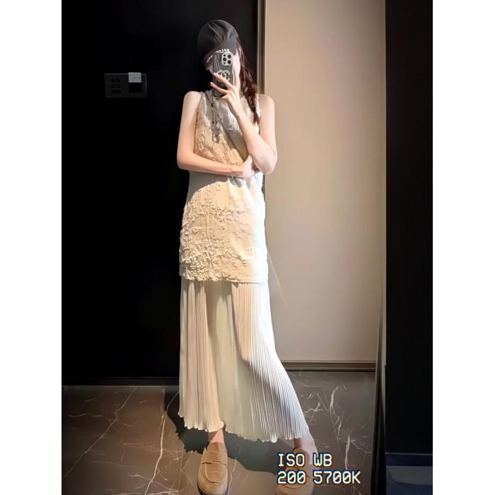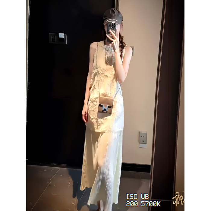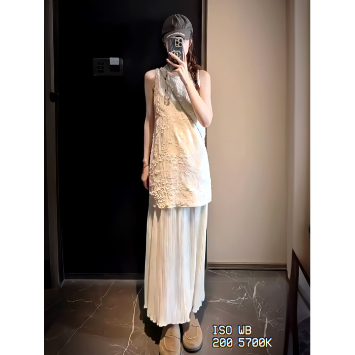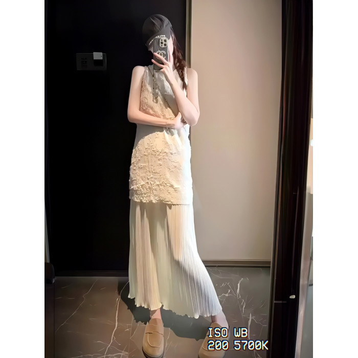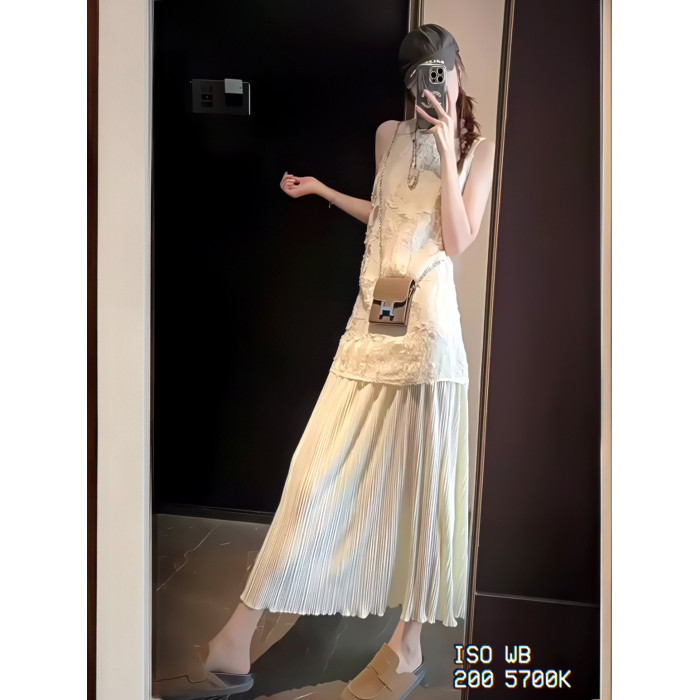 2025法式度假風假兩件拼接背心連衣裙女小衆重工壓褶絕美長裙