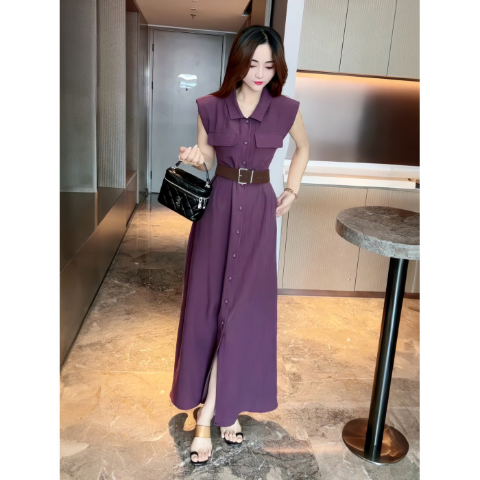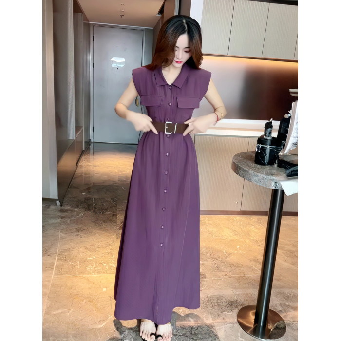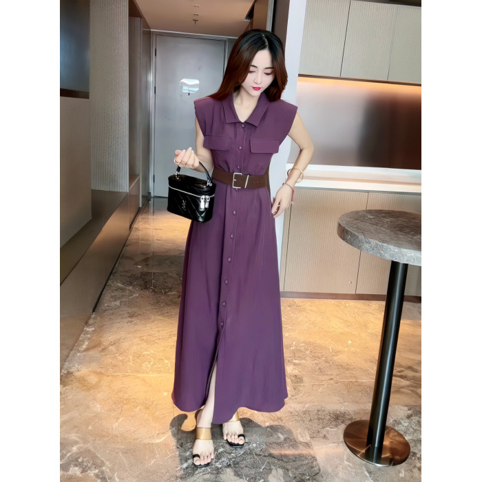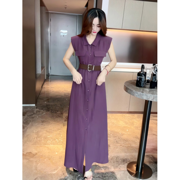 紫色無袖襯衫連衣裙帶墊肩設計女夏季2025新款復古寬皮帶收腰長裙