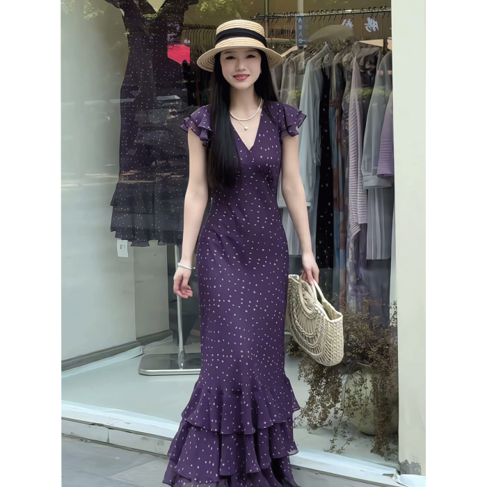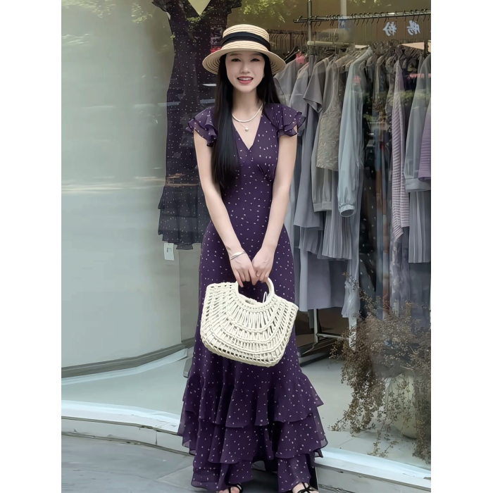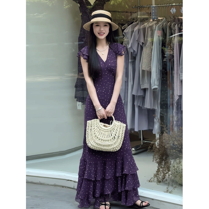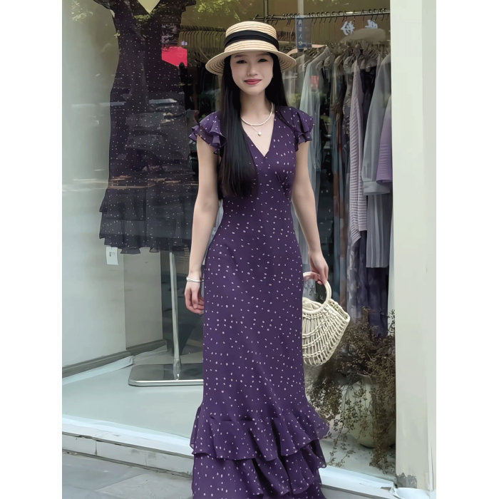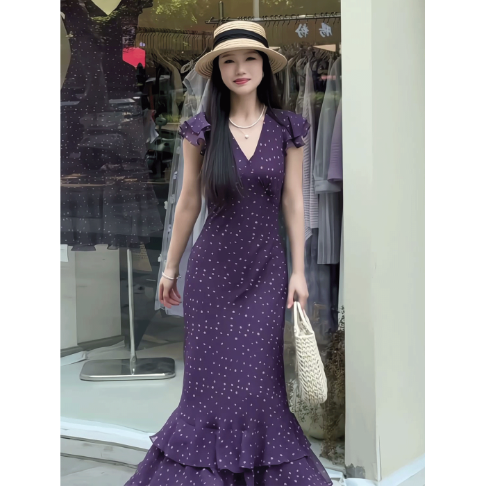 紫色波點連衣裙女夏季2025年新款法式高級感氣質荷葉邊小飛袖長裙
