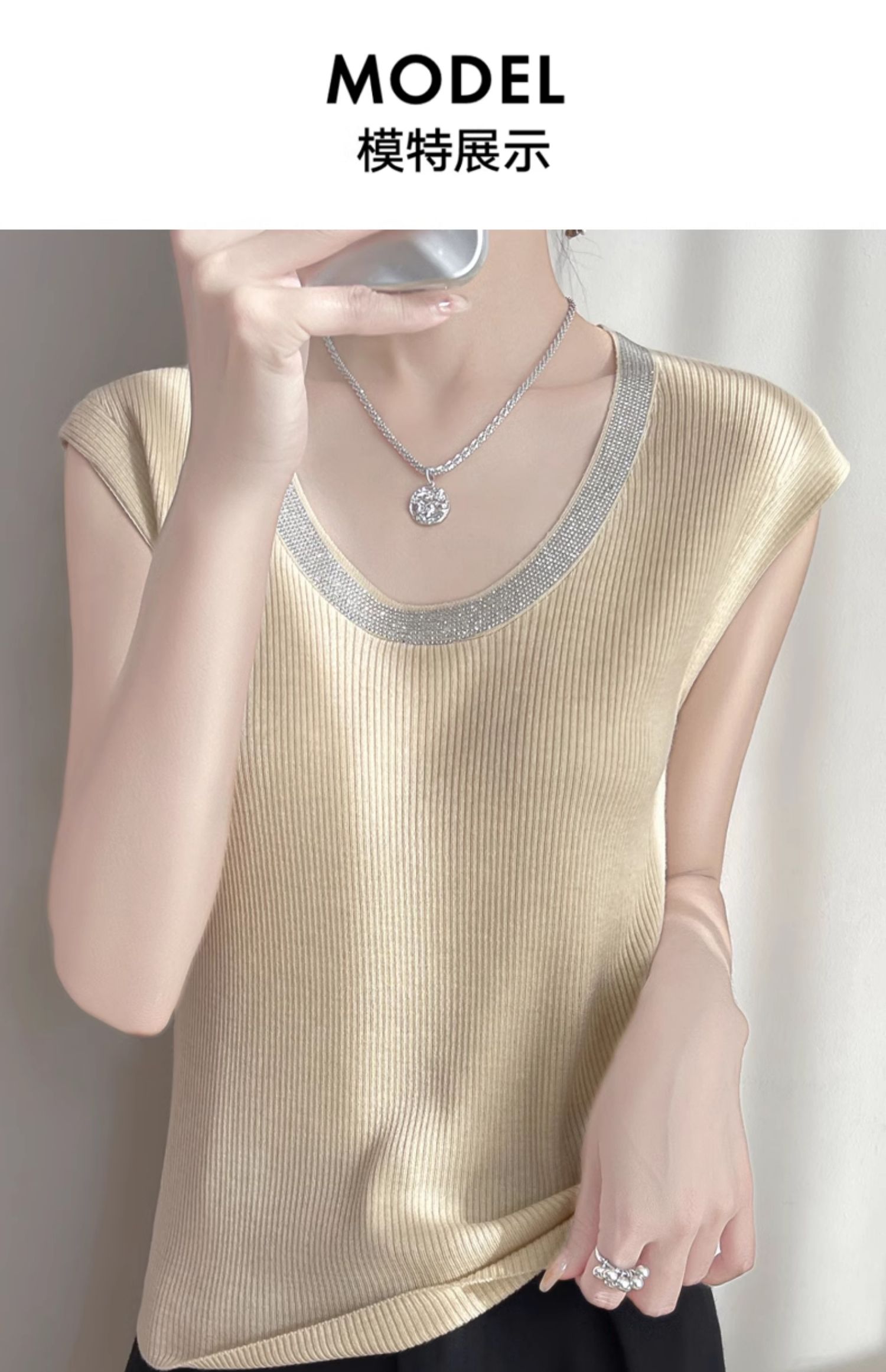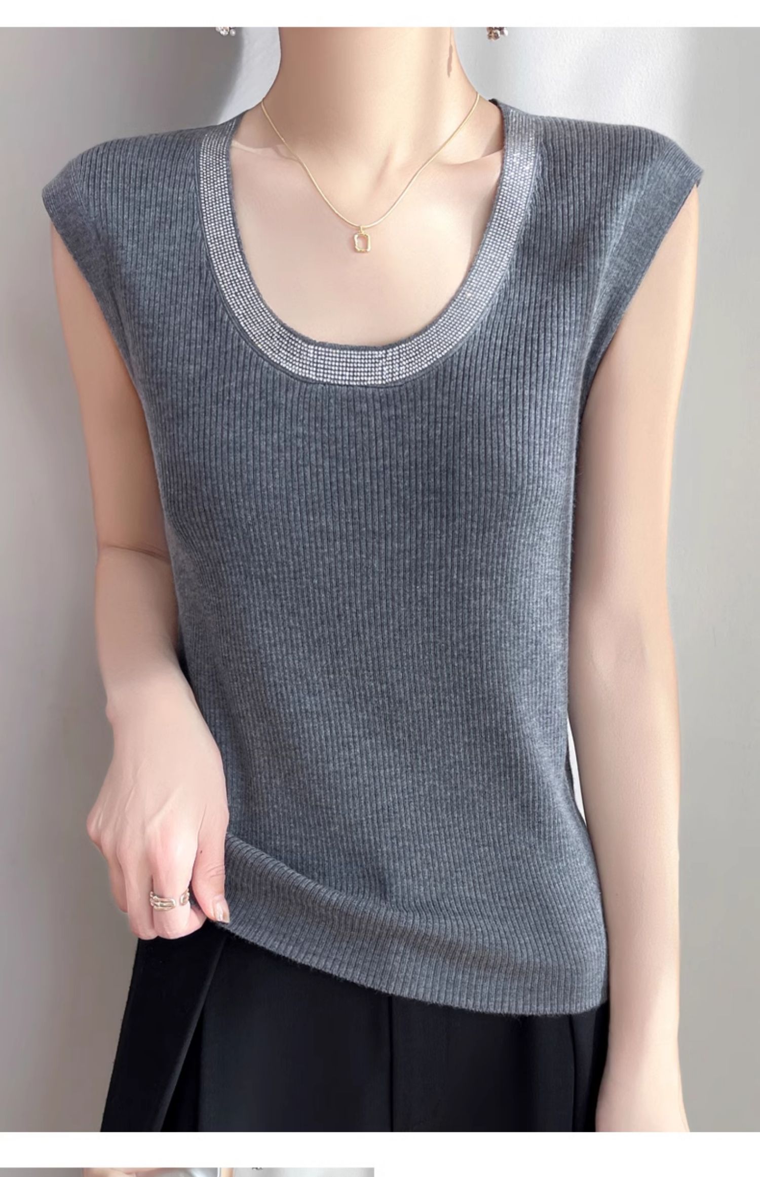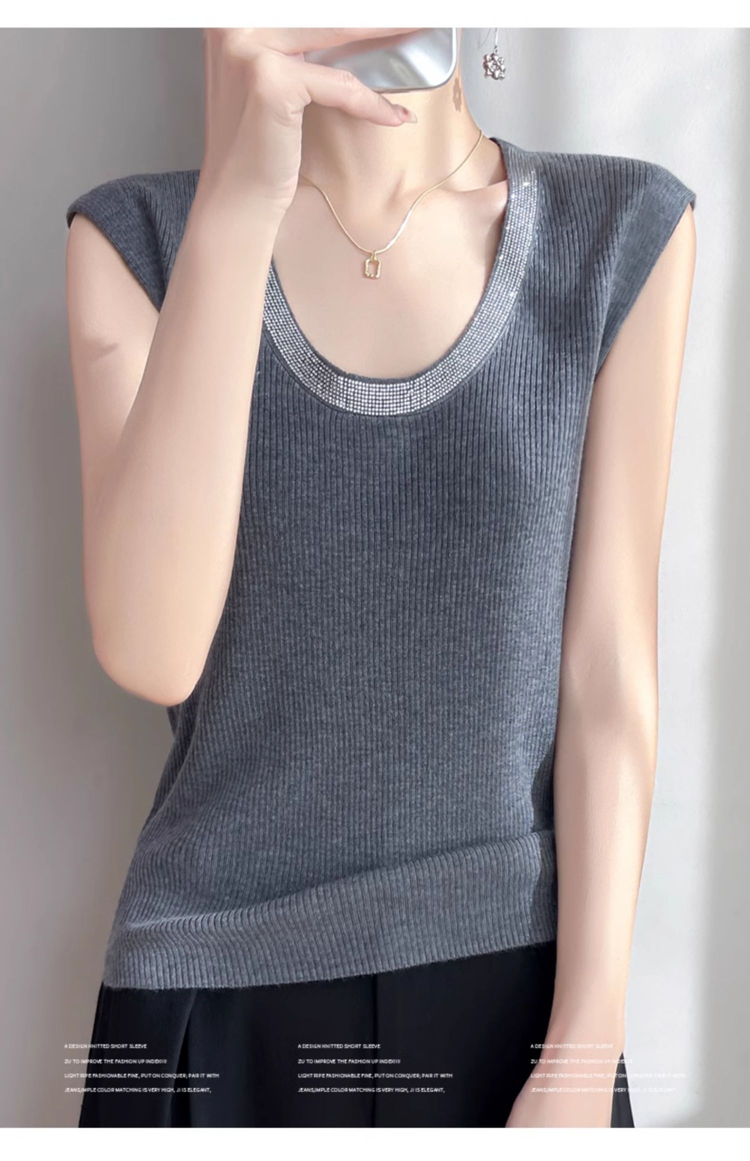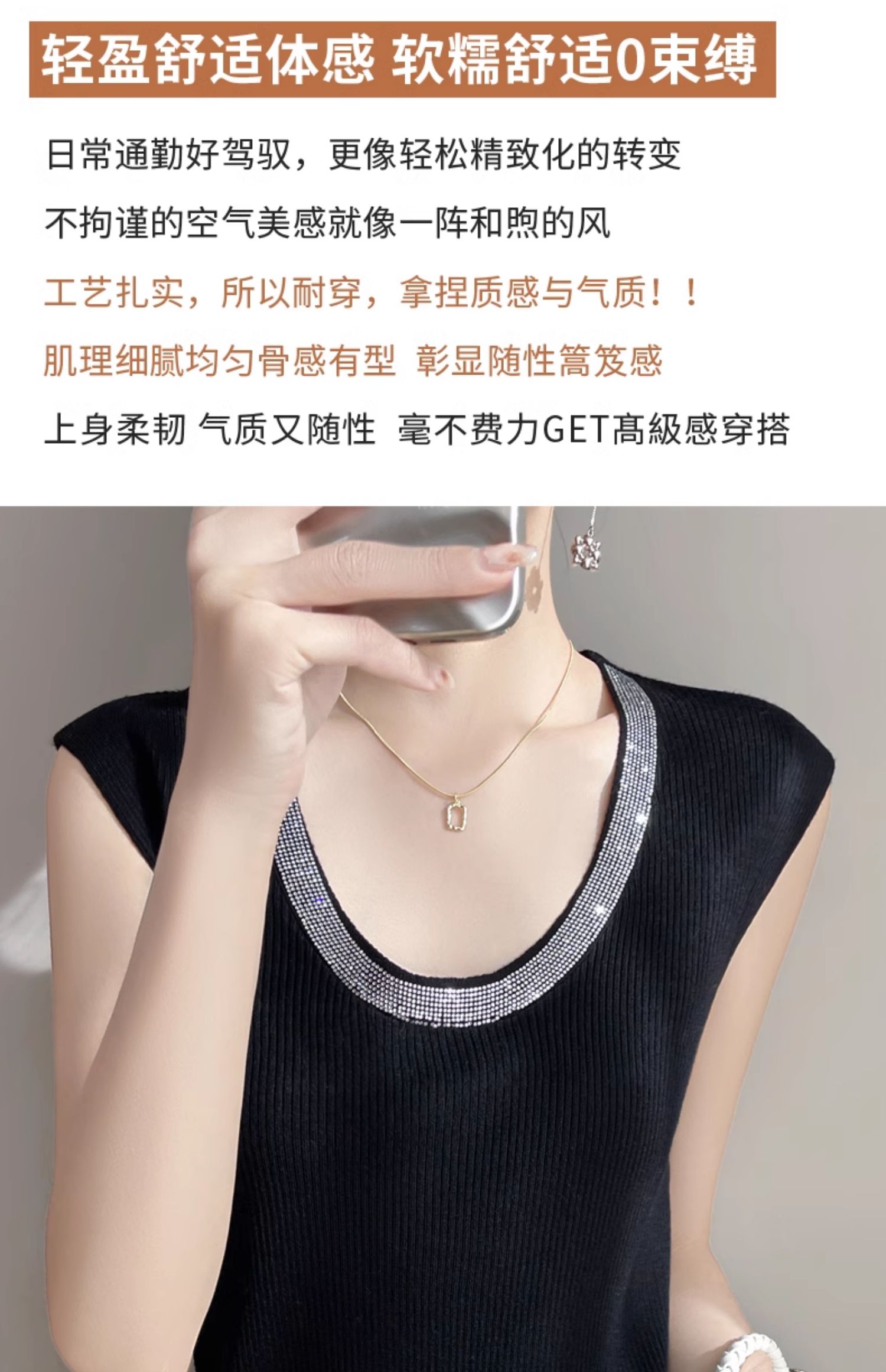 2025新款灰色坎肩燙鑽無袖背心針織打底衫女春夏大碼女裝夏季上衣