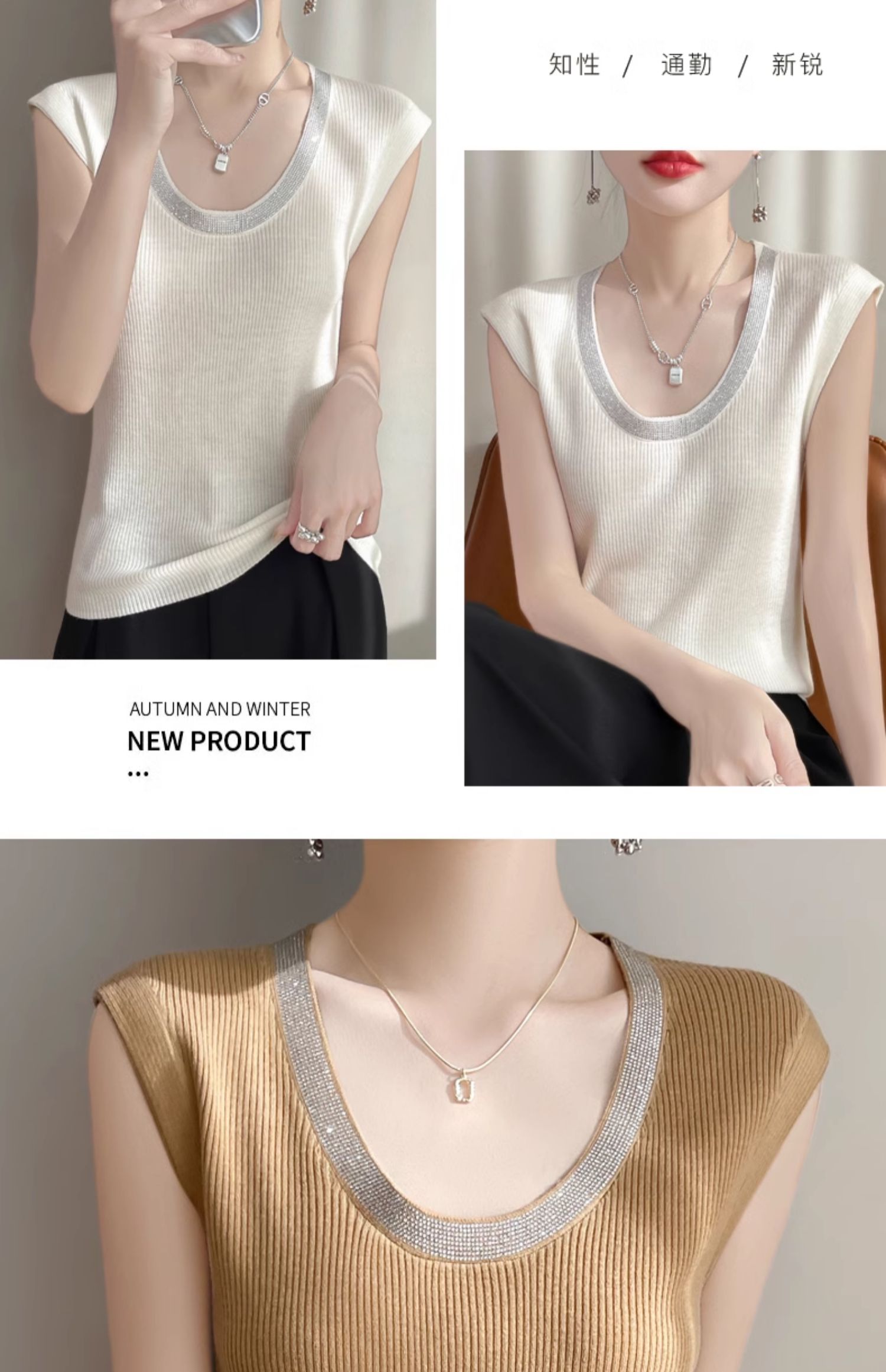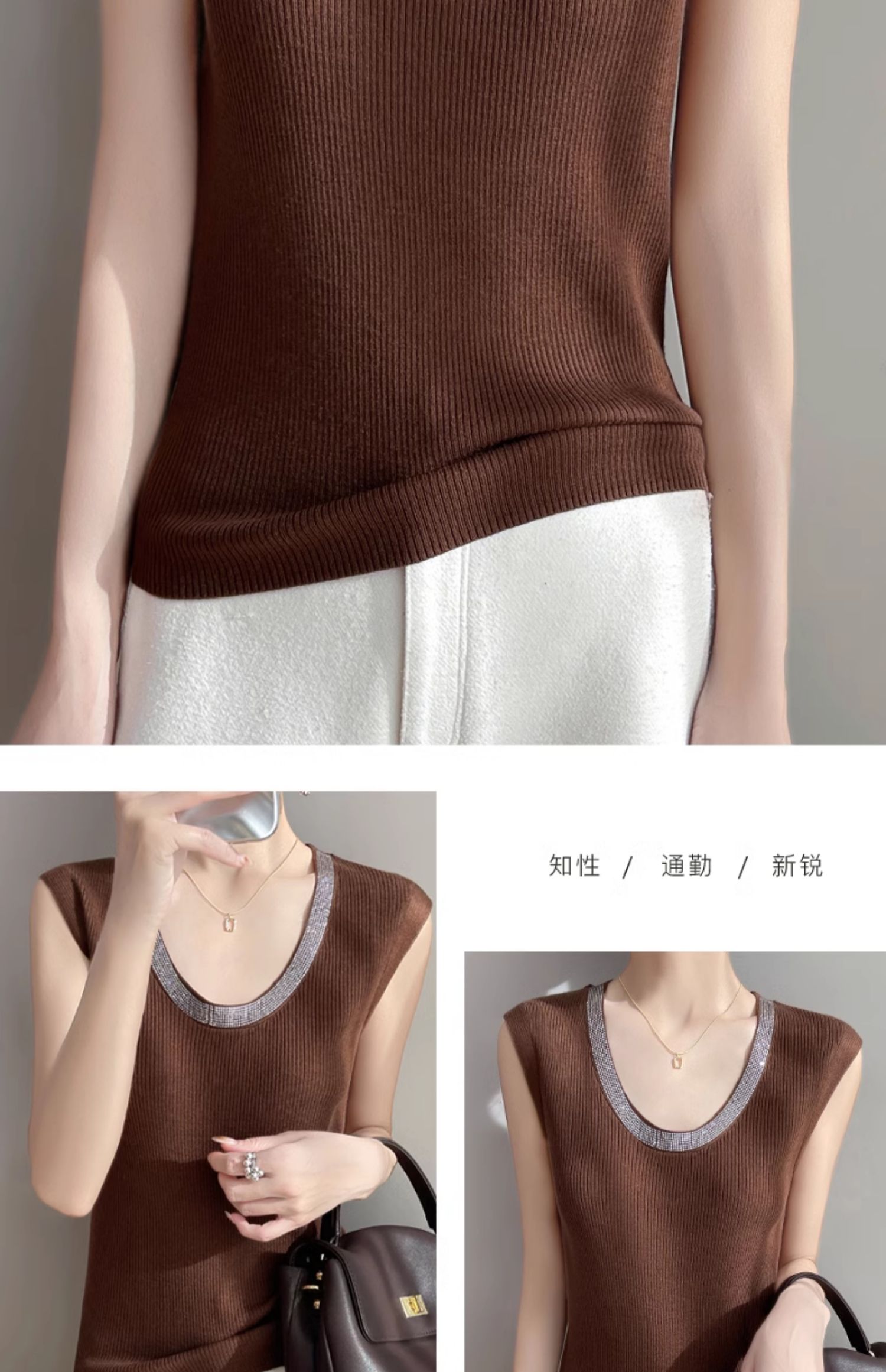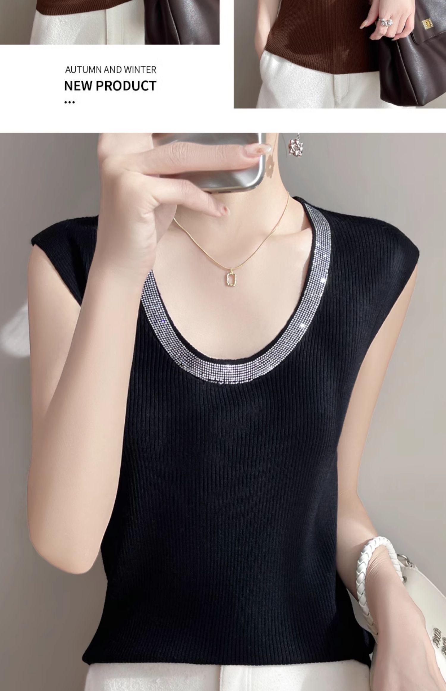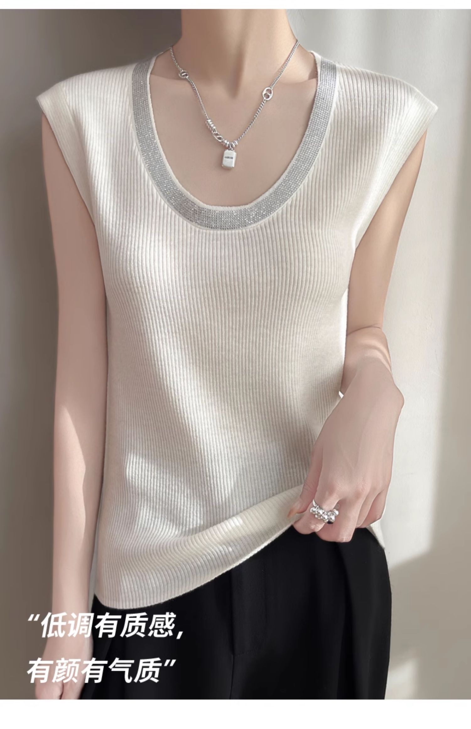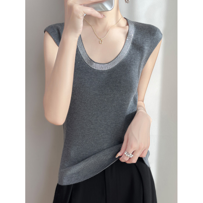 2025新款灰色坎肩燙鑽無袖背心針織打底衫女春夏大碼女裝夏季上衣