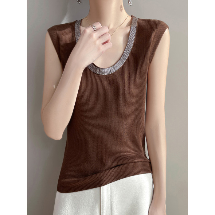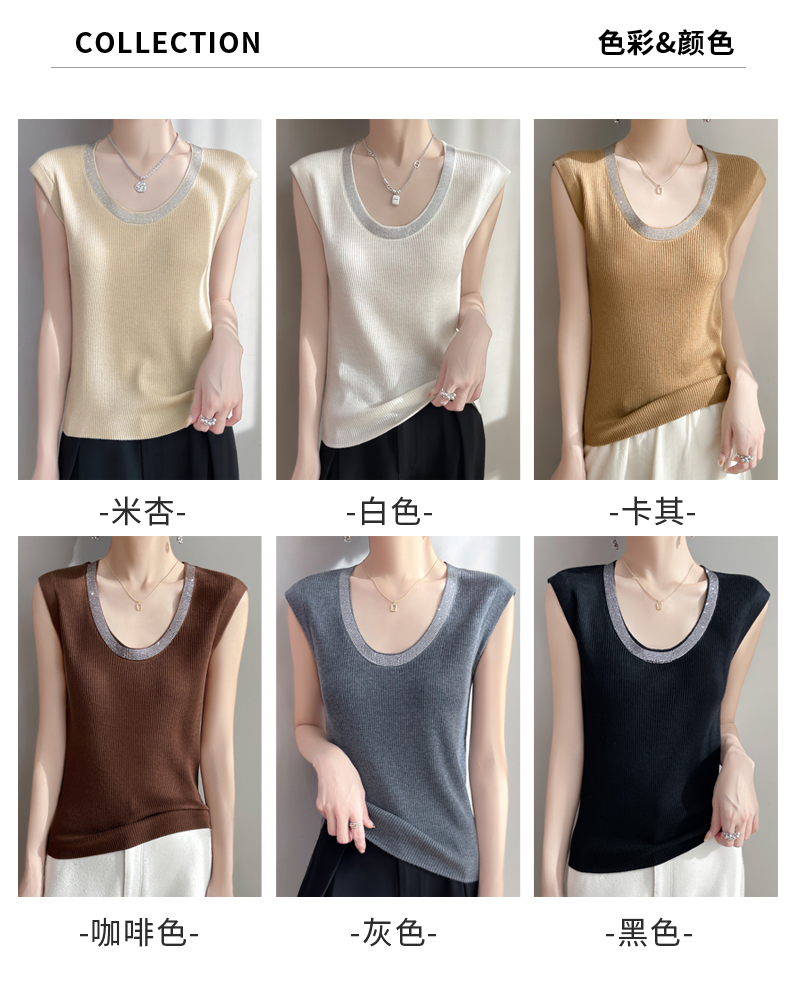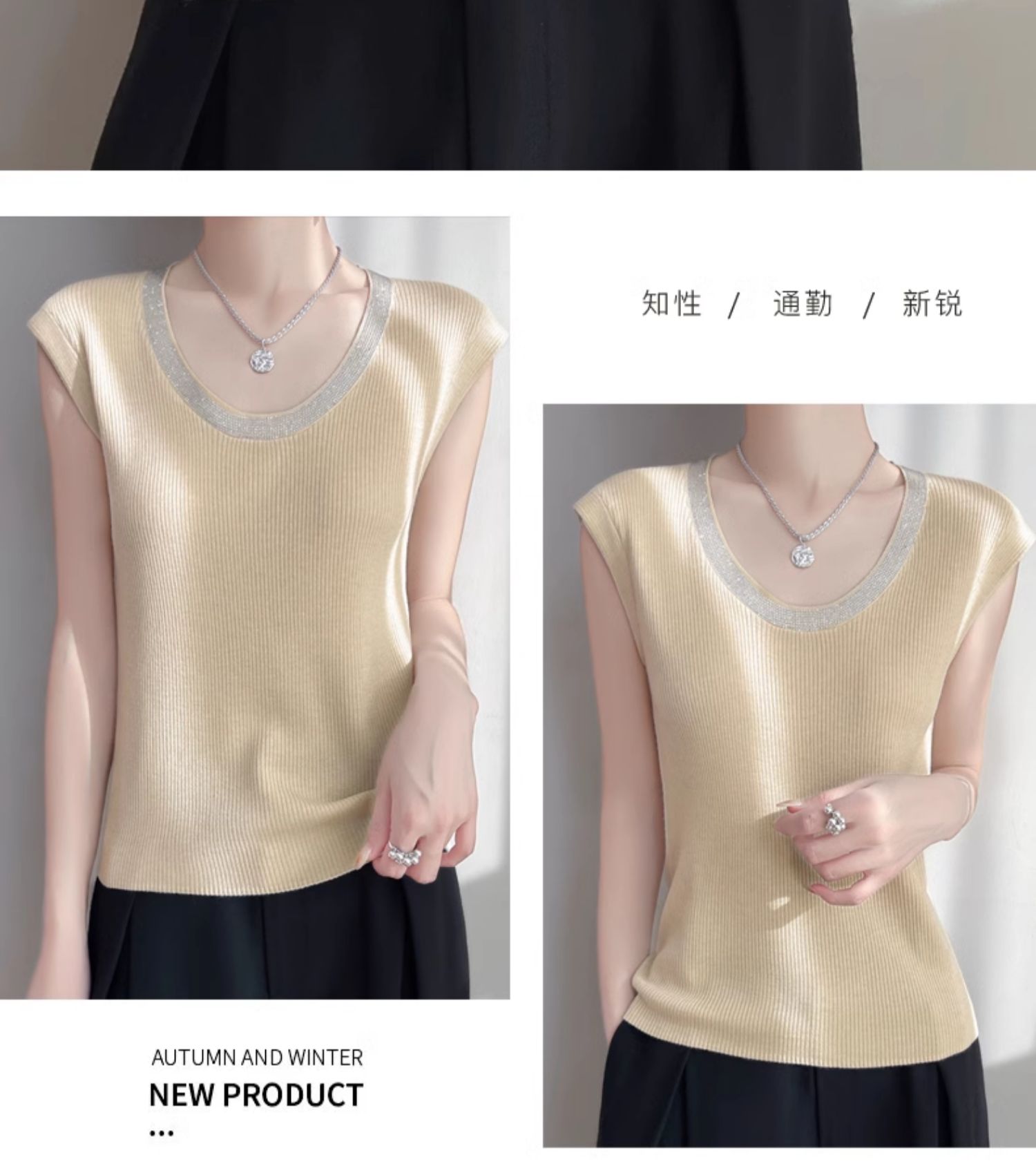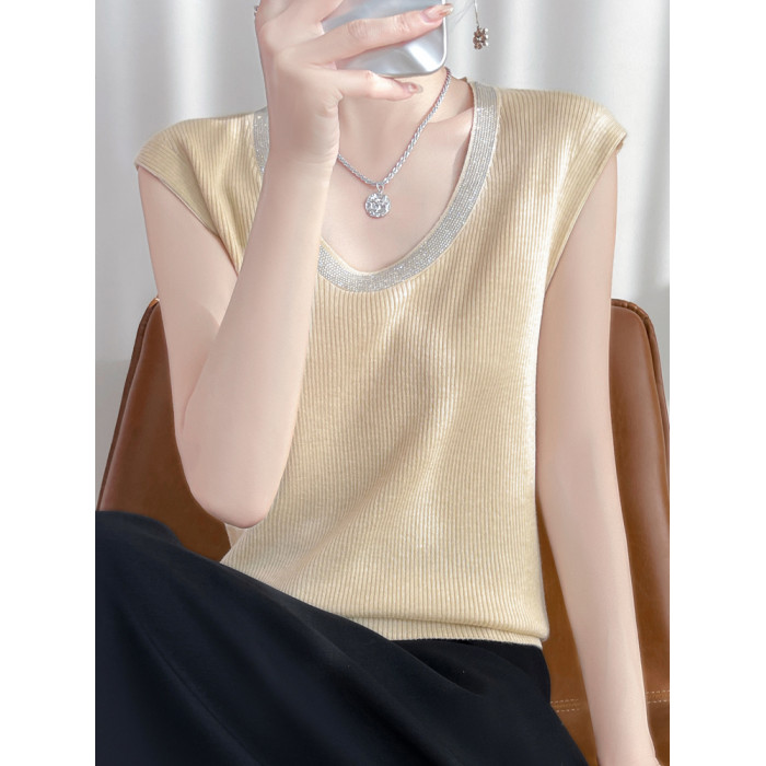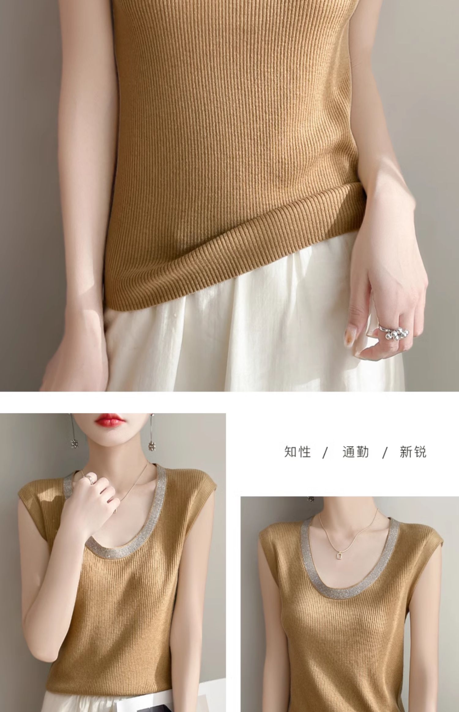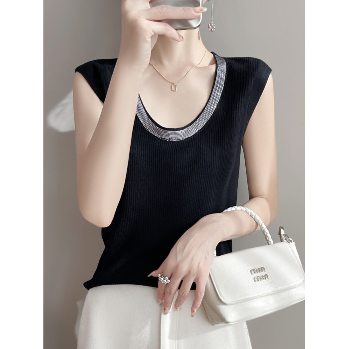 2025新款灰色坎肩燙鑽無袖背心針織打底衫女春夏大碼女裝夏季上衣