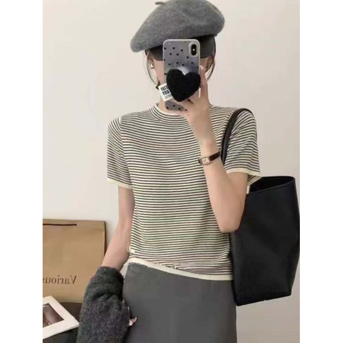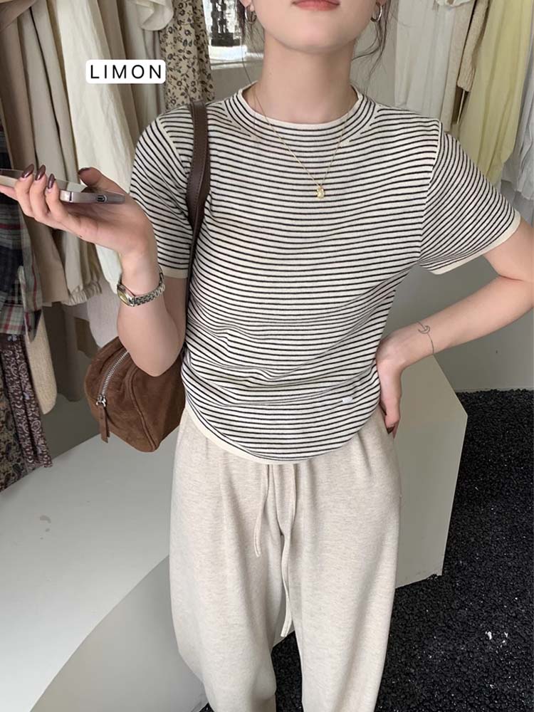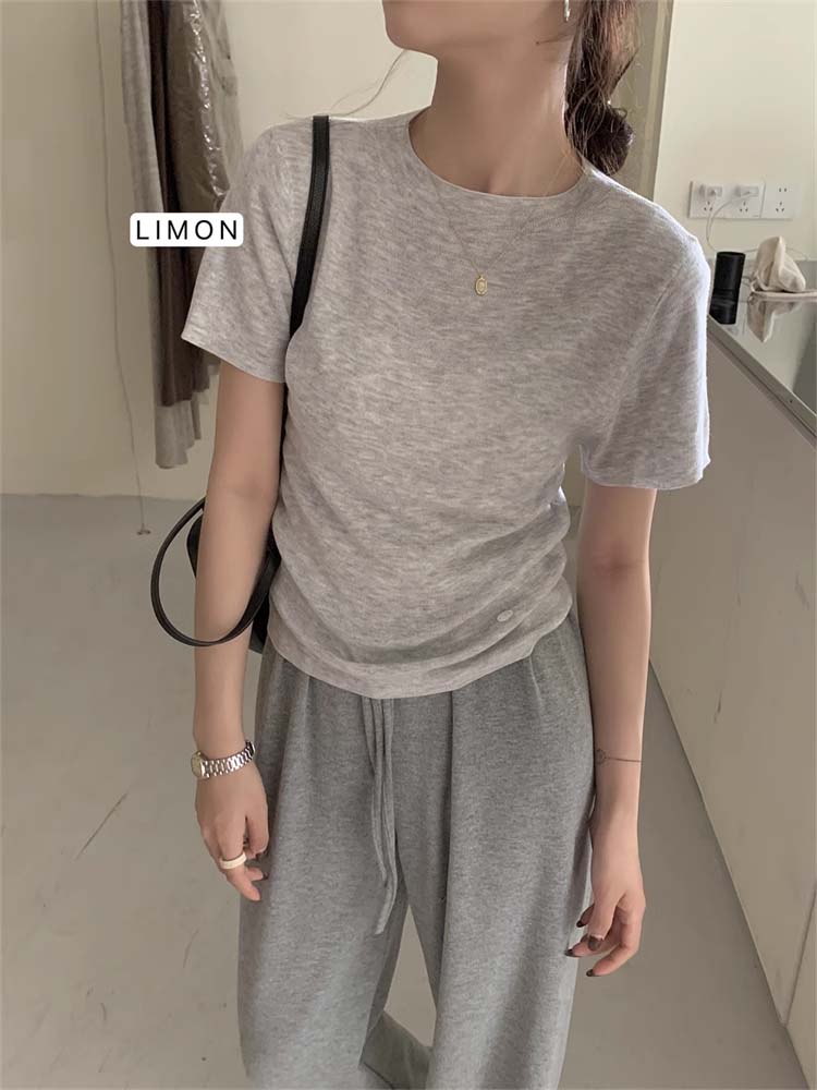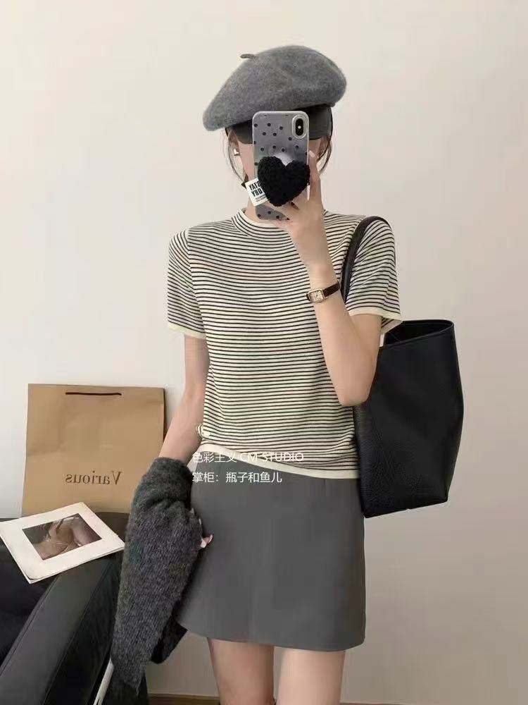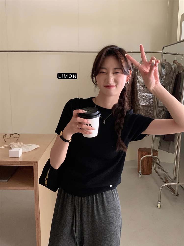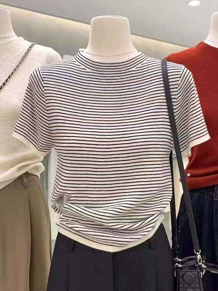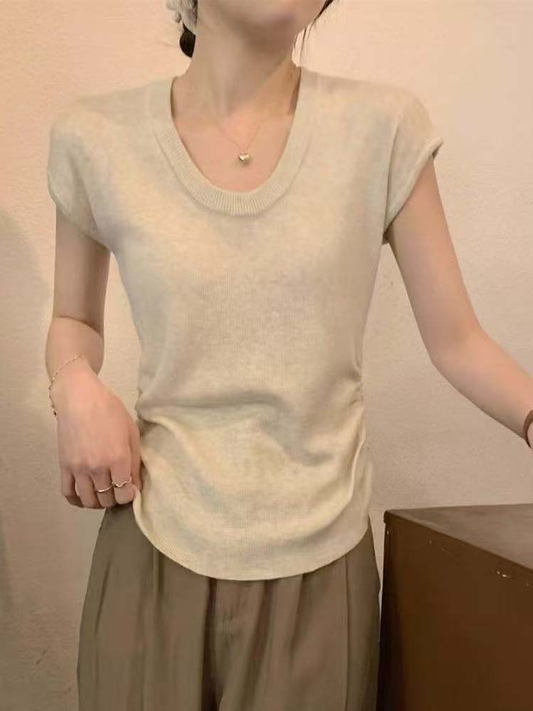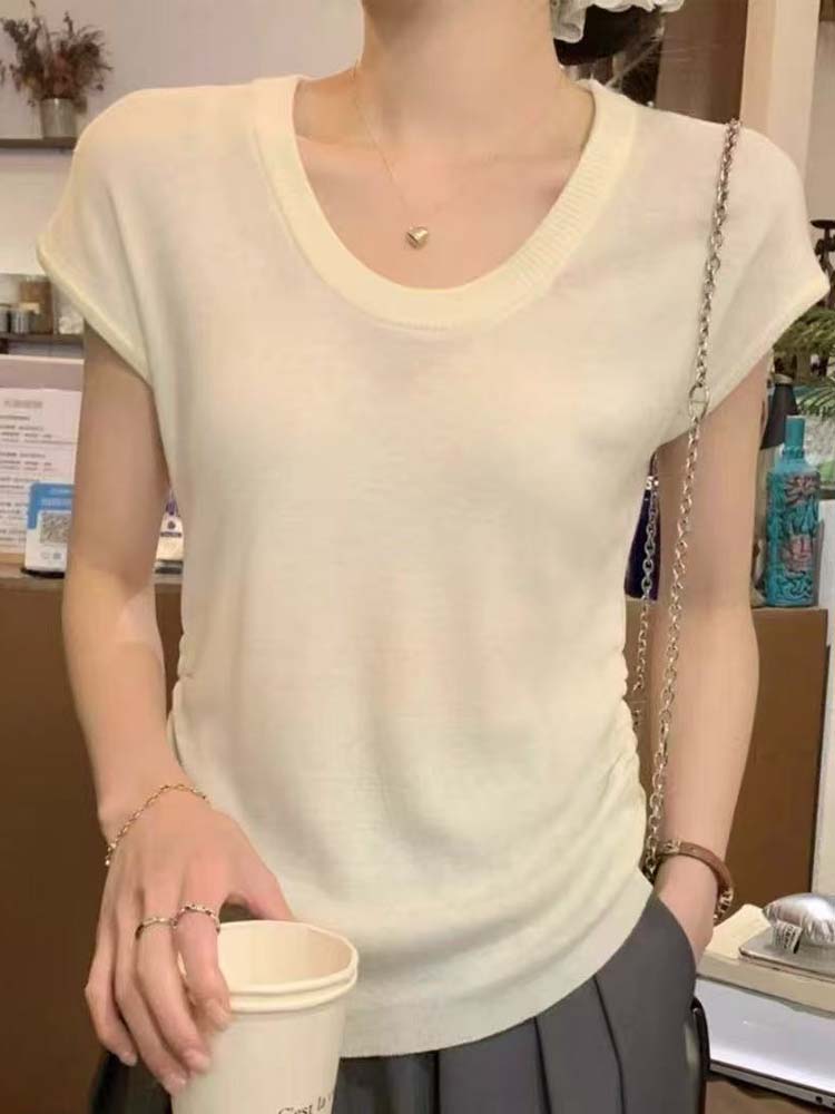韓版休閒設計感收腰顯瘦短袖針織衫2025夏季內搭圓領套頭打底衫女