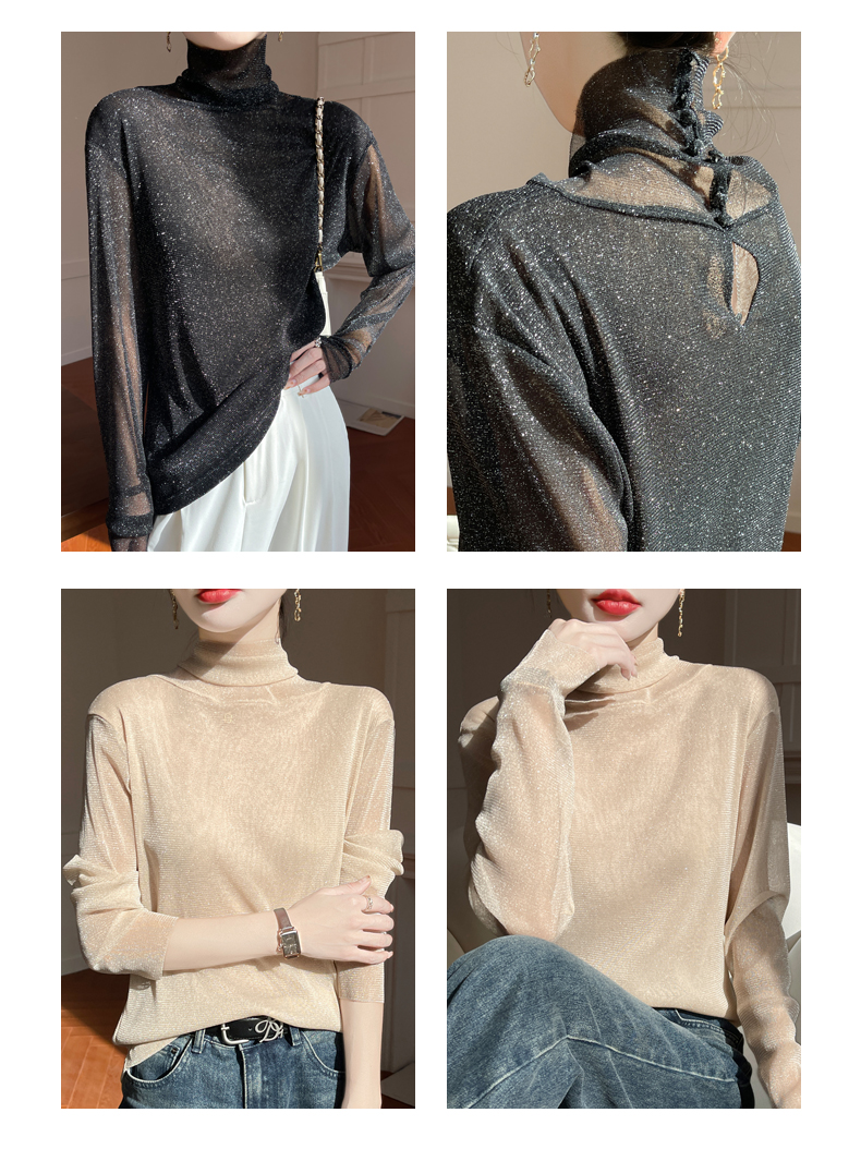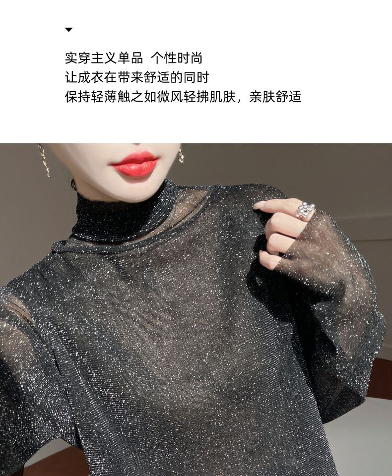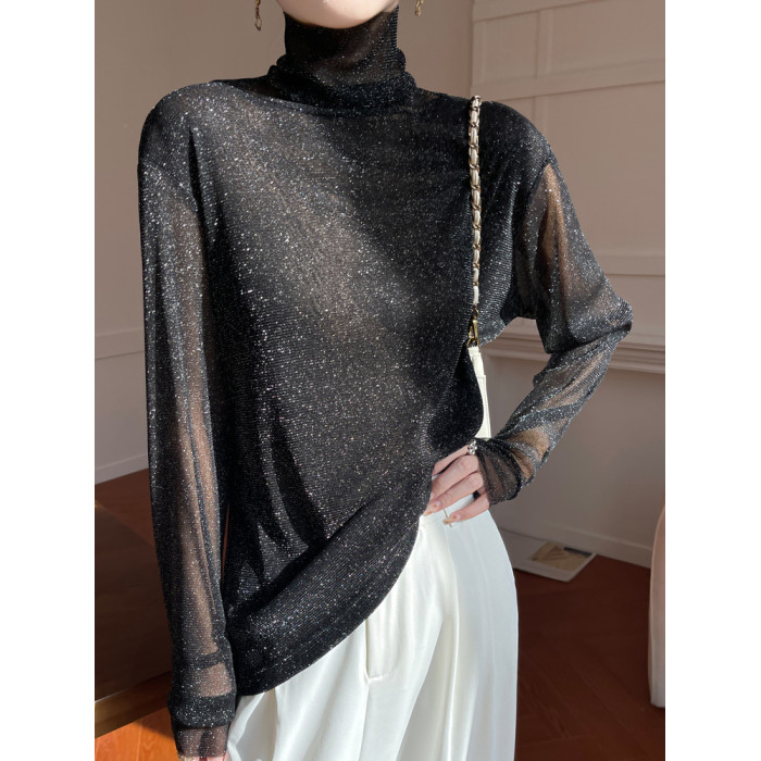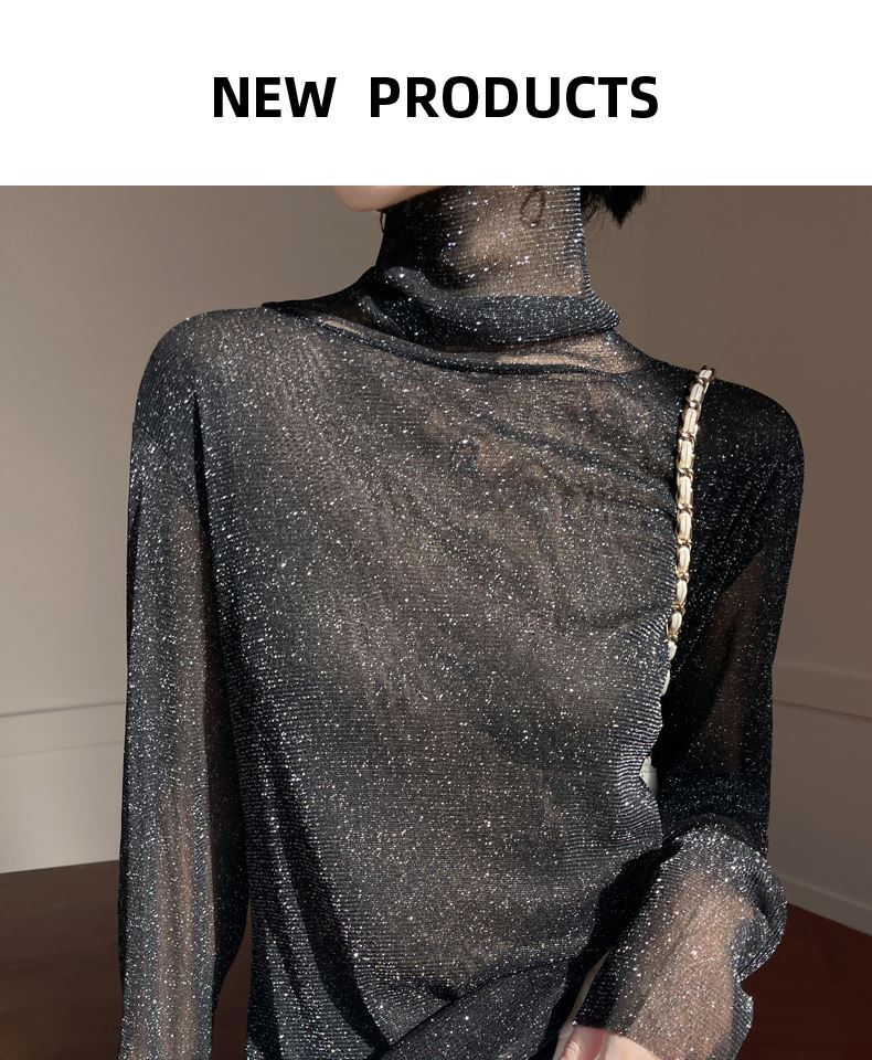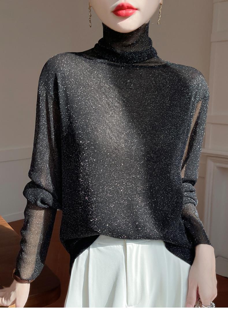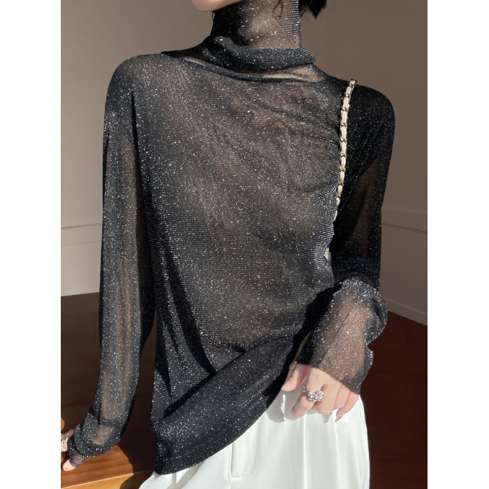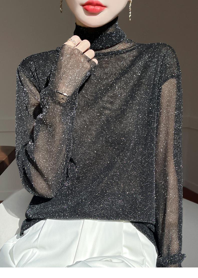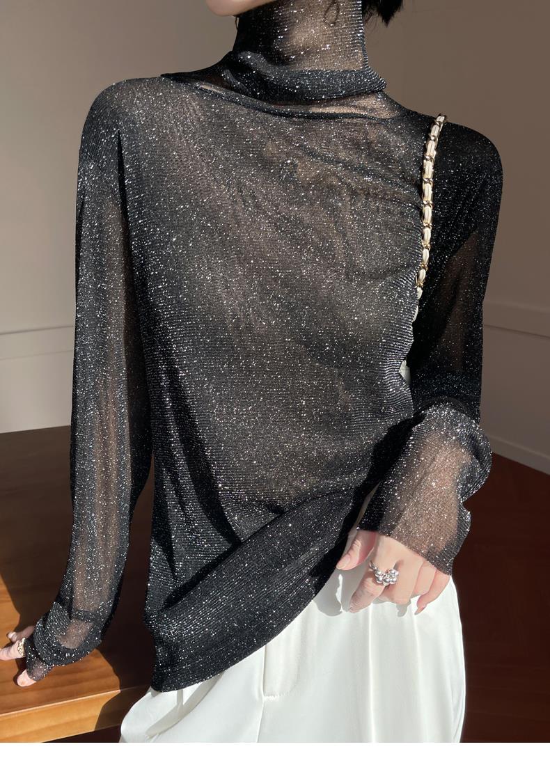 黑色高領打底衫女春夏薄款內搭亮片堆堆領針織衫微透內透網紗上衣