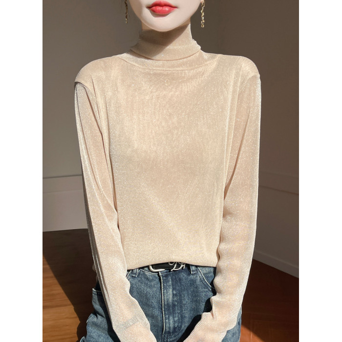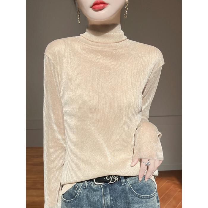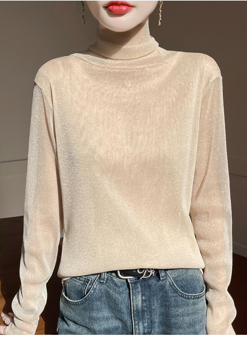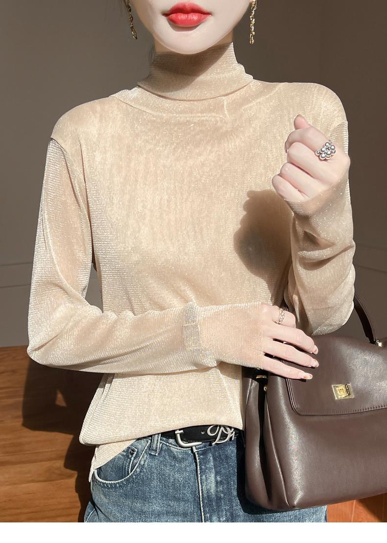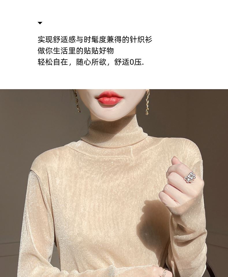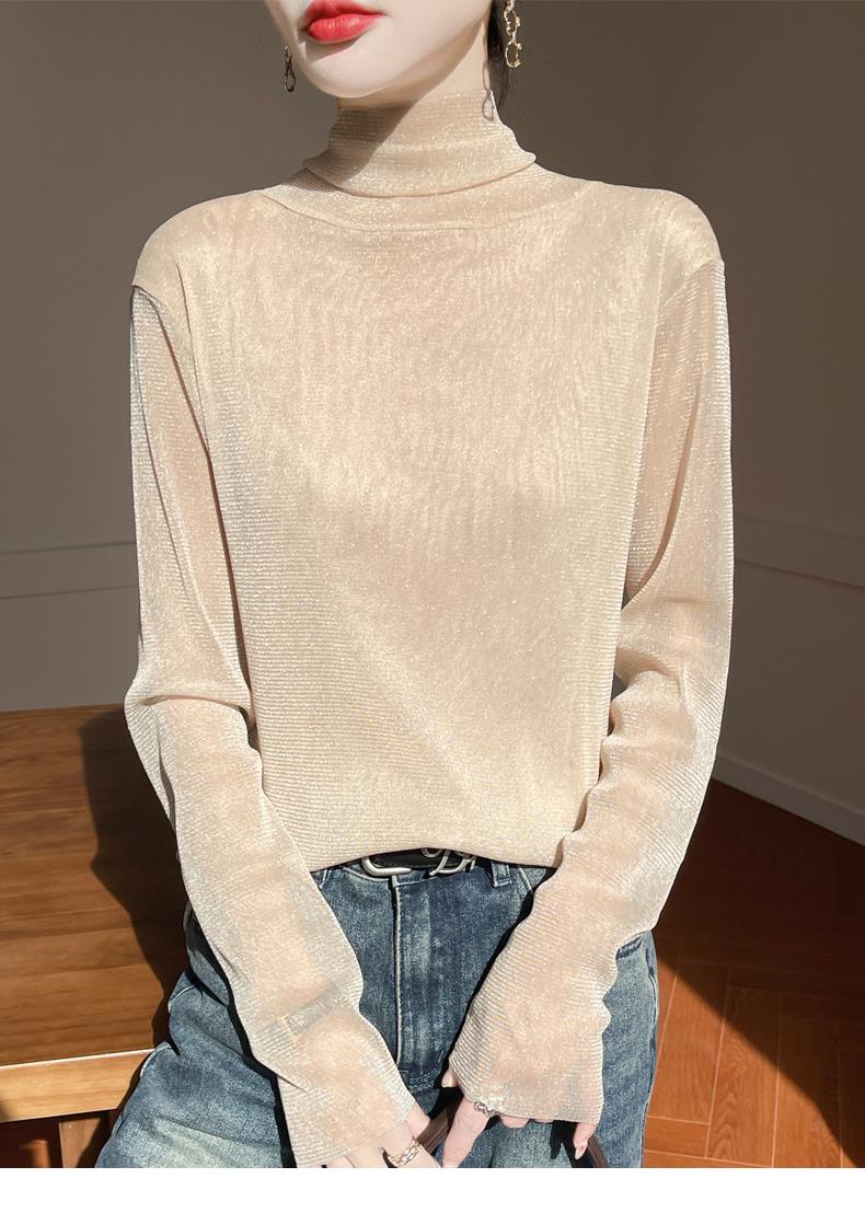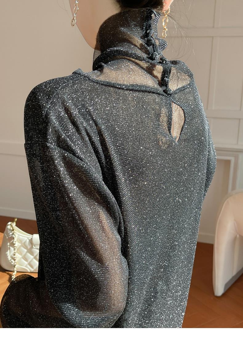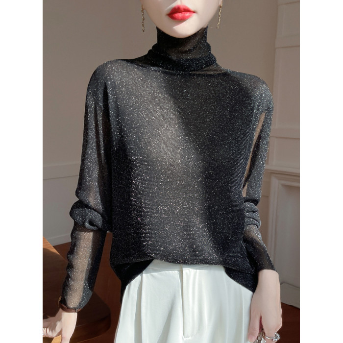 黑色高領打底衫女春夏薄款內搭亮片堆堆領針織衫微透內透網紗上衣