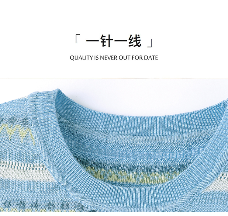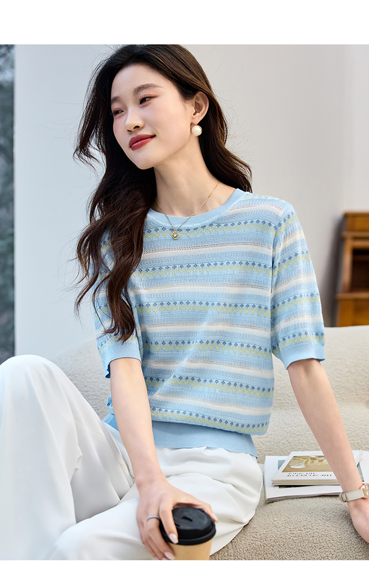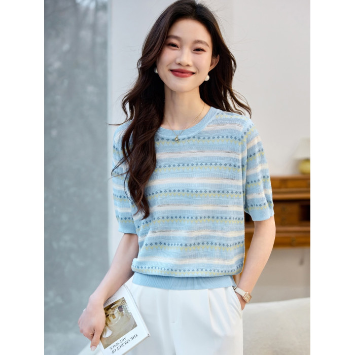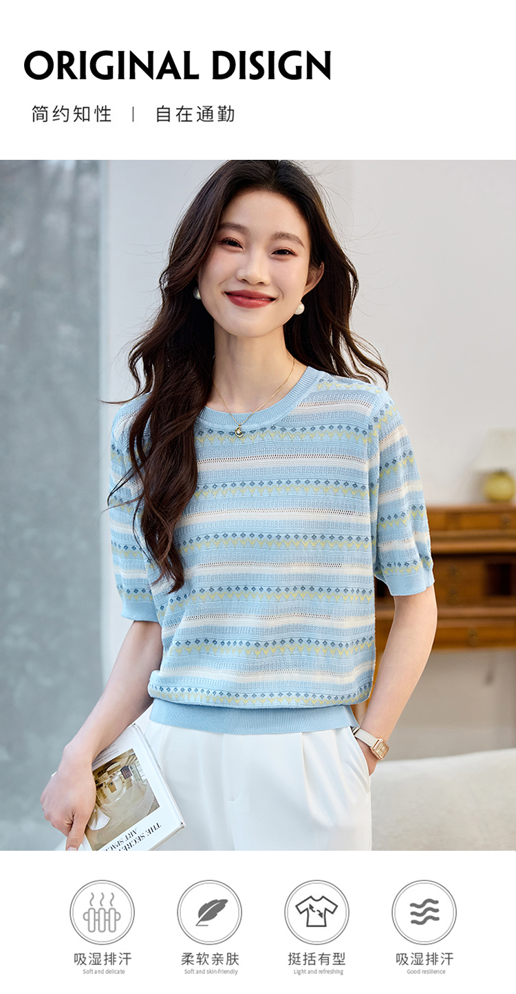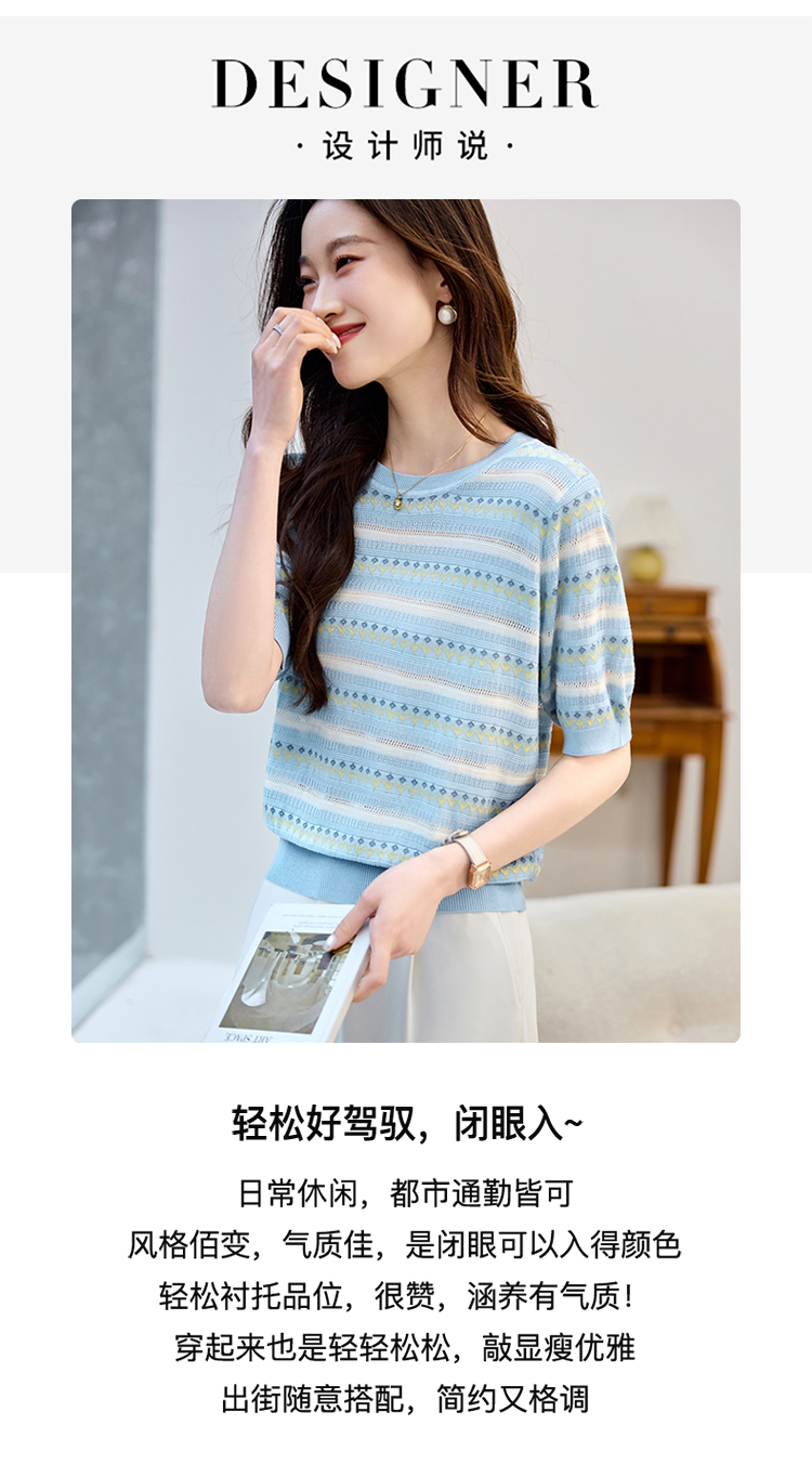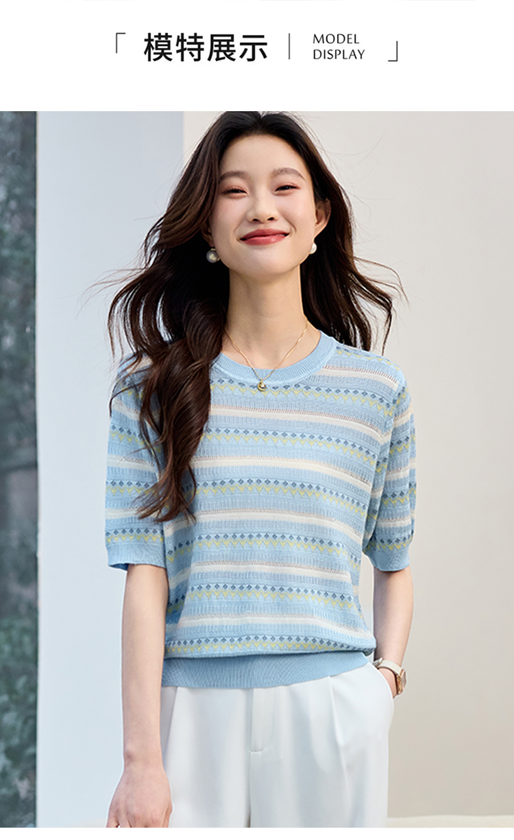 圓領冰絲針織衫女2025新款寬松短袖t恤薄款小香風上衣條紋打底衫