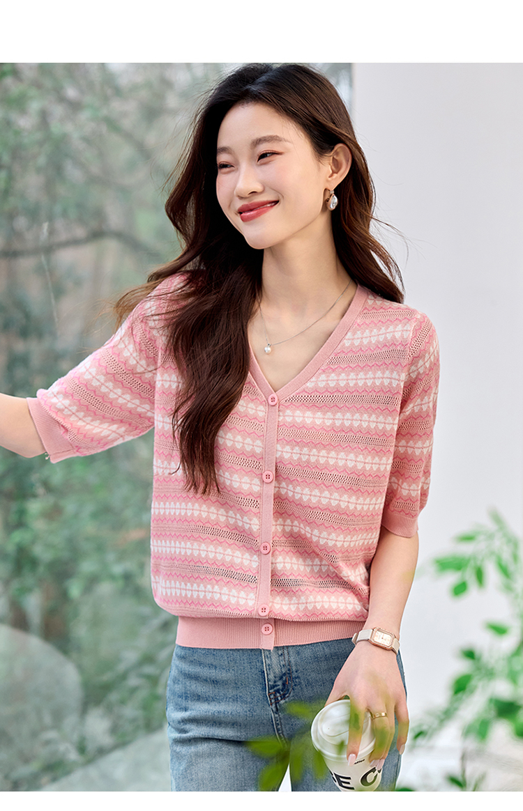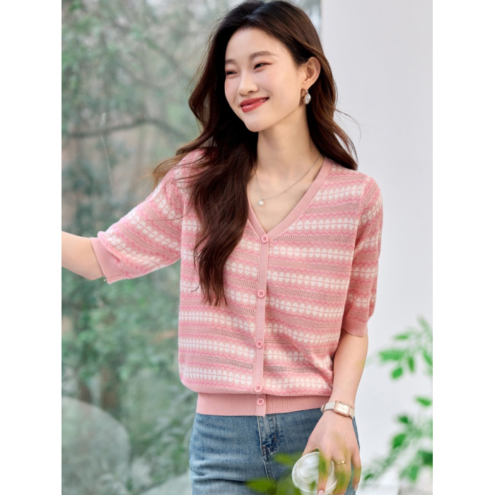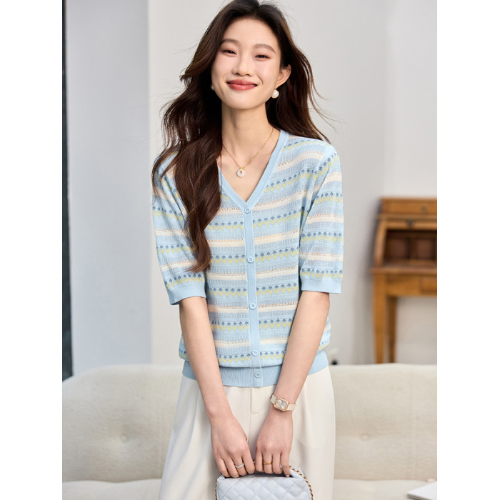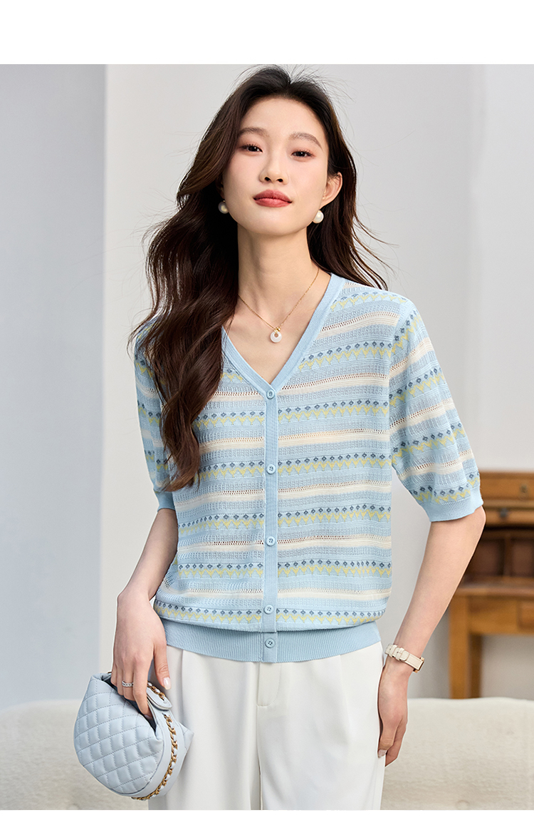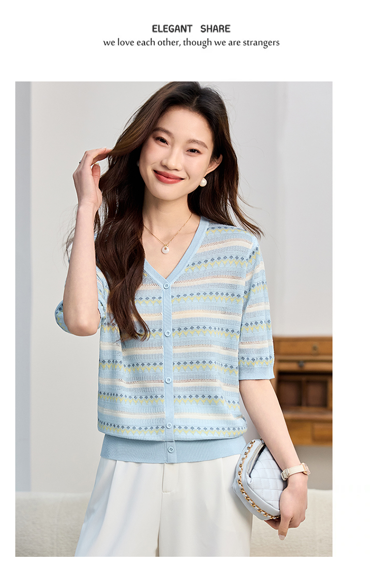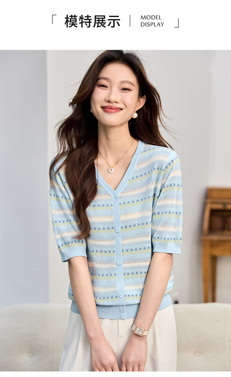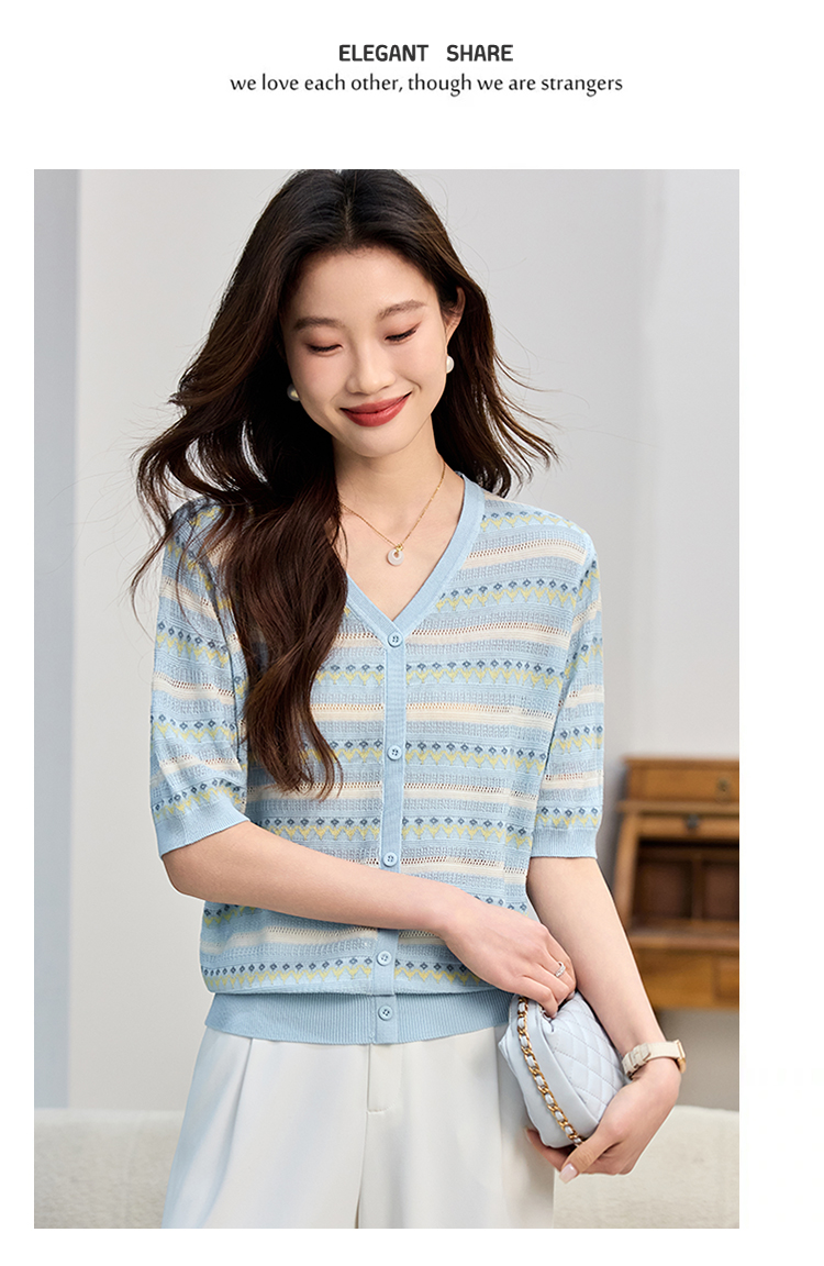 圓領冰絲針織衫女2025新款寬松短袖t恤薄款小香風上衣條紋打底衫