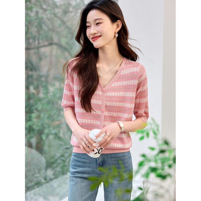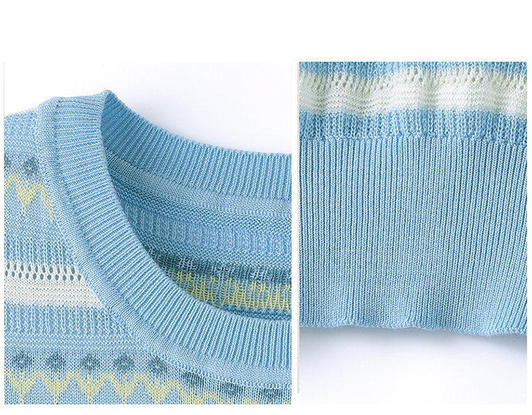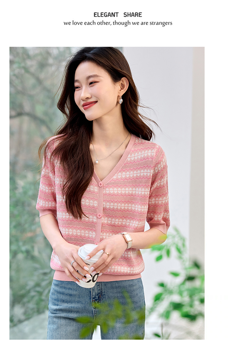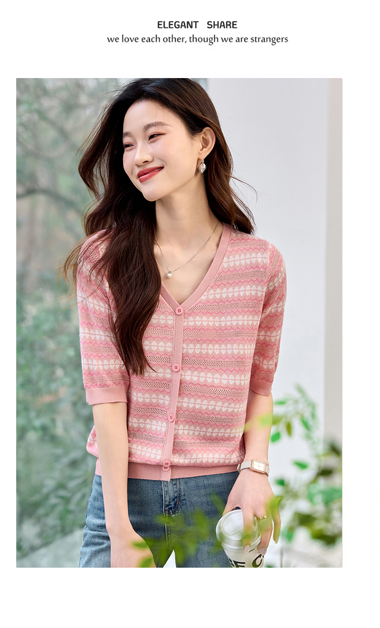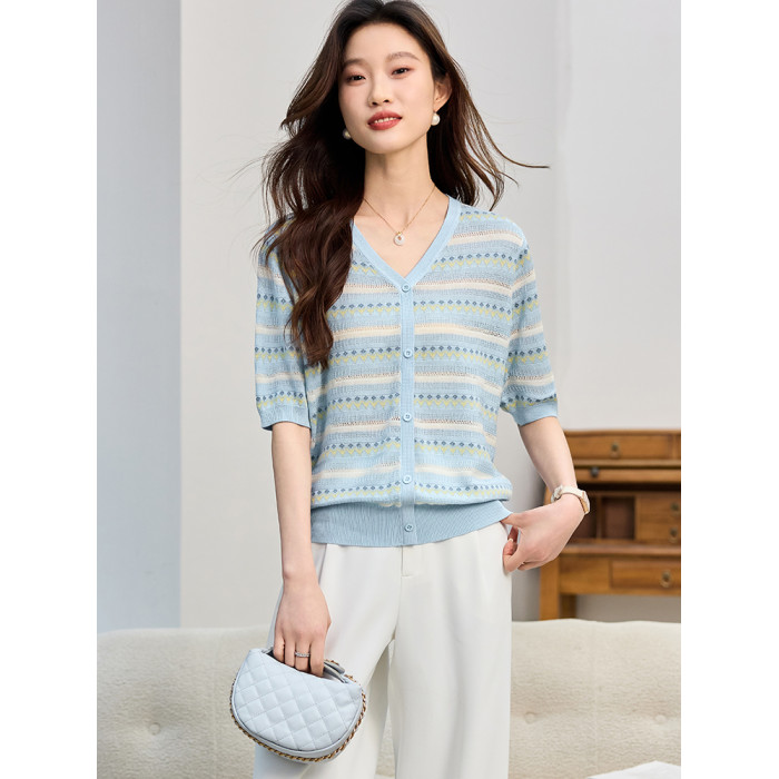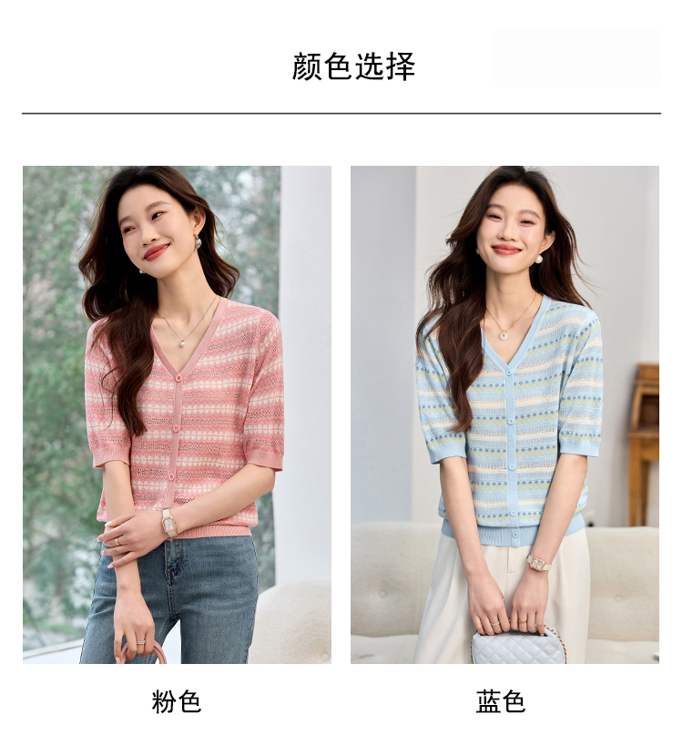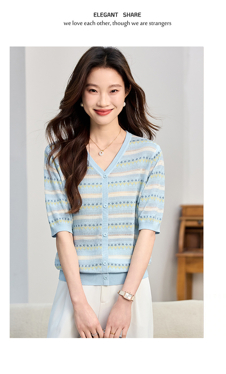 圓領冰絲針織衫女2025新款寬松短袖t恤薄款小香風上衣條紋打底衫