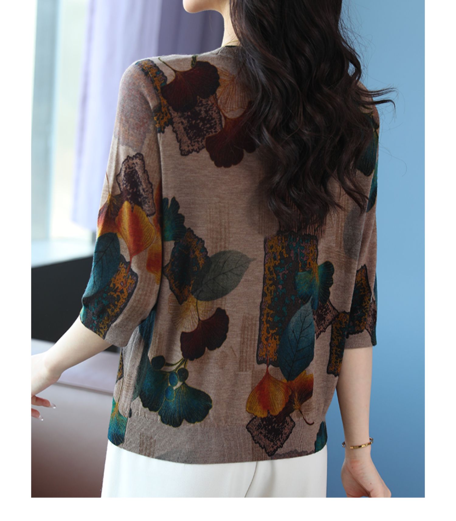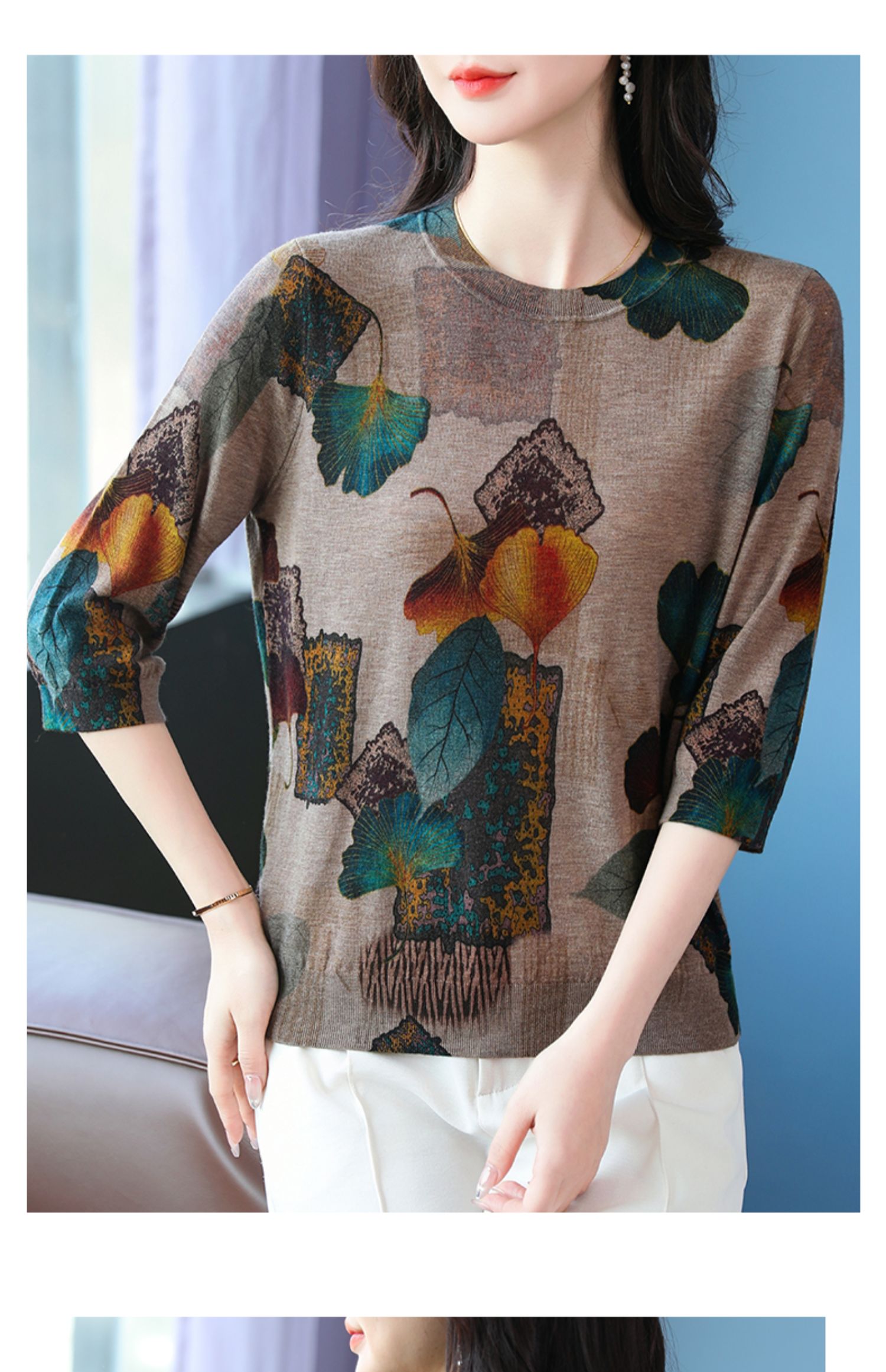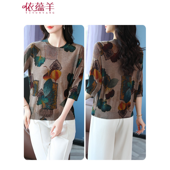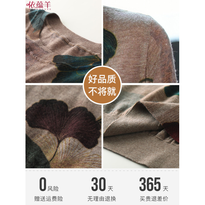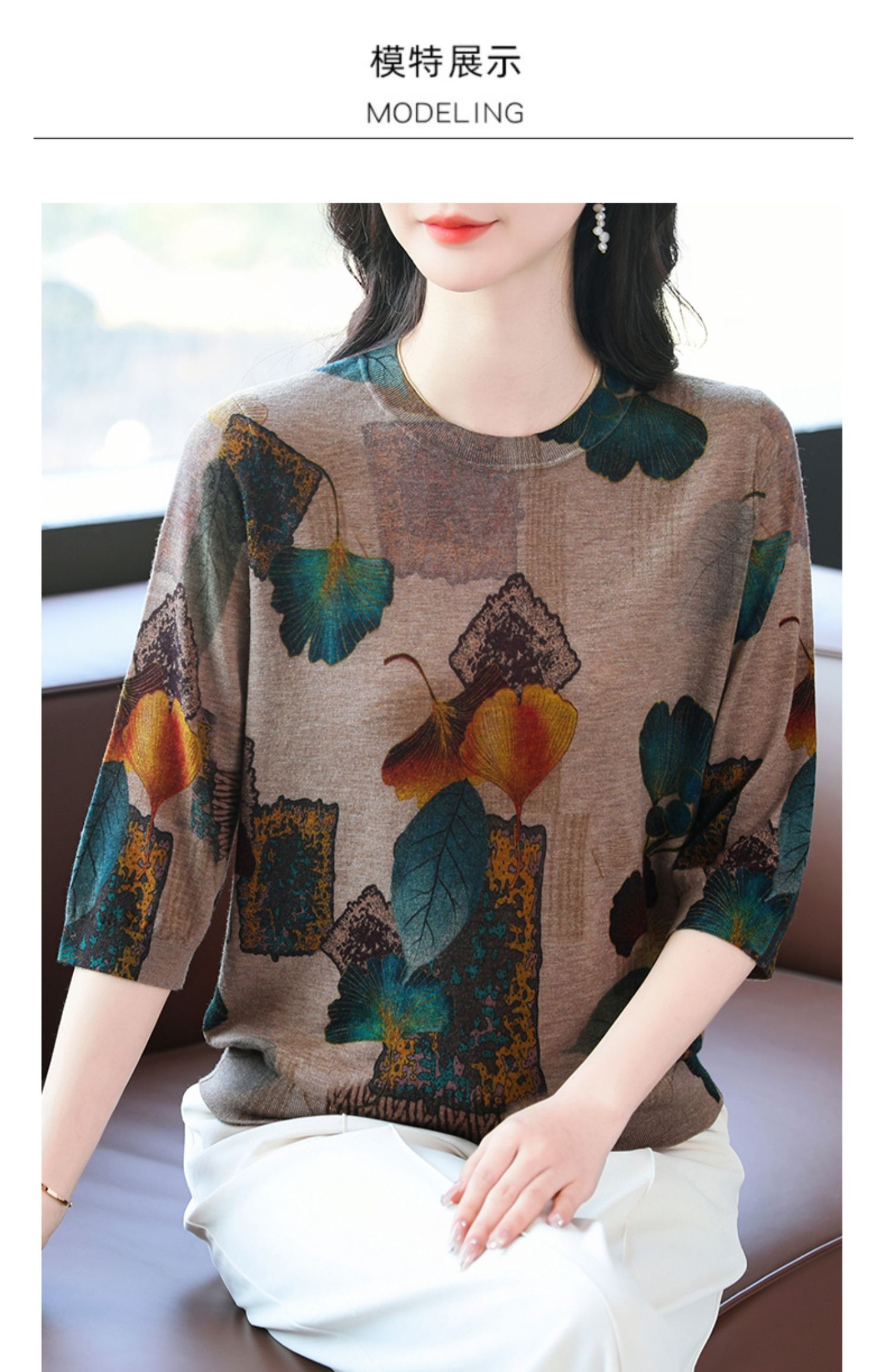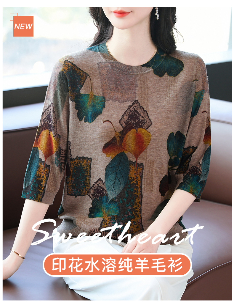 2025春季新款圓領七分袖薄款水溶羊毛打底上衣女媽媽寬松印花毛衣