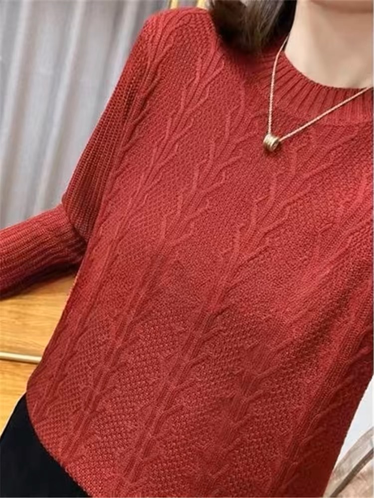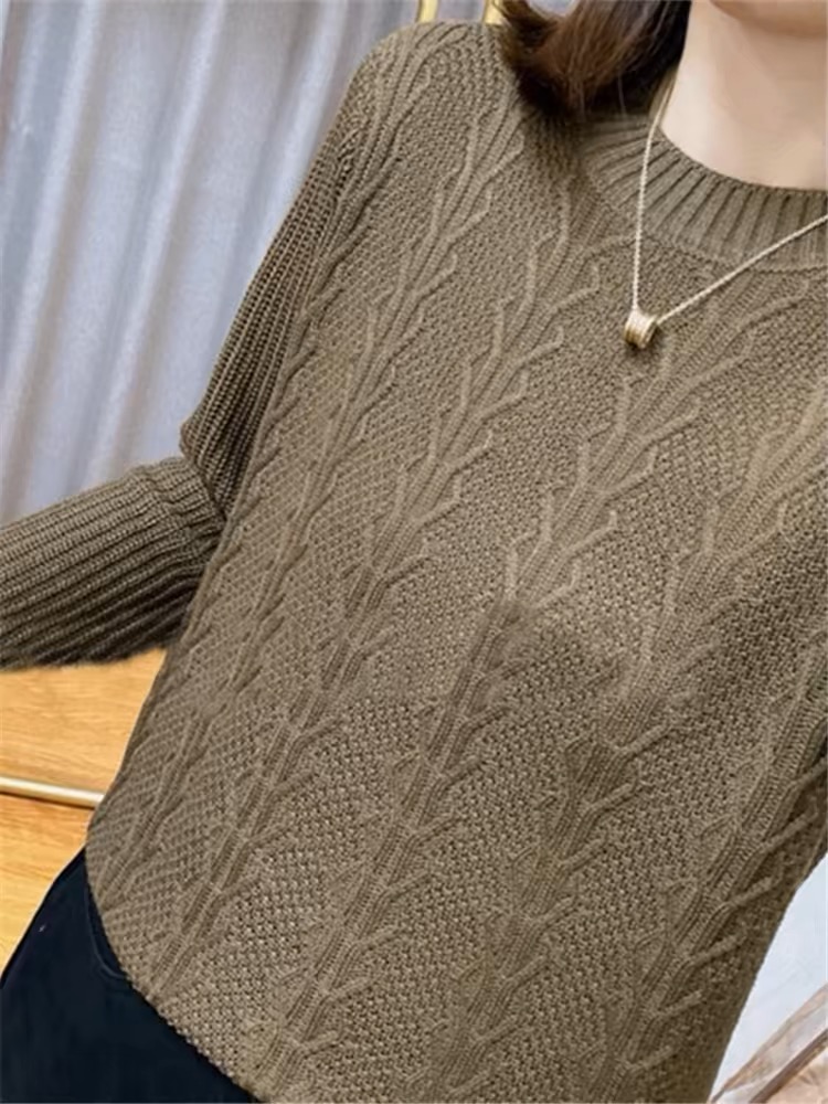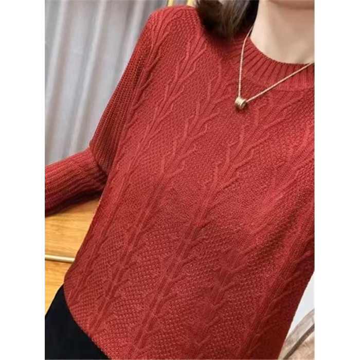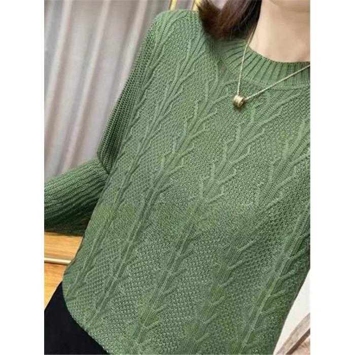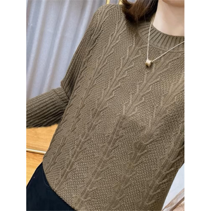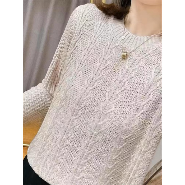 春秋裝內搭圓領提花純色棉線針織衫女復古寬松長袖薄款打底衫毛衣