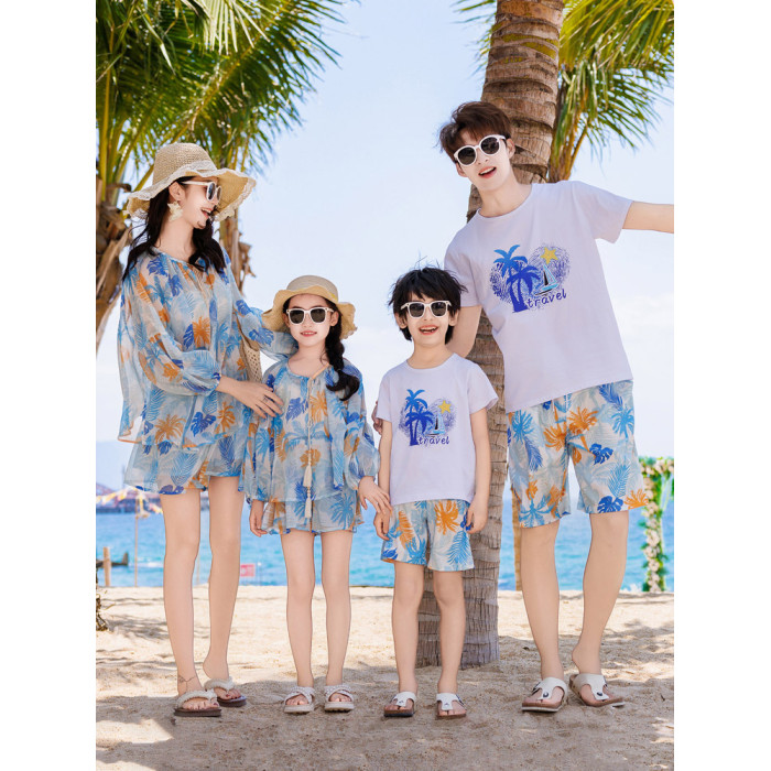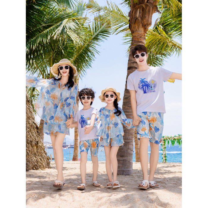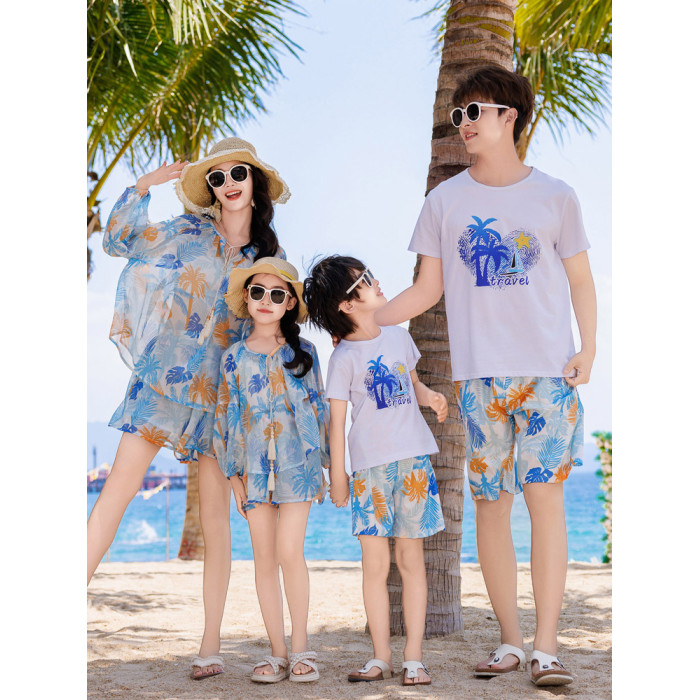 親子裝一家三口夏四口海邊沙灘度假出遊短袖T恤襯衫套裝夏季母女