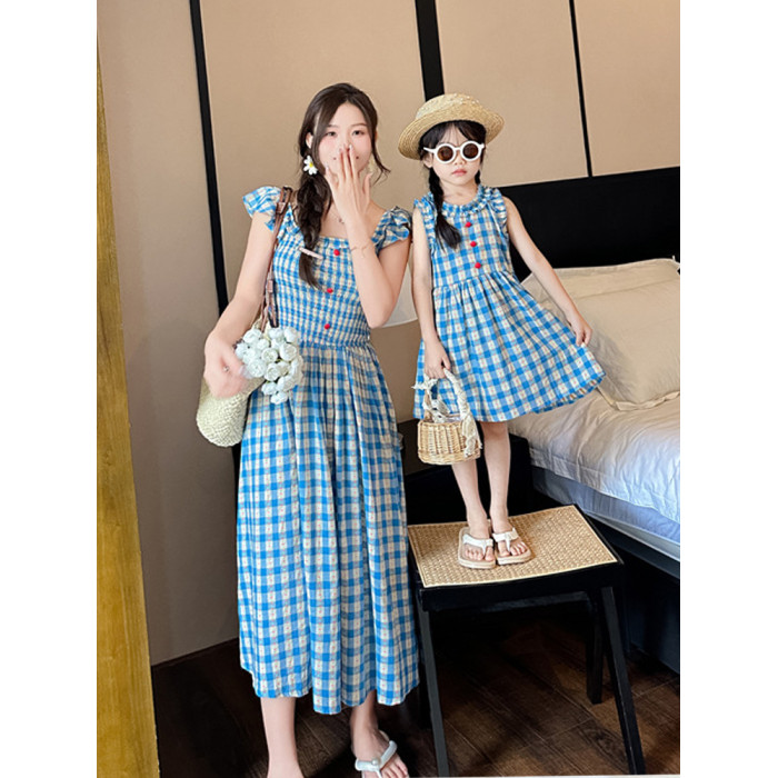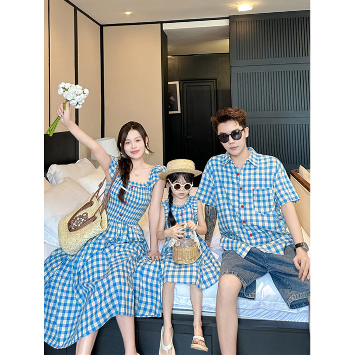 海邊度假親子裝母女裝夏一家三口四口旅遊格子襯衫衣連衣裙沙灘裙
