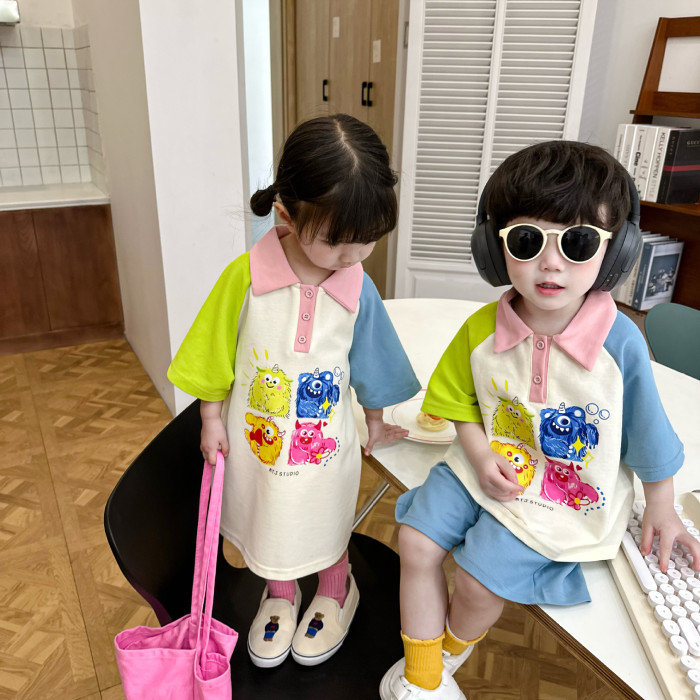 2025新款兄妹裝兒童韓版姐弟裝polo衫親子裝男女童卡通短袖套裝潮