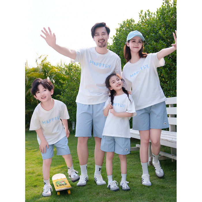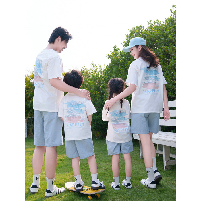 親子裝一家四口2025新款三口母女高級短袖T恤套裝海邊度假家庭裝