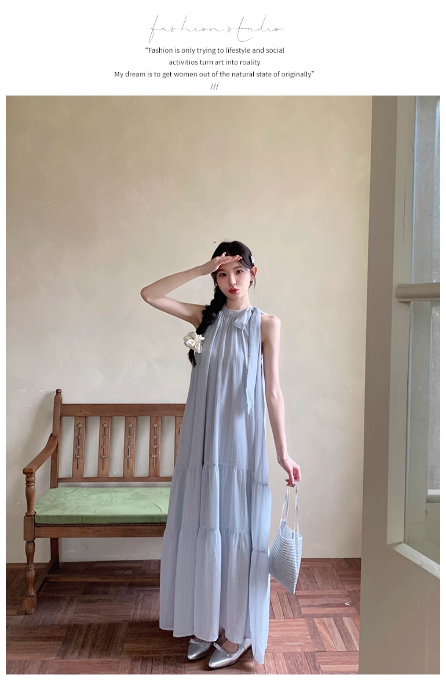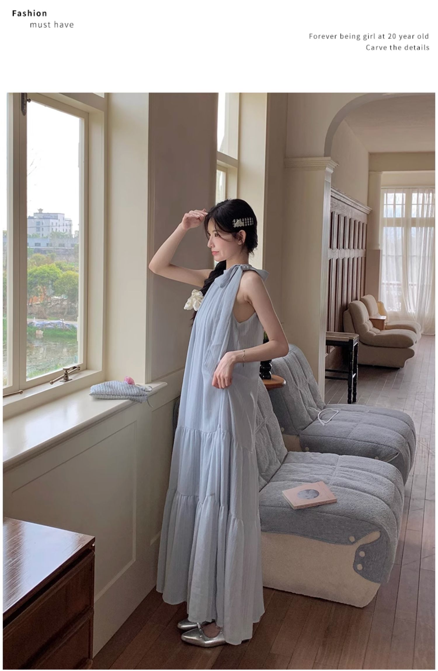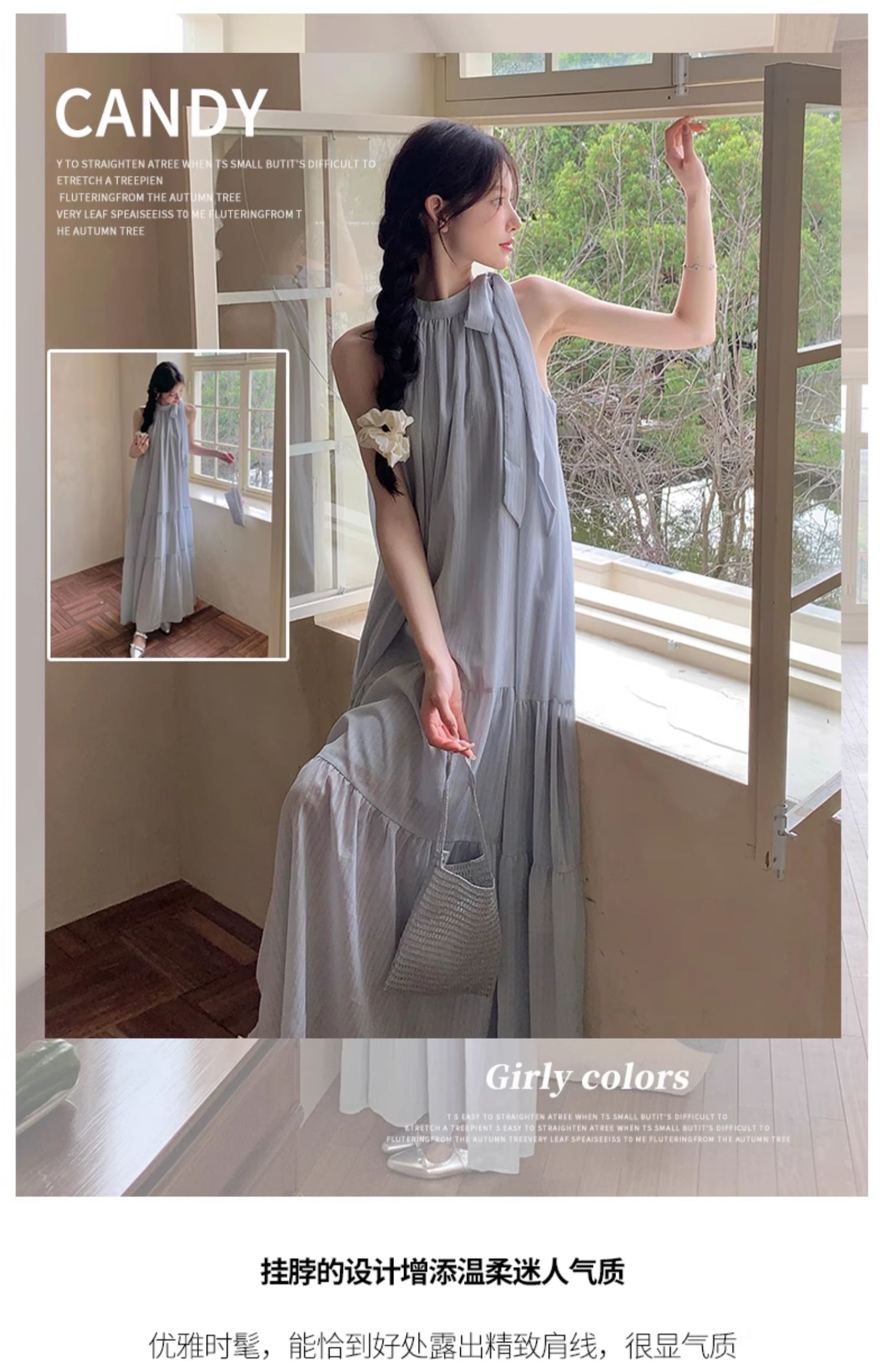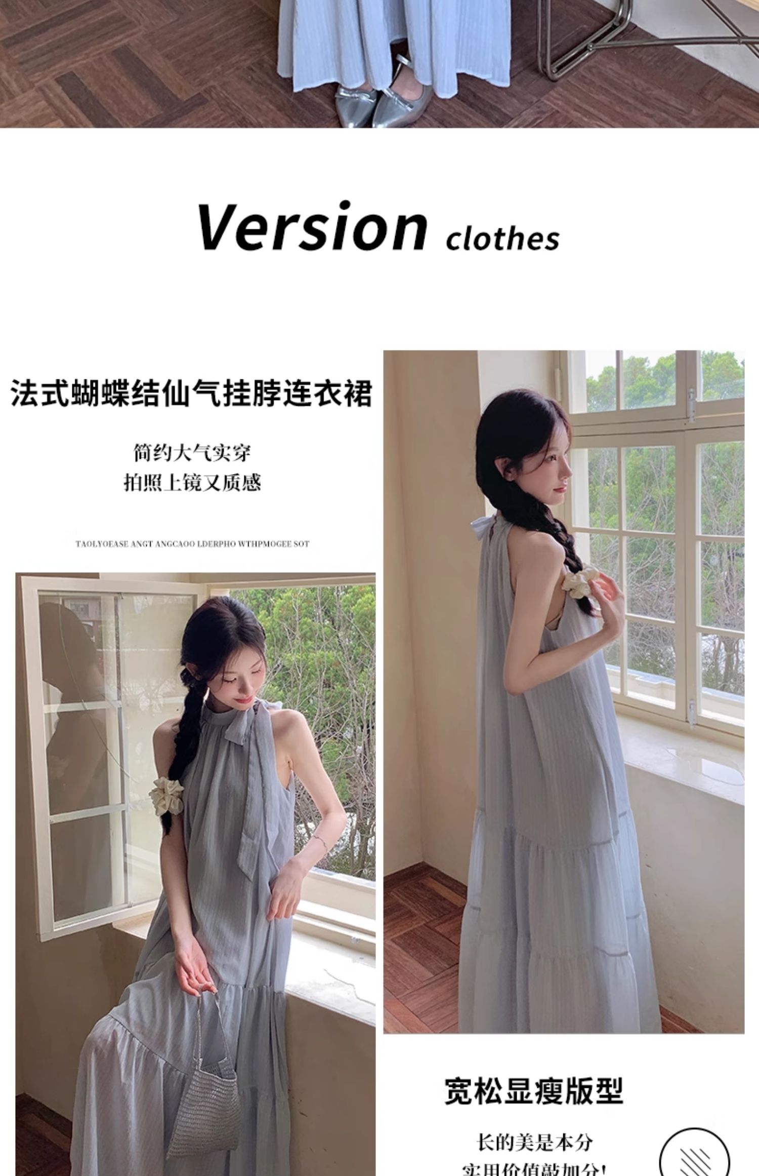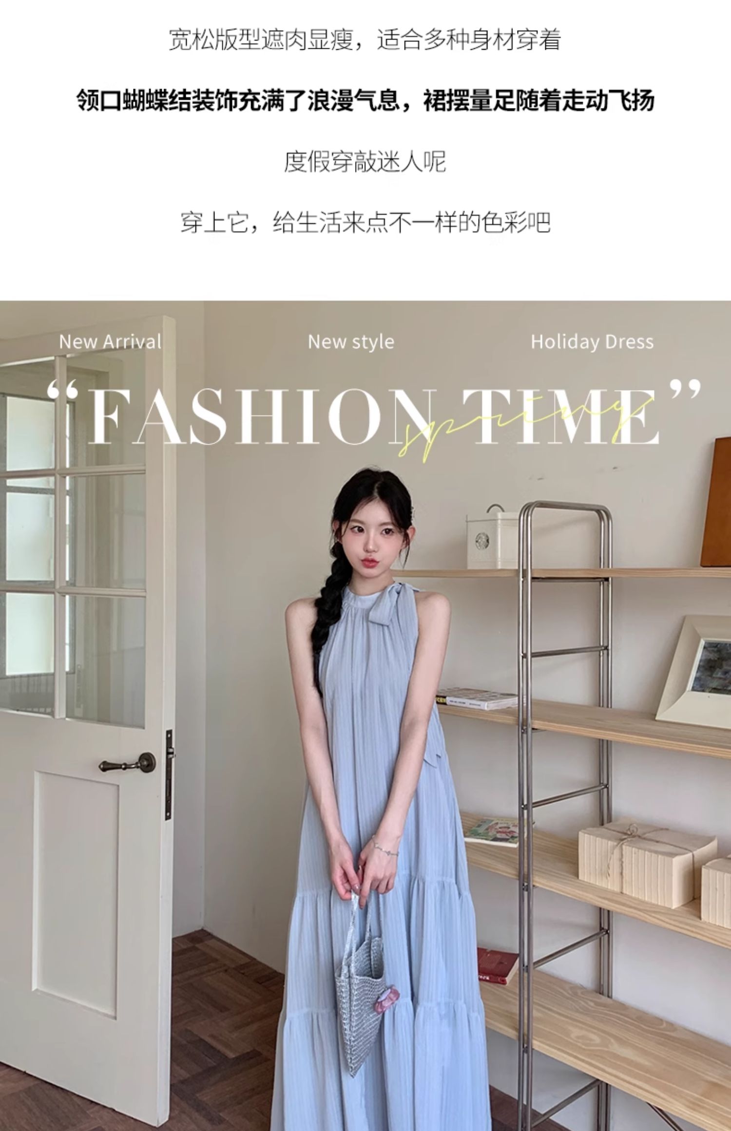 法式超仙藍色蝴蝶結掛脖連衣裙女2025夏季氣質絕美度假風露肩長裙