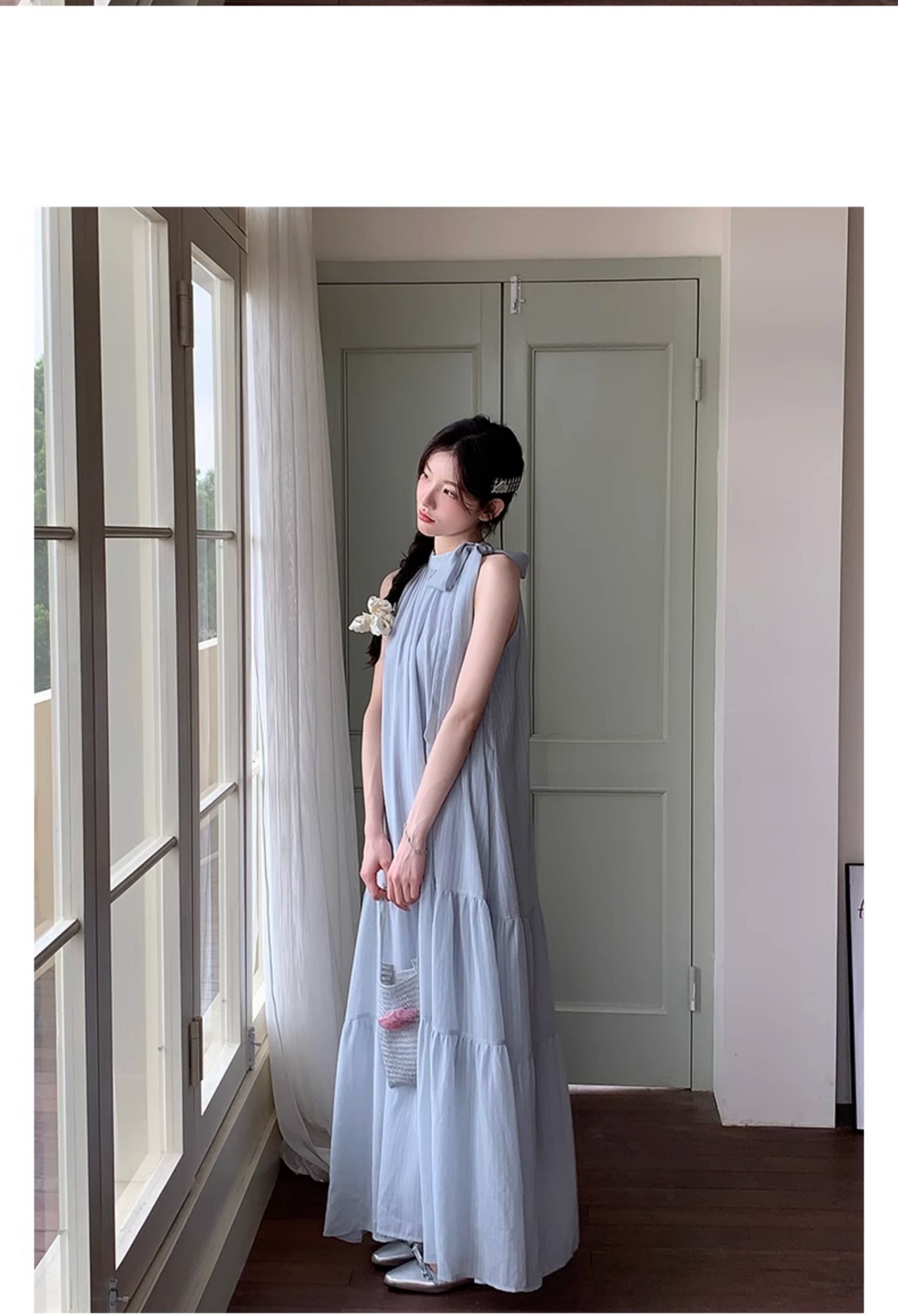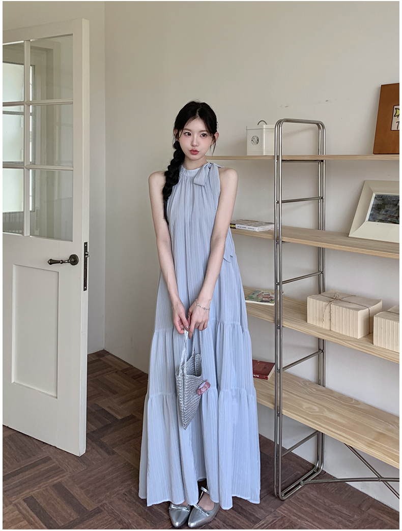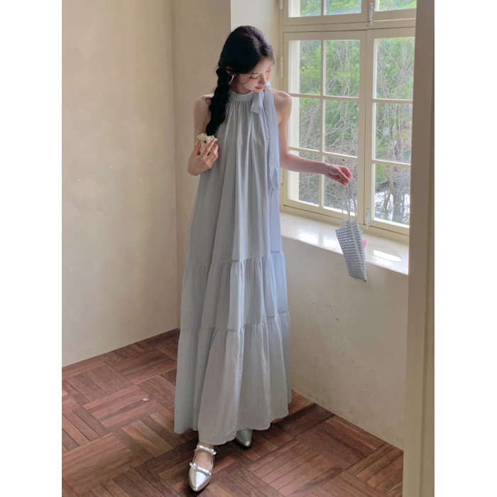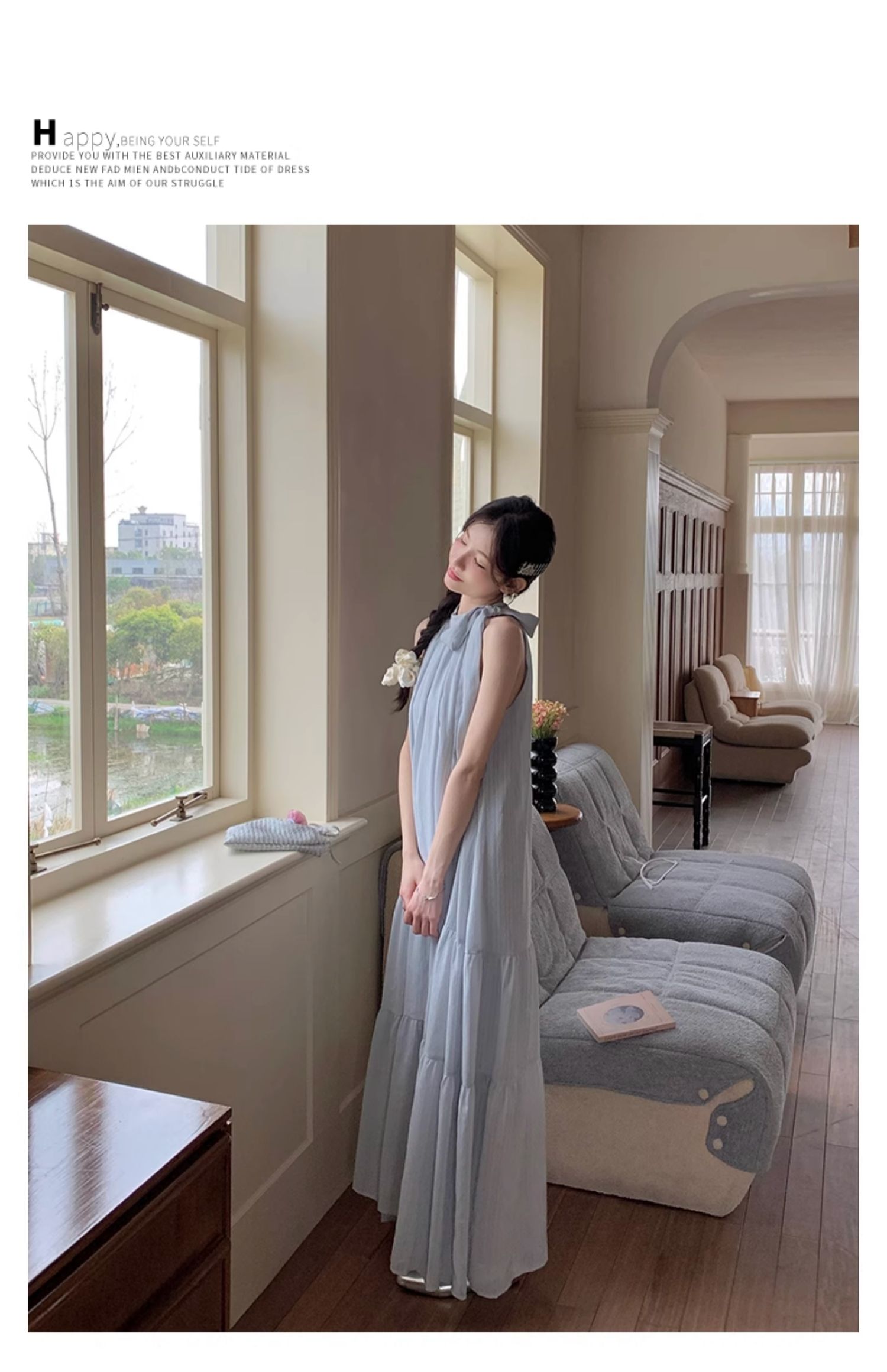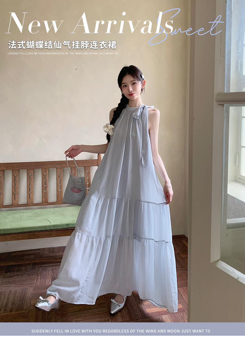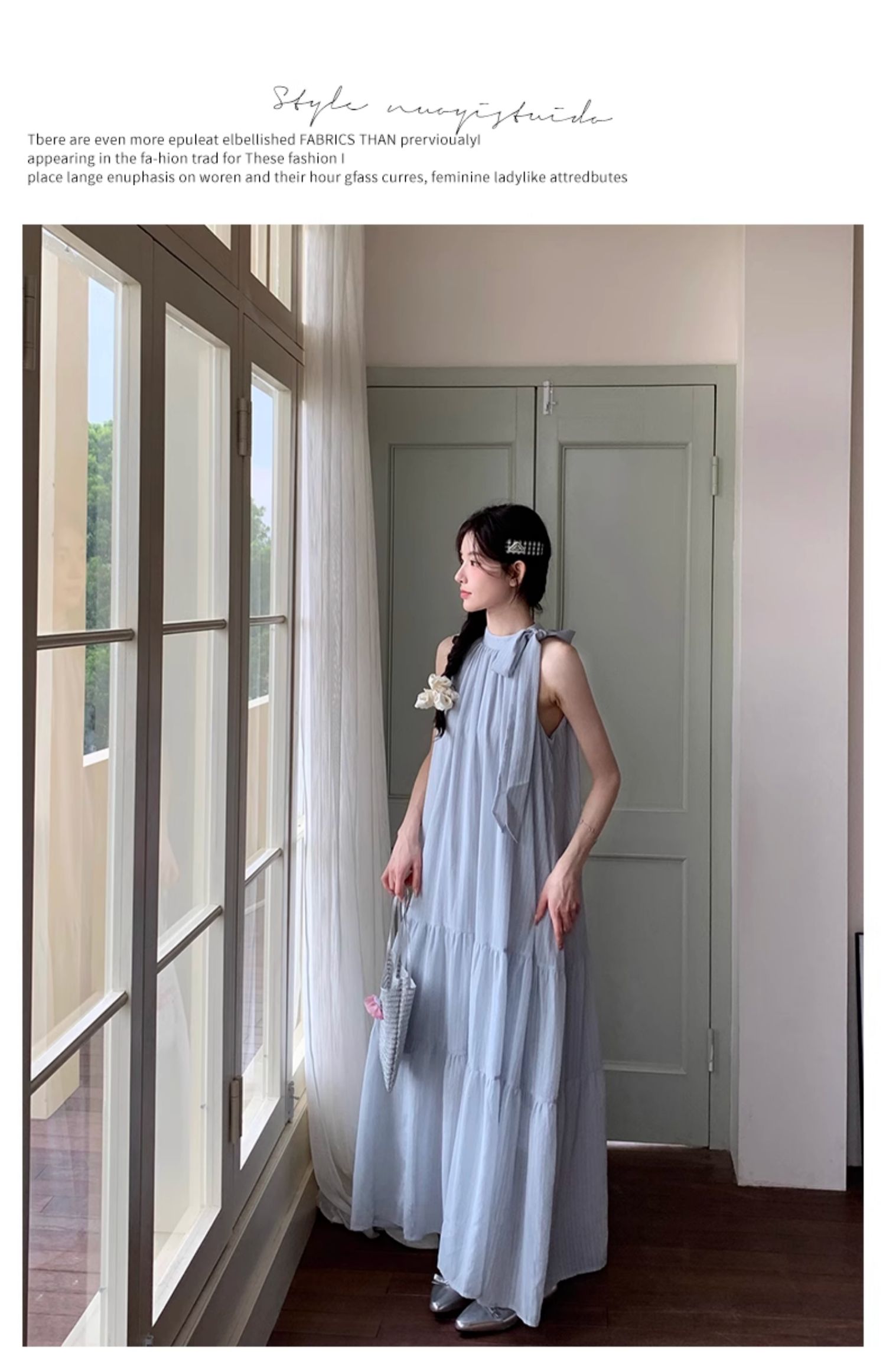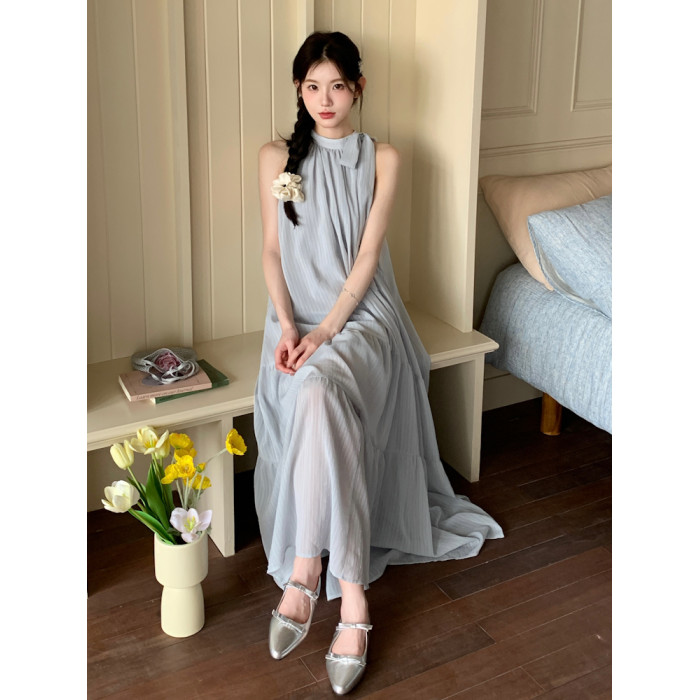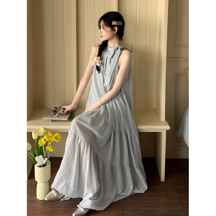 法式超仙藍色蝴蝶結掛脖連衣裙女2025夏季氣質絕美度假風露肩長裙