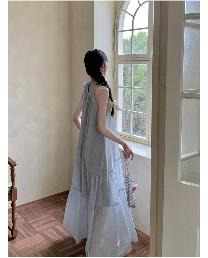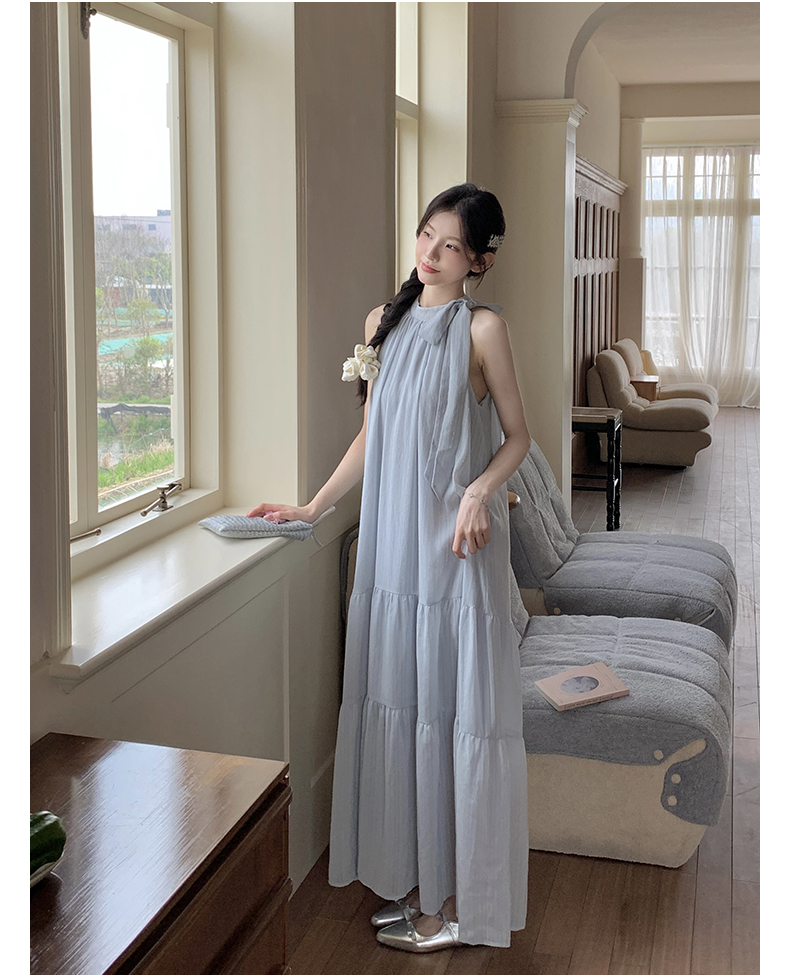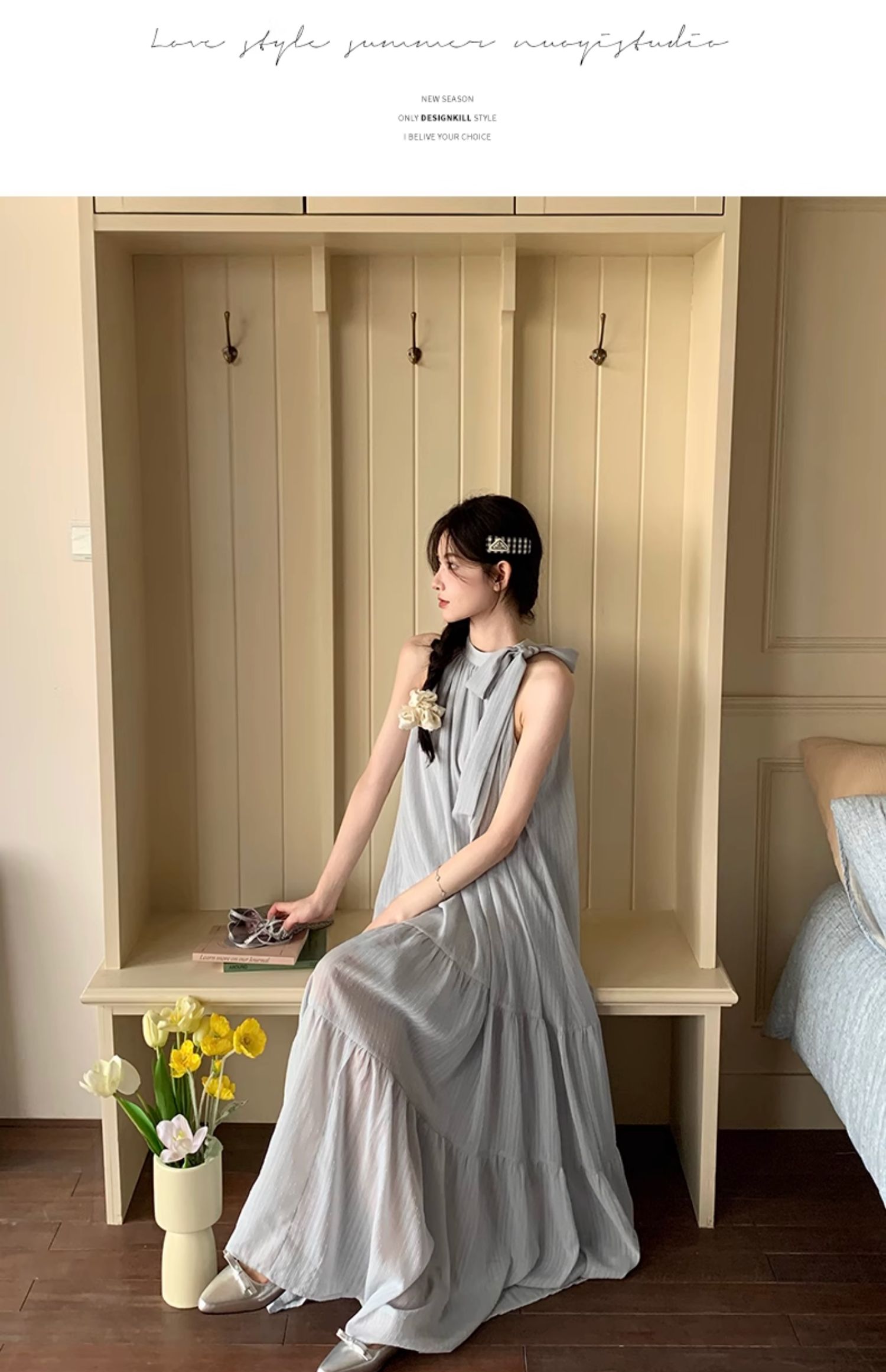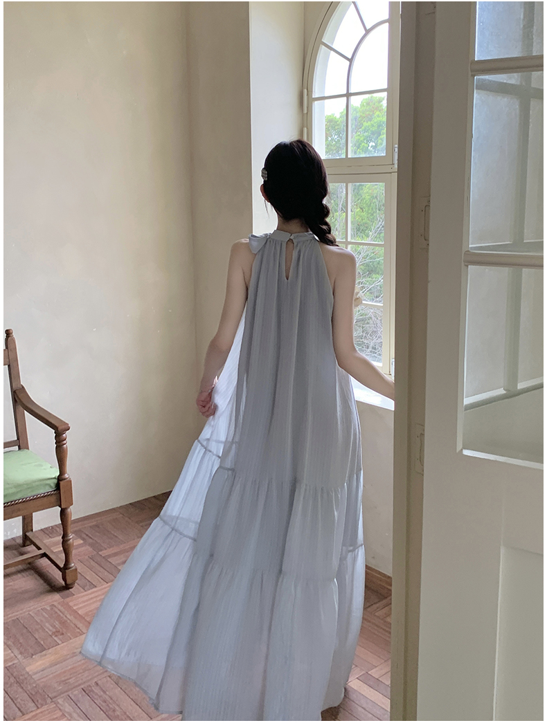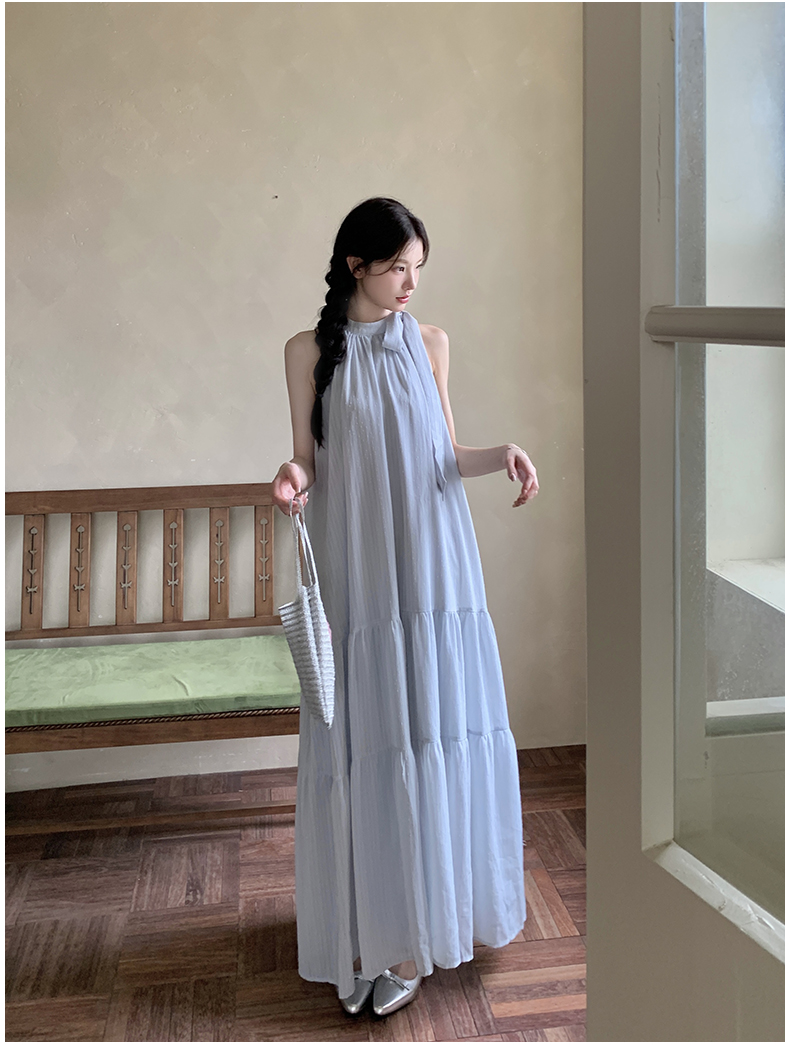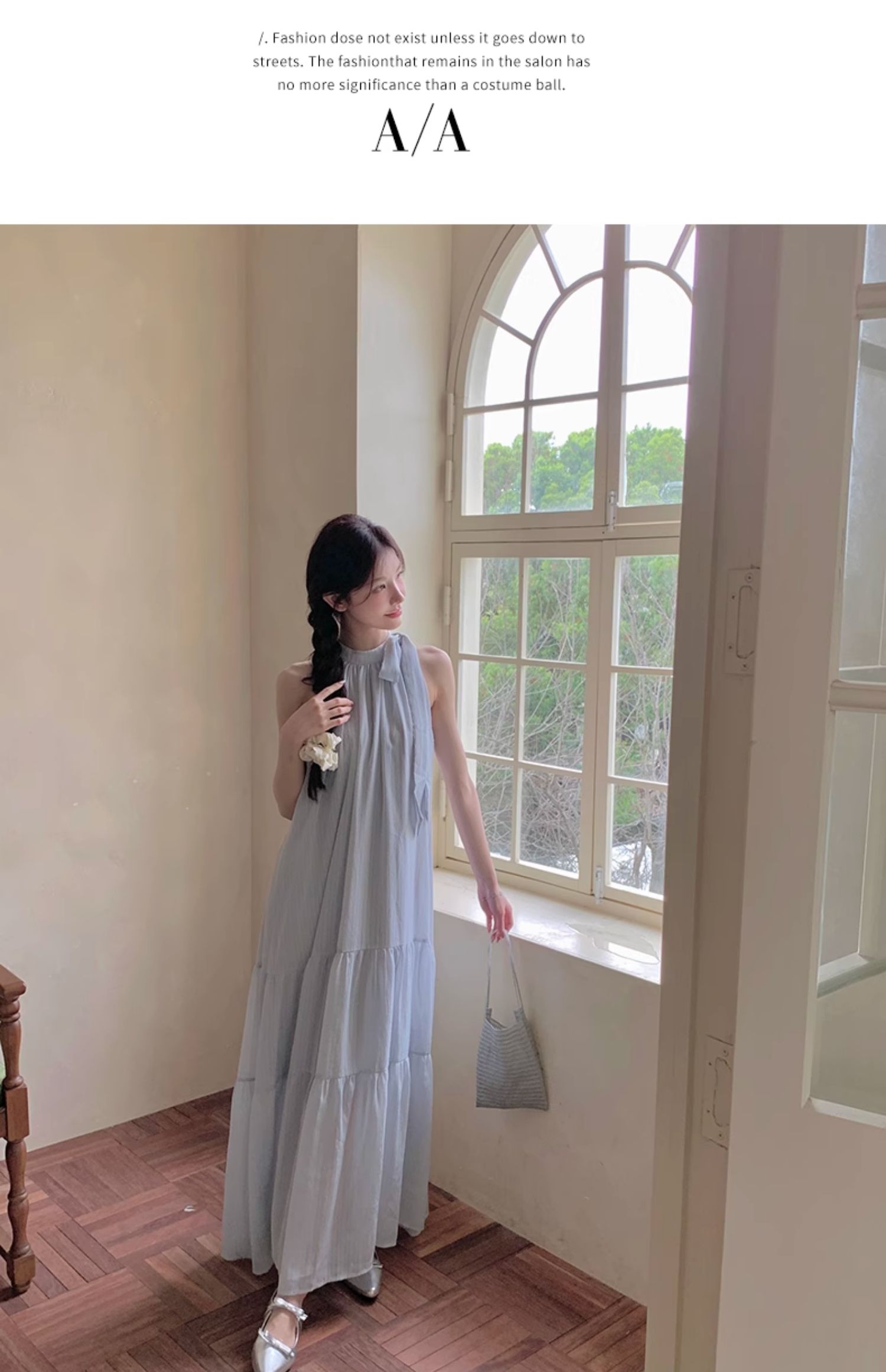 法式超仙藍色蝴蝶結掛脖連衣裙女2025夏季氣質絕美度假風露肩長裙