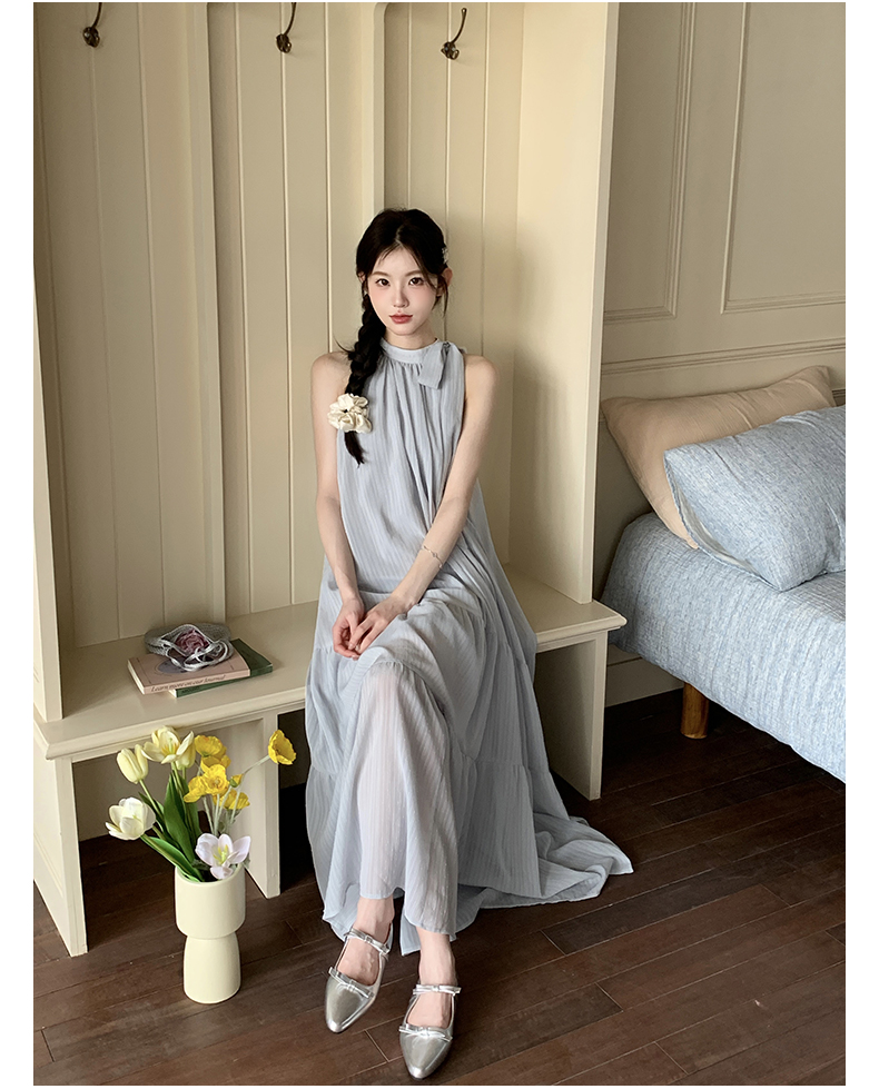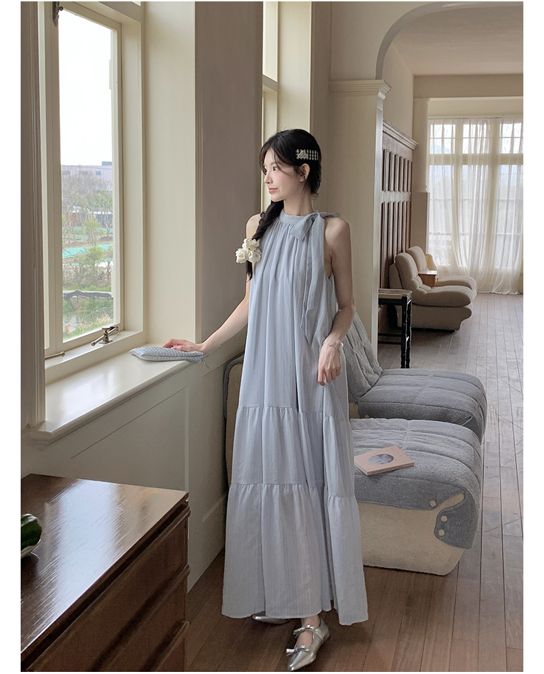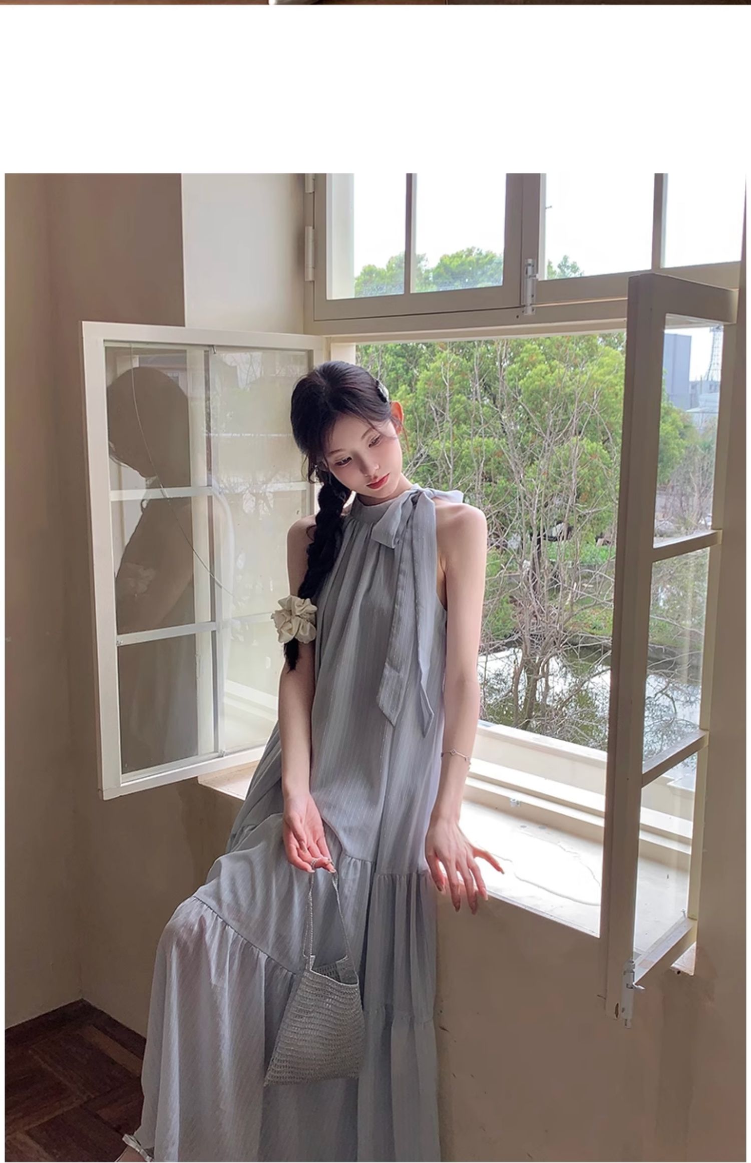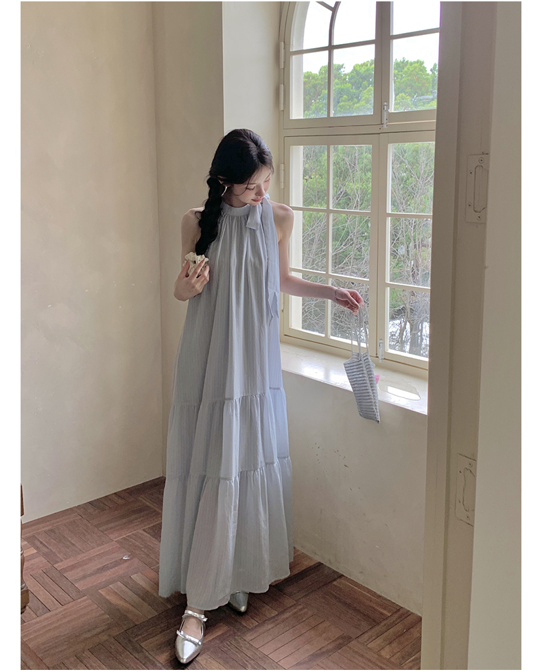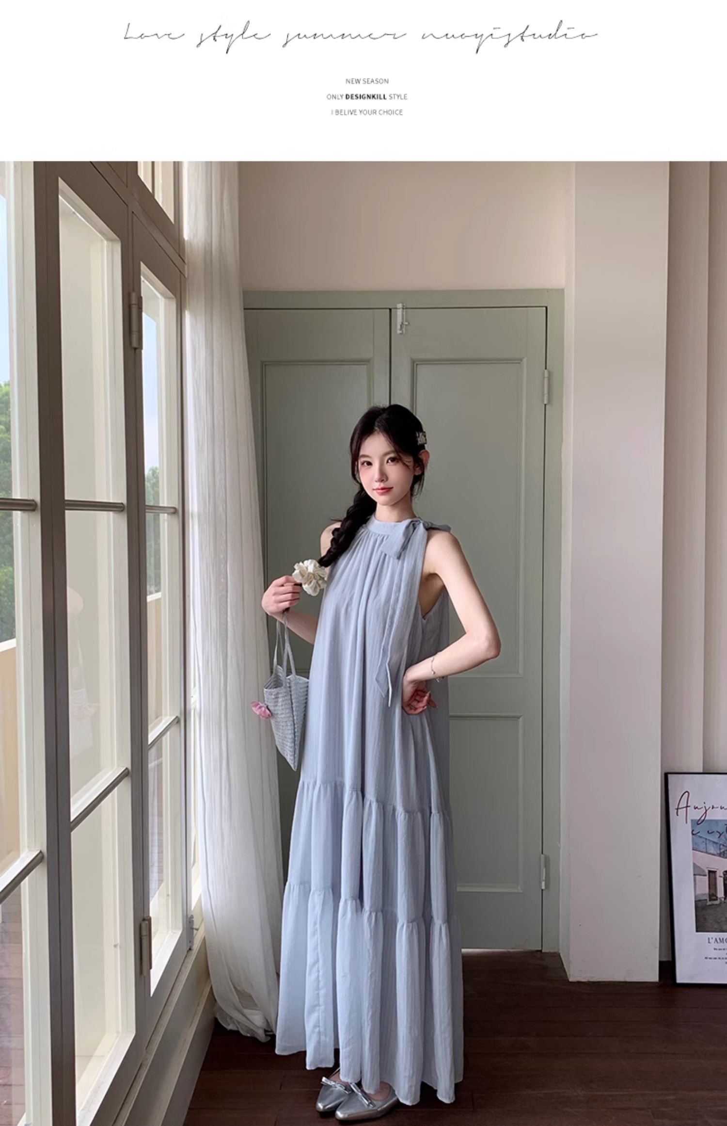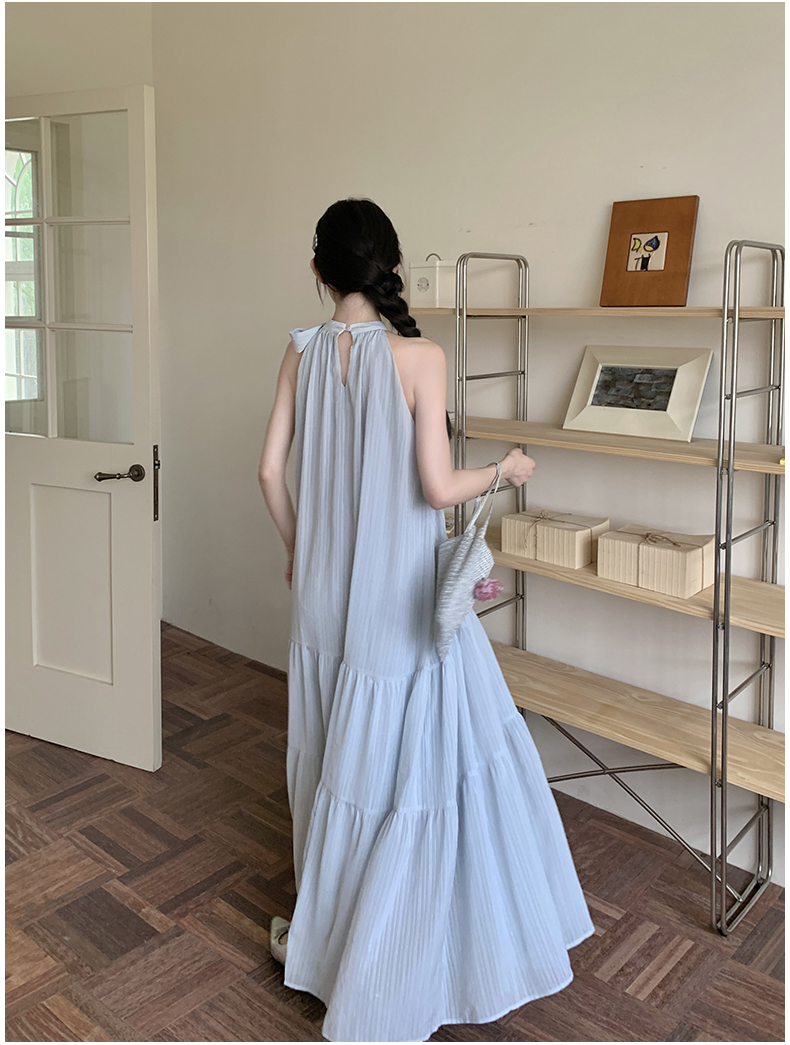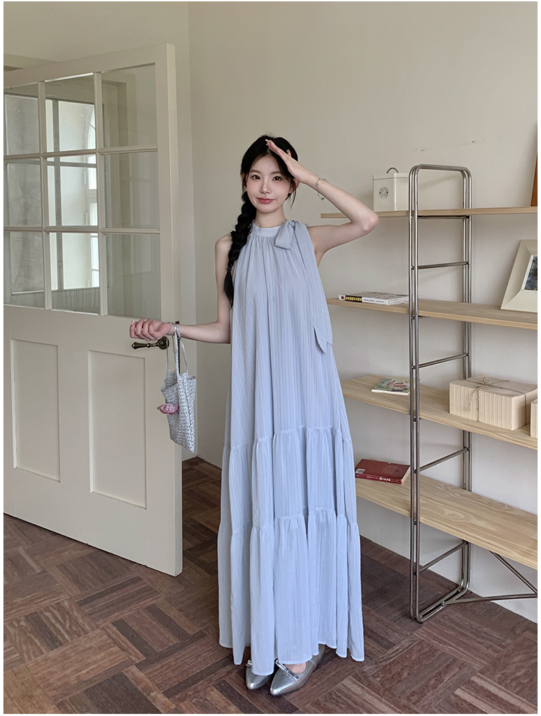 法式超仙藍色蝴蝶結掛脖連衣裙女2025夏季氣質絕美度假風露肩長裙