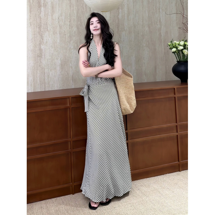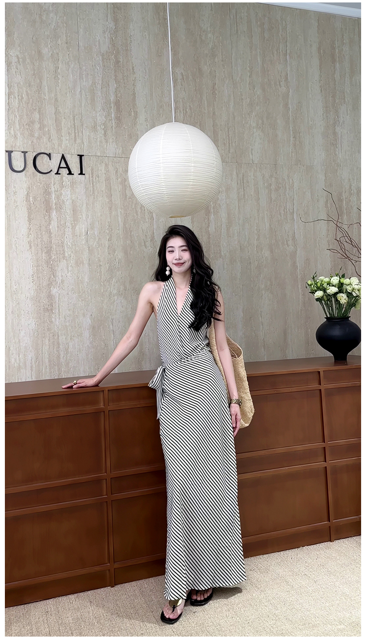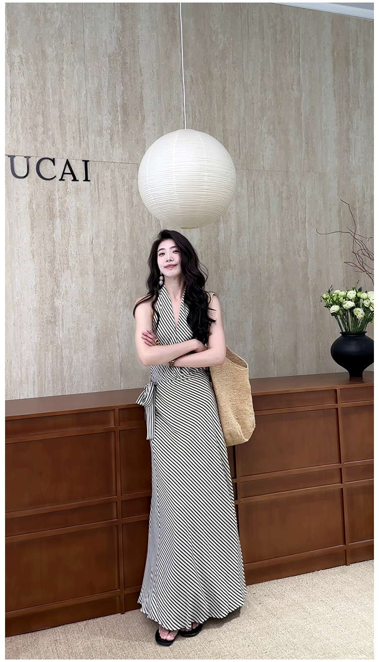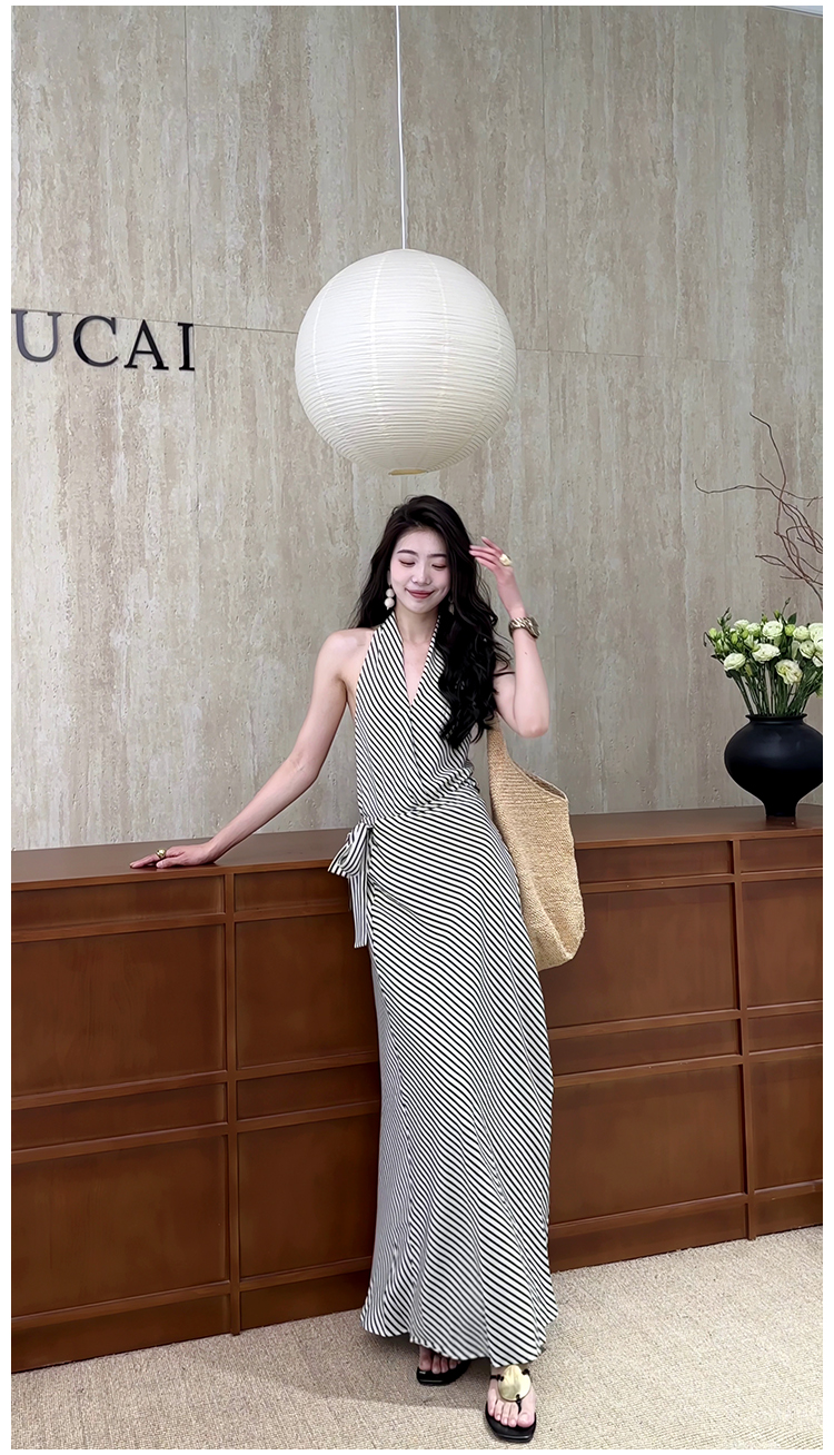 法式復古條紋掛脖無袖收腰連衣裙2025夏季新款高腰顯瘦A字長裙女
