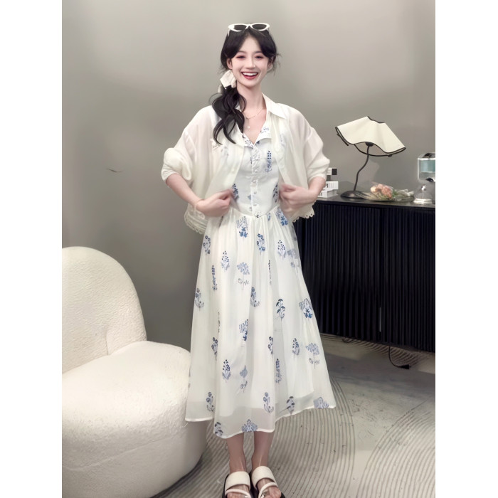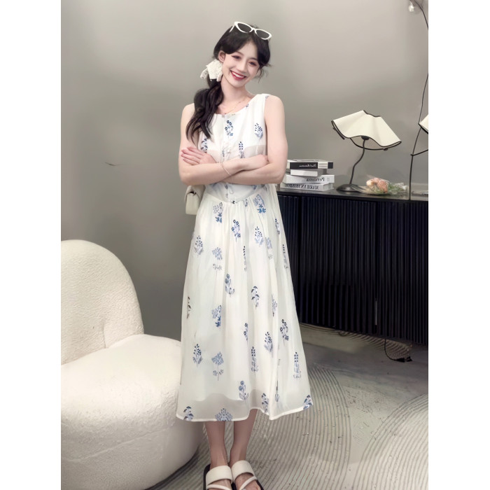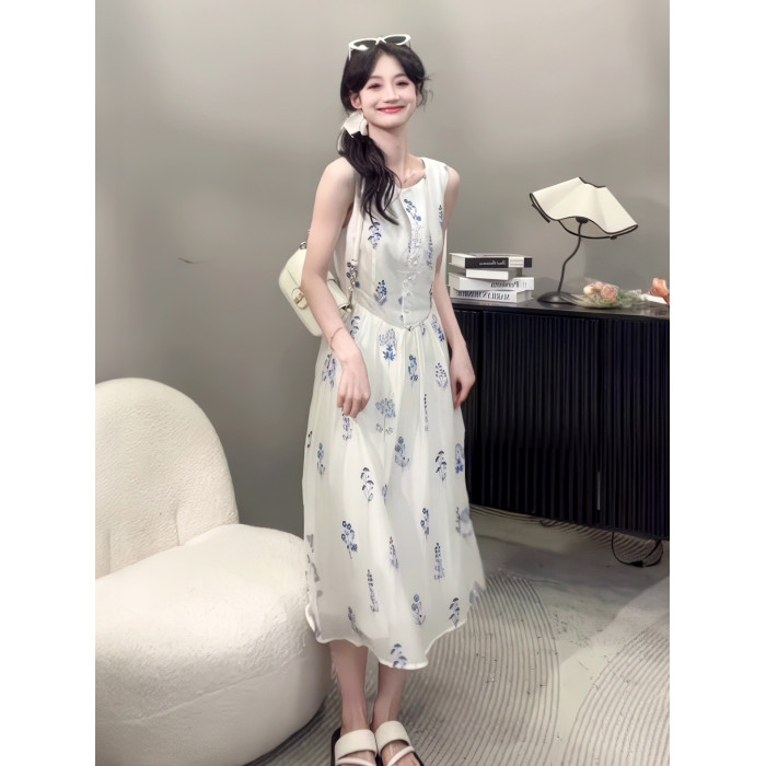 2025夏季新款法式氣質高級感白色碎花無袖連衣裙女收腰顯瘦長裙子