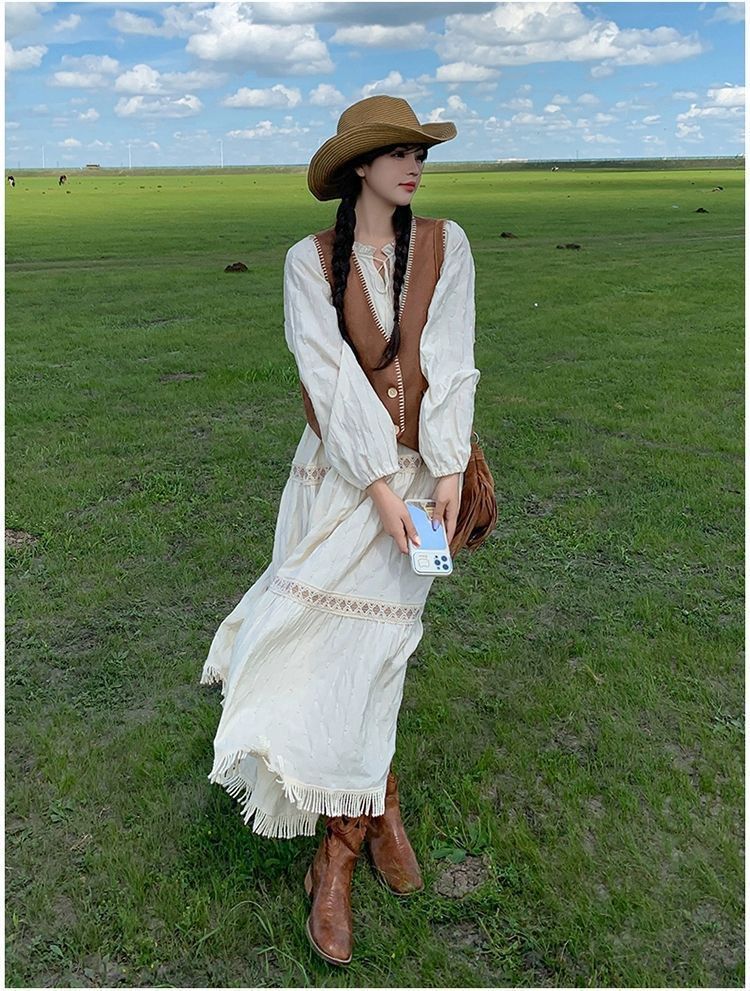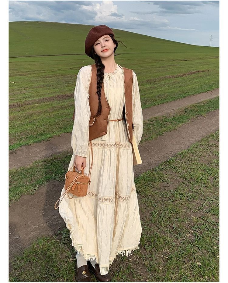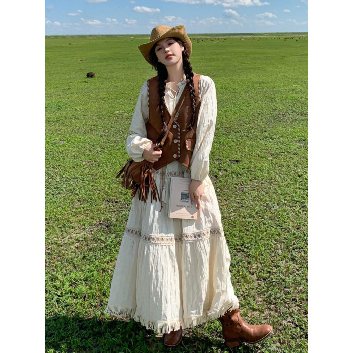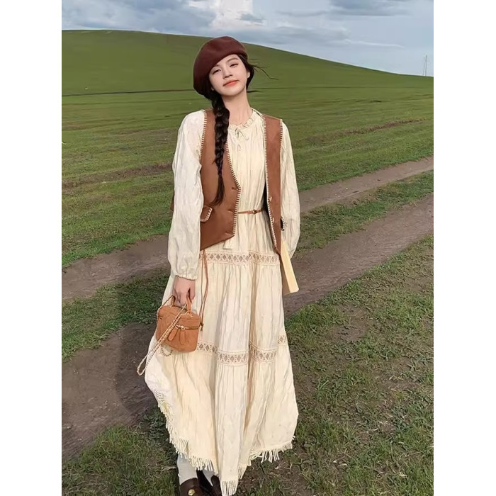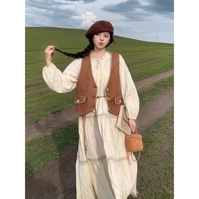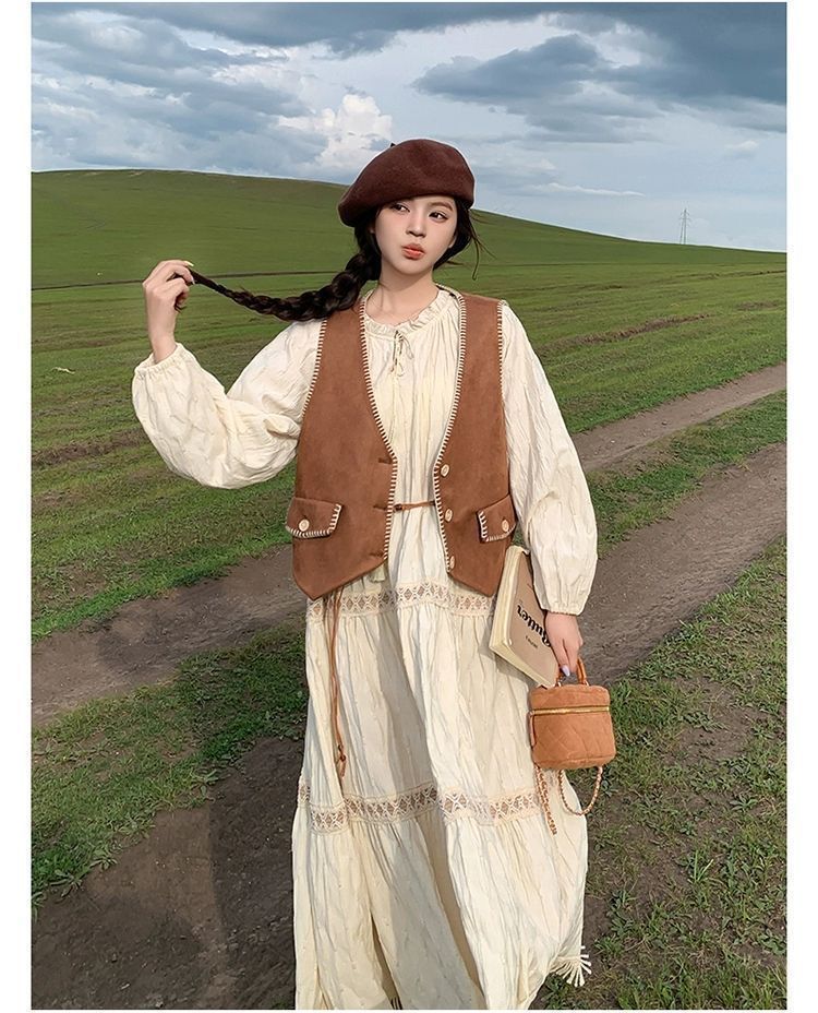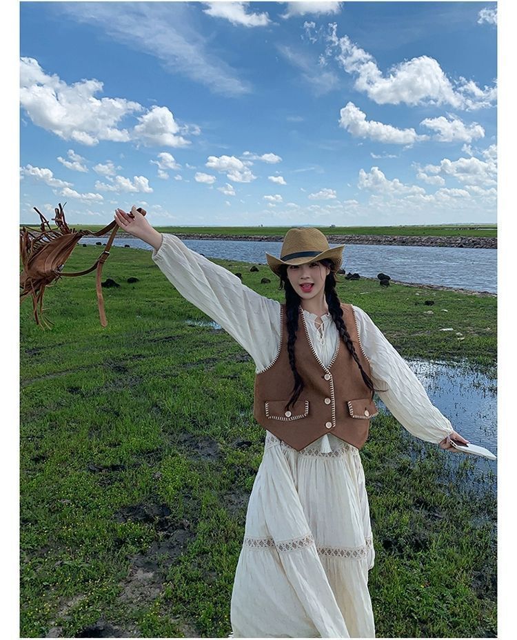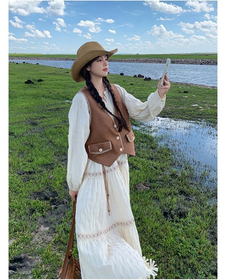 新疆草原川西旅遊度假穿搭美拉德馬甲長裙子白色連衣裙套裝女夏季