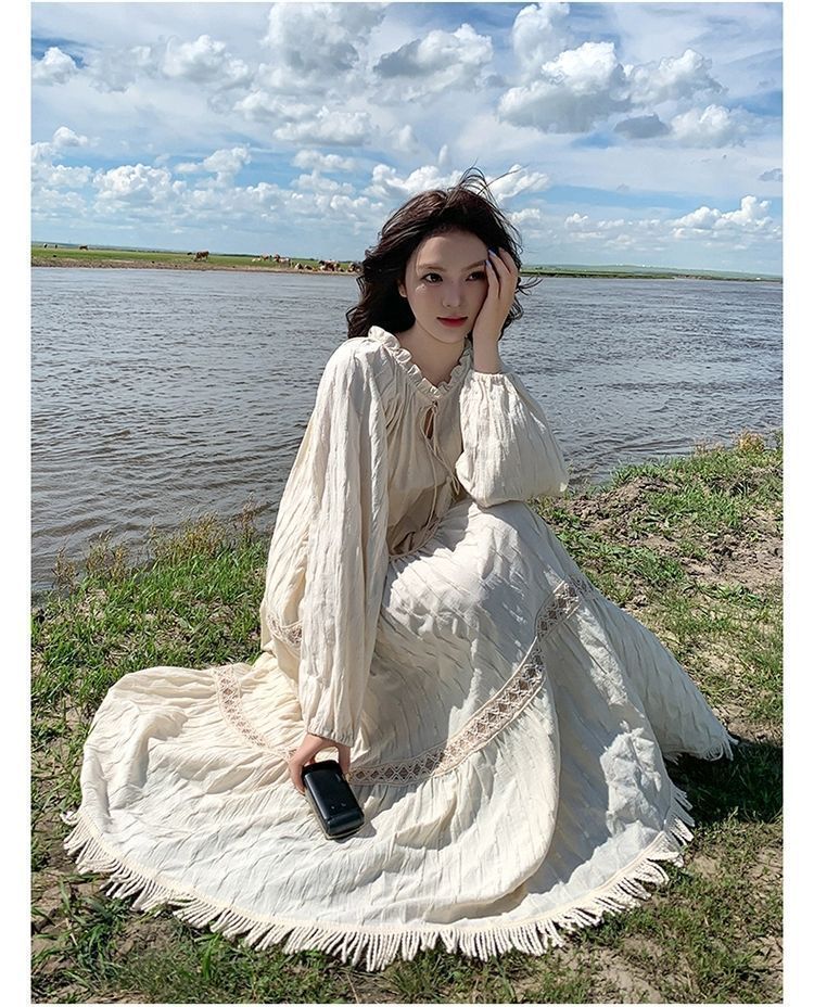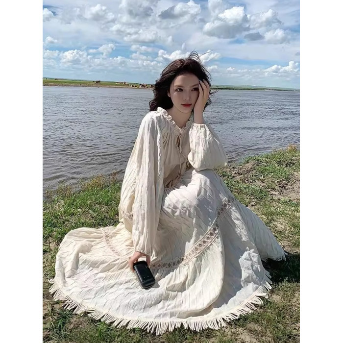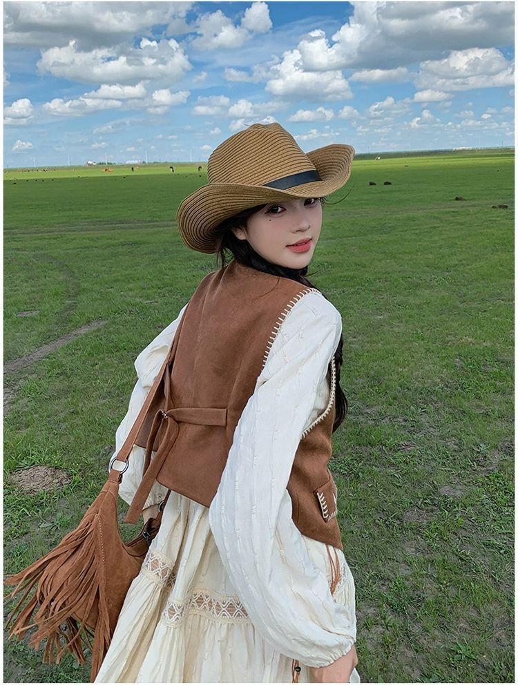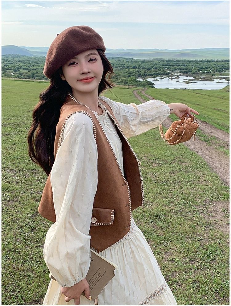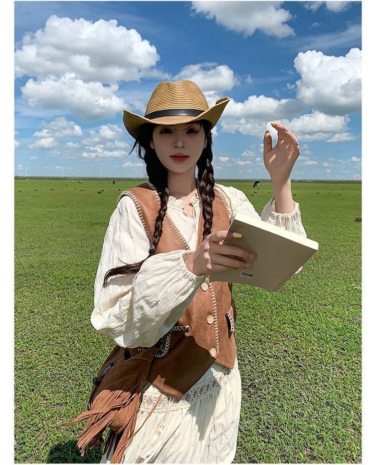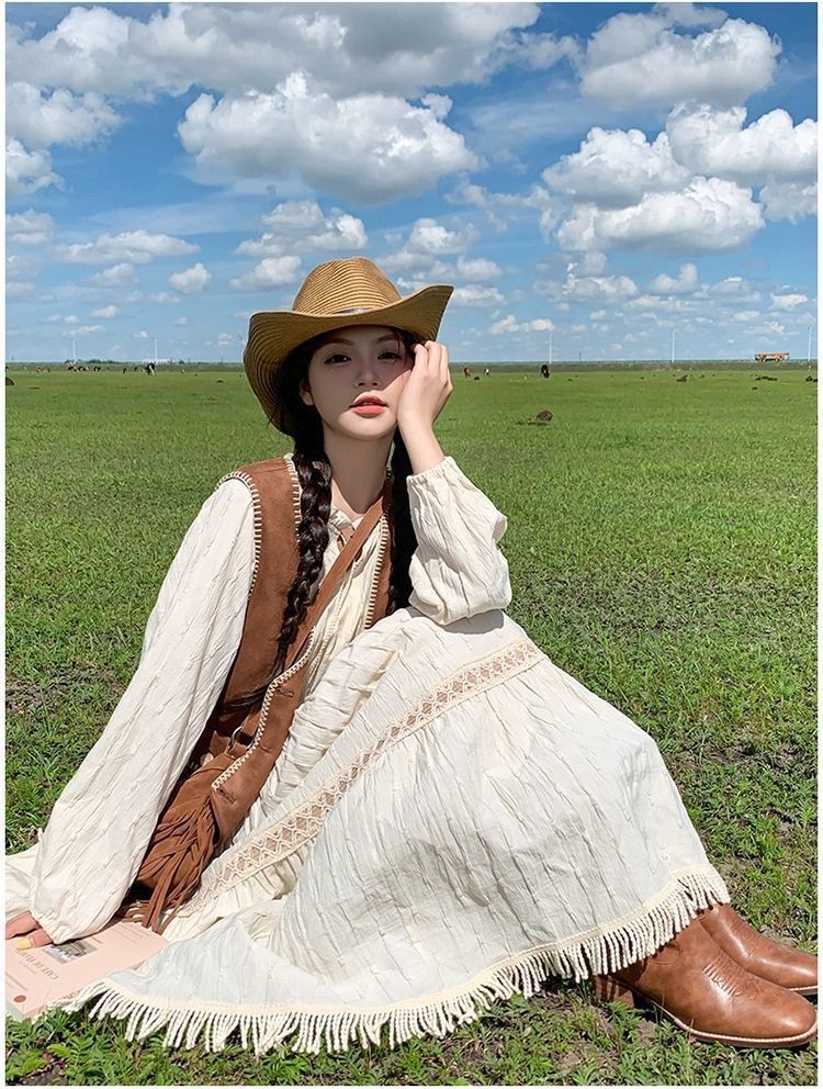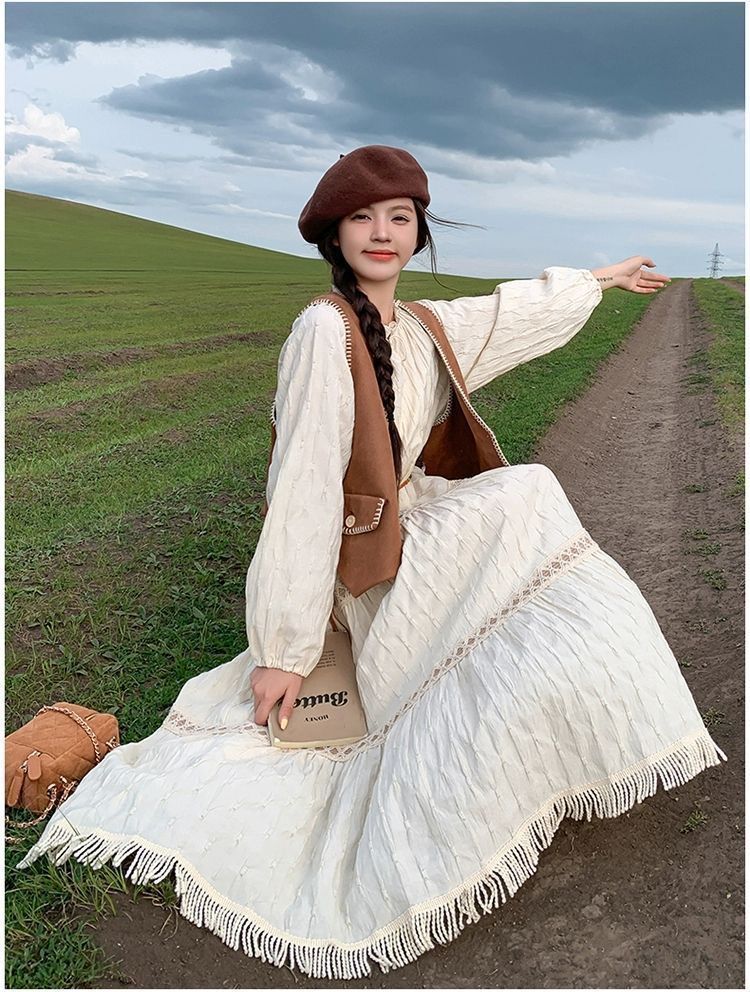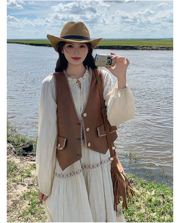新疆草原川西旅遊度假穿搭美拉德馬甲長裙子白色連衣裙套裝女夏季