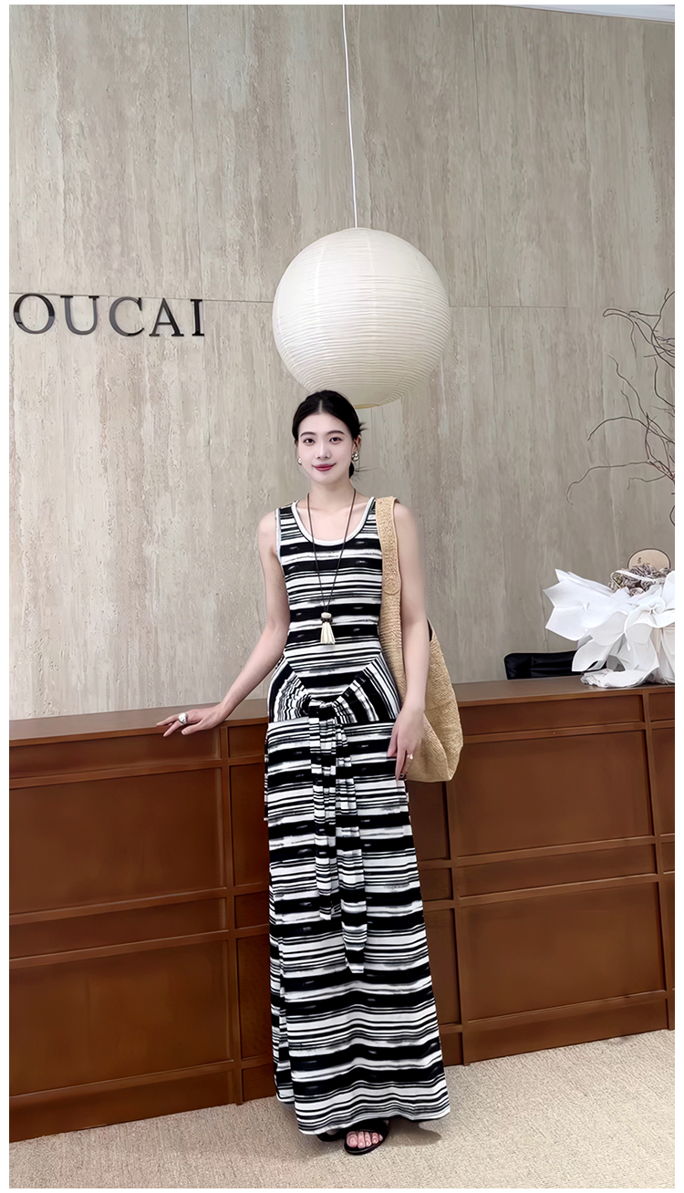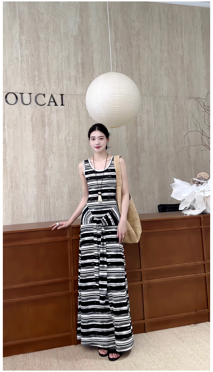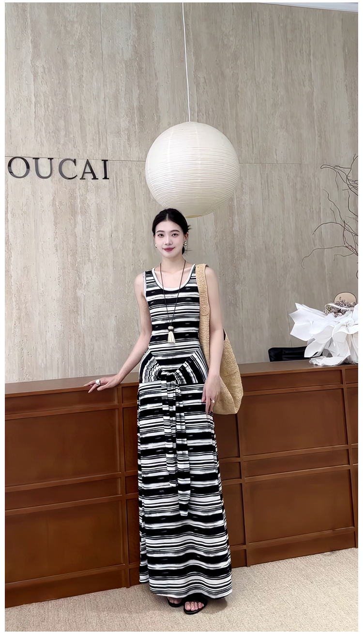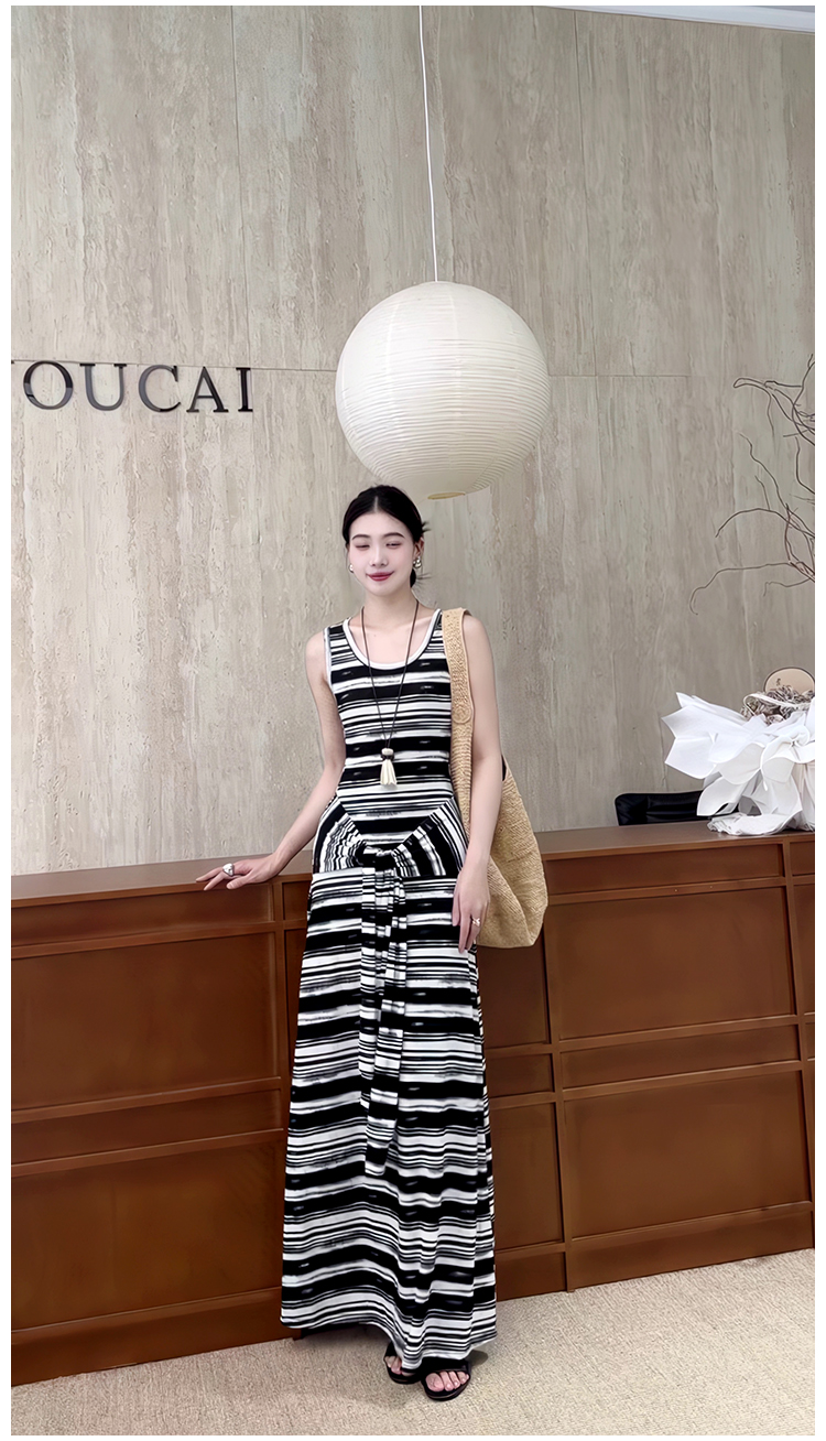 松弛美式*假兩件條紋綁帶背心裙黑白撞色長款度假連衣裙夏季新款