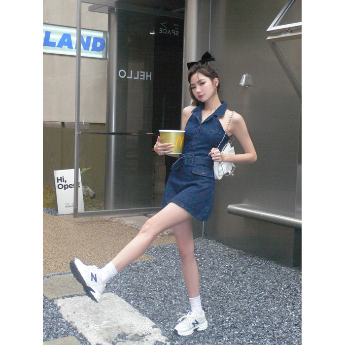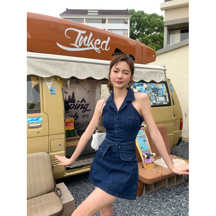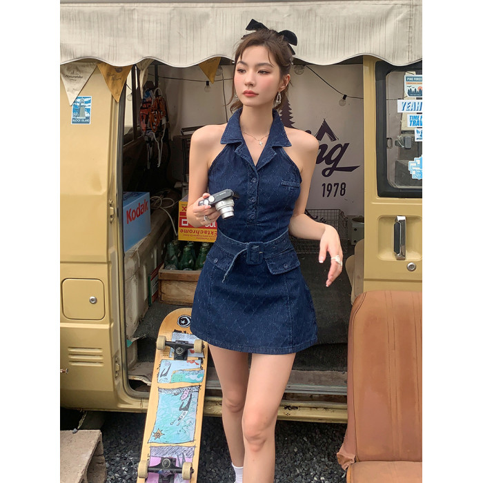 美式2025春夏新款ins網紅辣妹無袖polo領牛仔連衣裙女a字收腰短裙