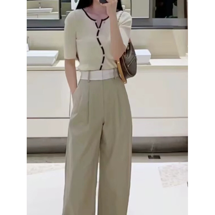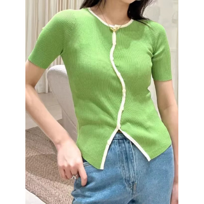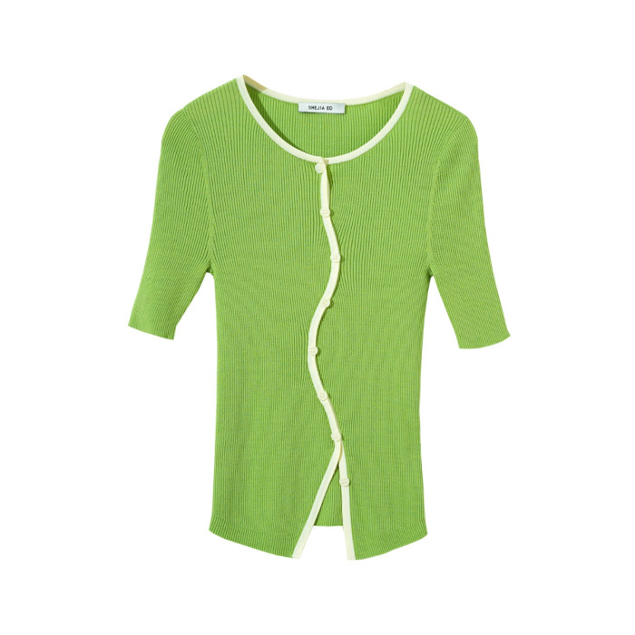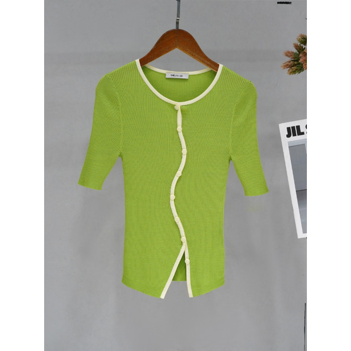 SHEJIA ED不規則門襟撞色邊針織衫短袖上衣夏新款薄款顯瘦打底衫