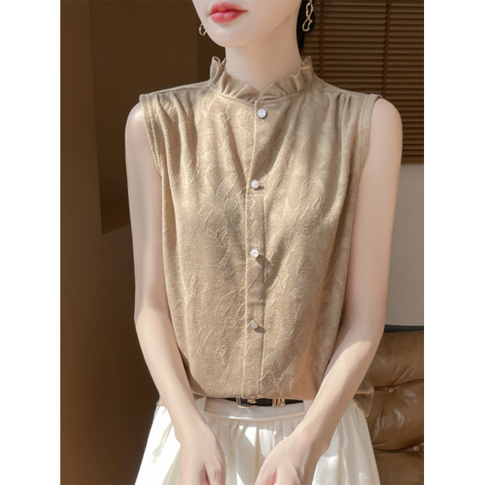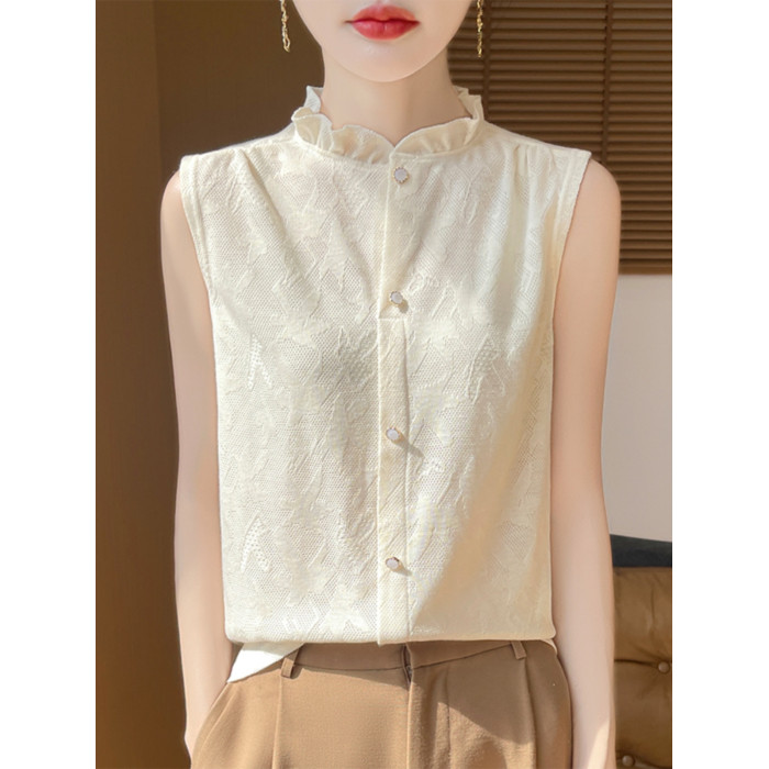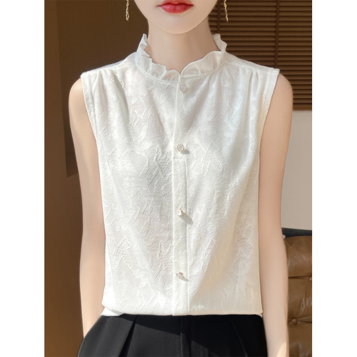 聲雨竹2025法式無袖夏季新款木耳邊打底衫女寬松春秋內搭荷葉領高