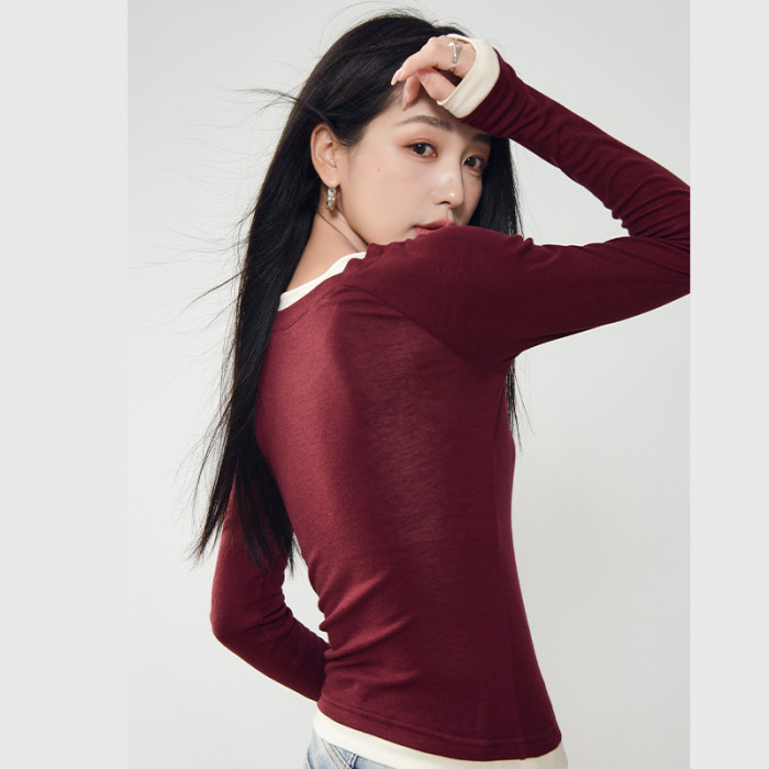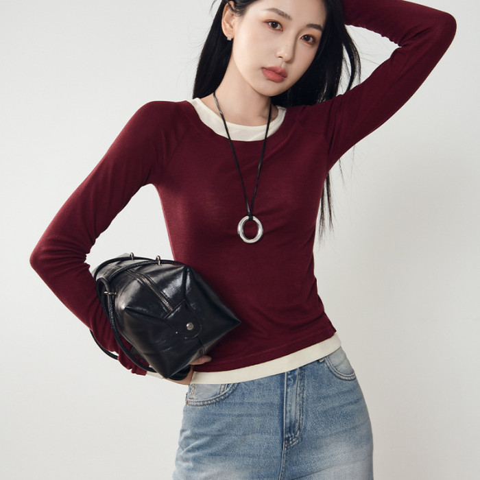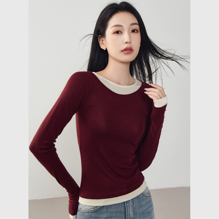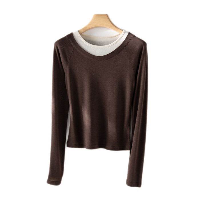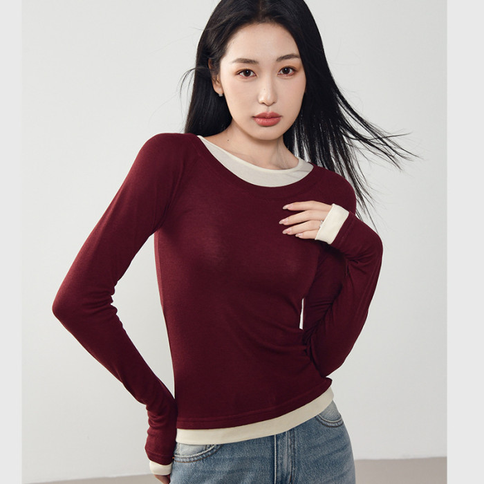 TB學院風!秋季圓領天絲羊毛假兩件長袖打底衫設計感內搭針織衫
